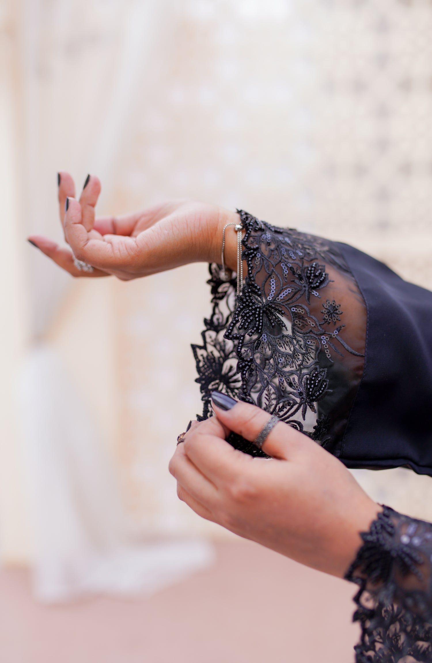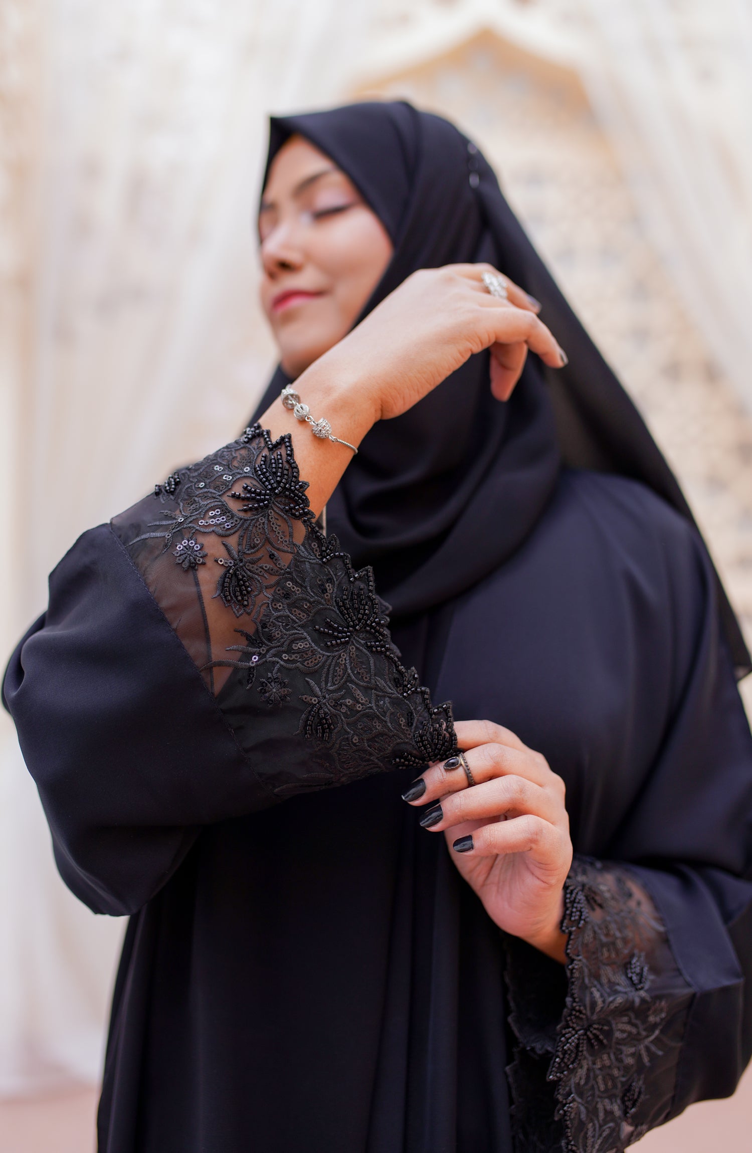 An ideal elegant abaya for all your upcoming events with beautiful beads detailing on the sleeves to give the subtle yet classy look. Stud openers allow easy opening.