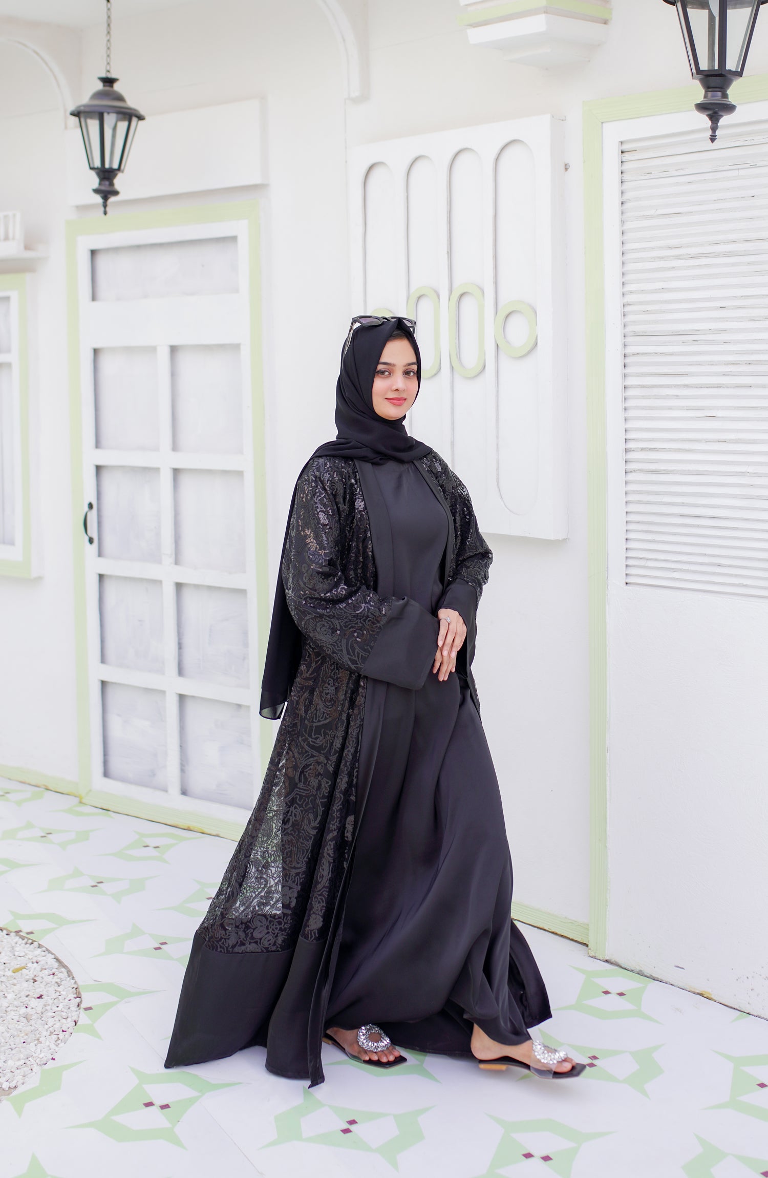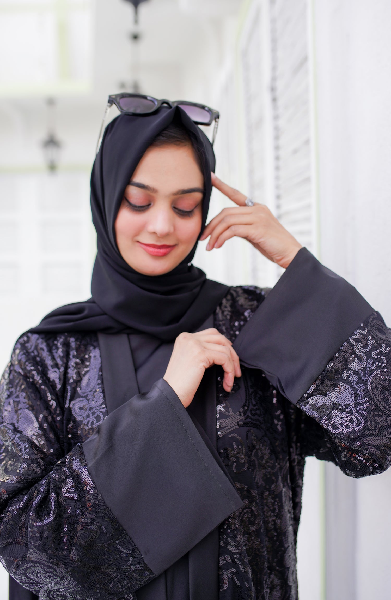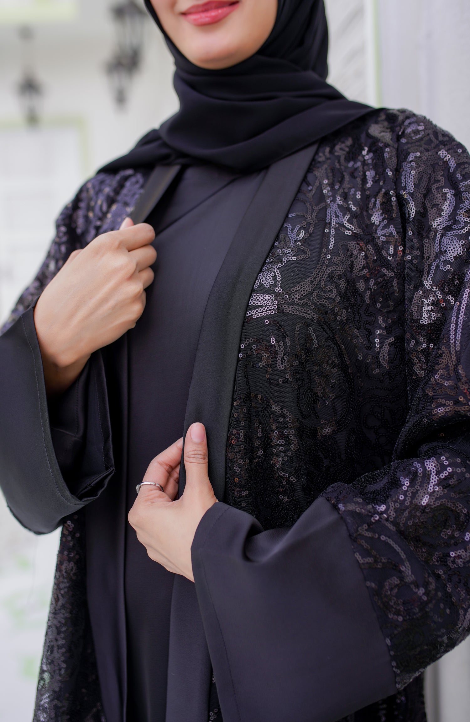 Add timeless luxury to your wardrobe with this unique and one of-a-kind Royal black sequin Kimino. The soft luxurious fabric is adorned with eye-catching sequin all over.