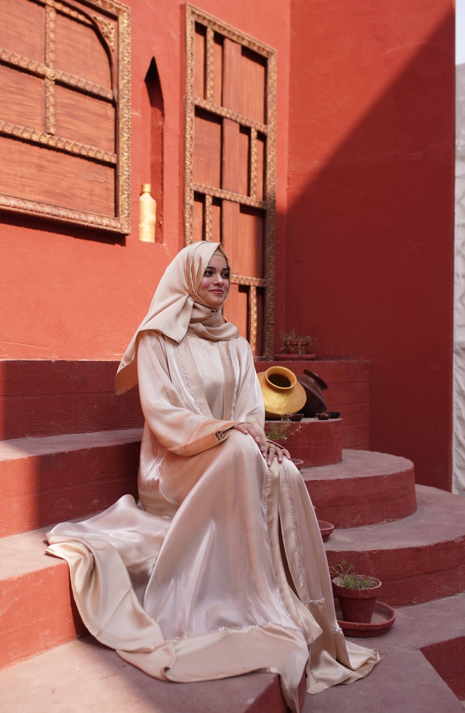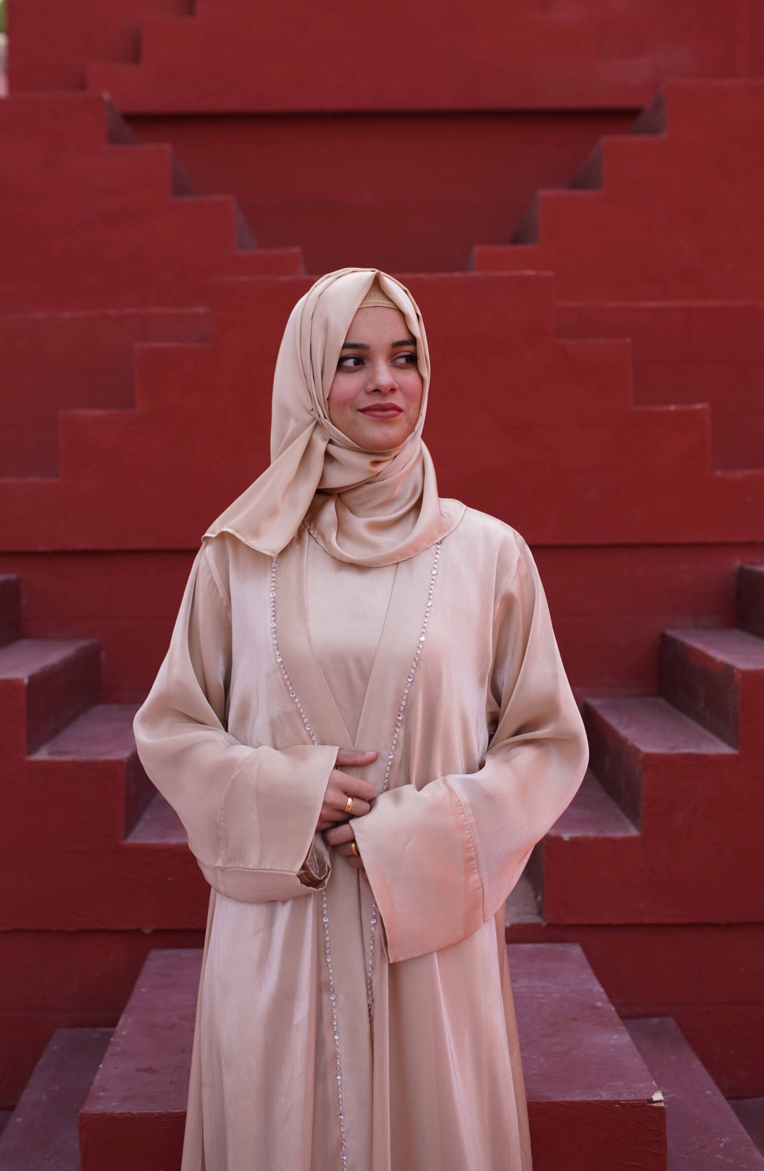 Feminity is at the heart of this Angelic abaya set. The material used to make the dress drapes smoothly over the body. Panels are Finely embellished with Shiny crystal hand work making it look more royal and elegant. Suitable to wear in any Special occasion.