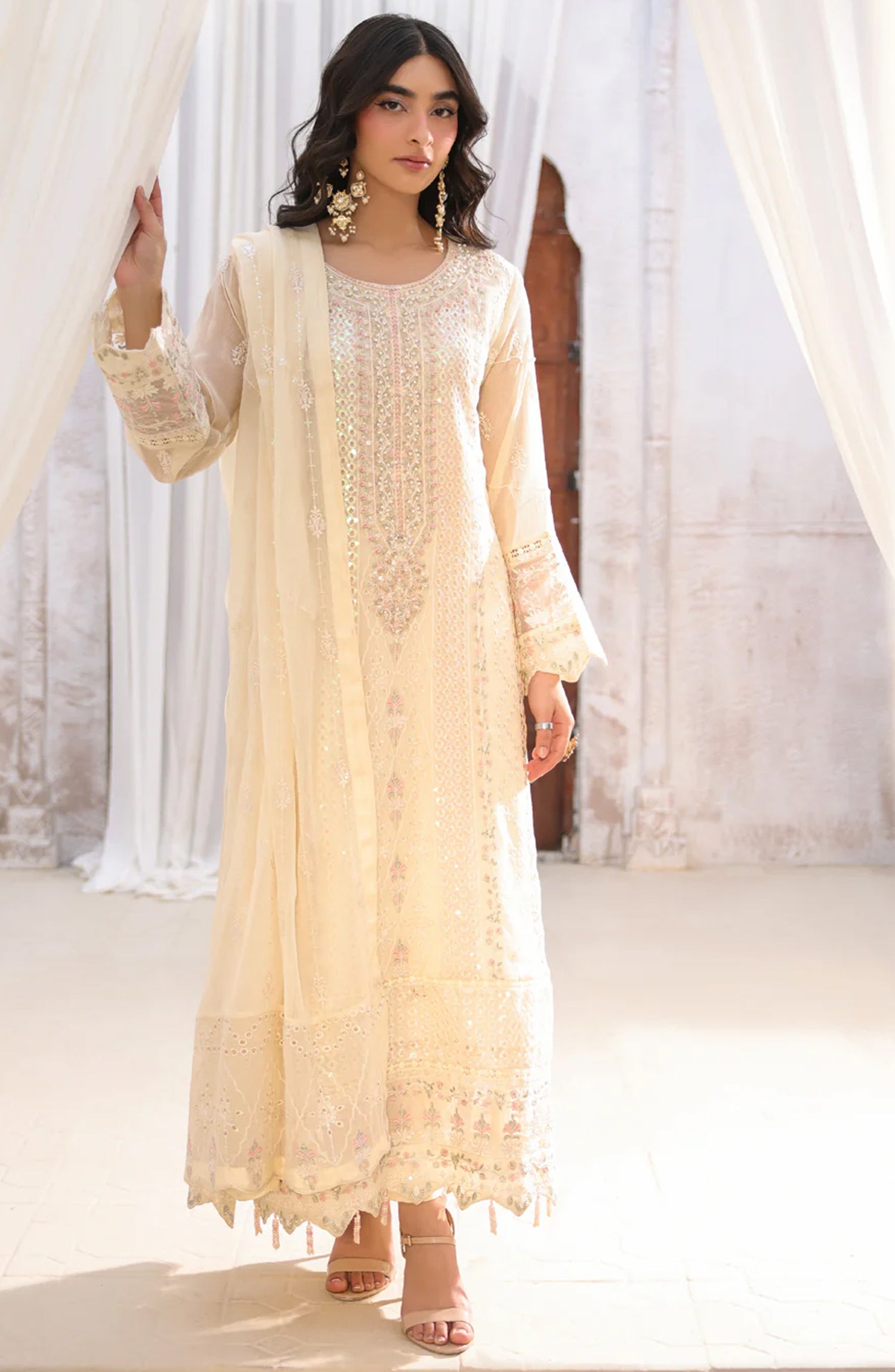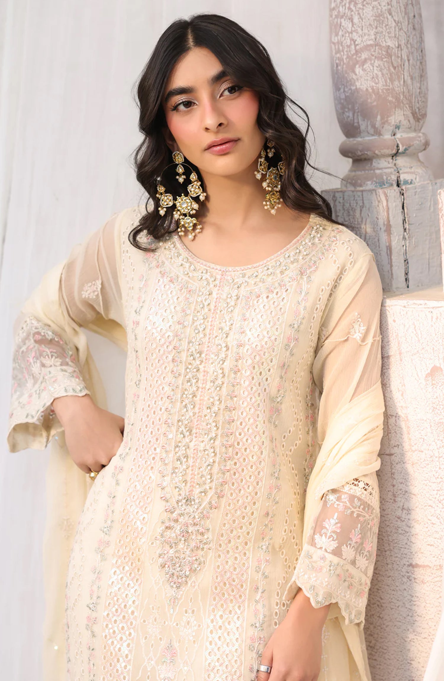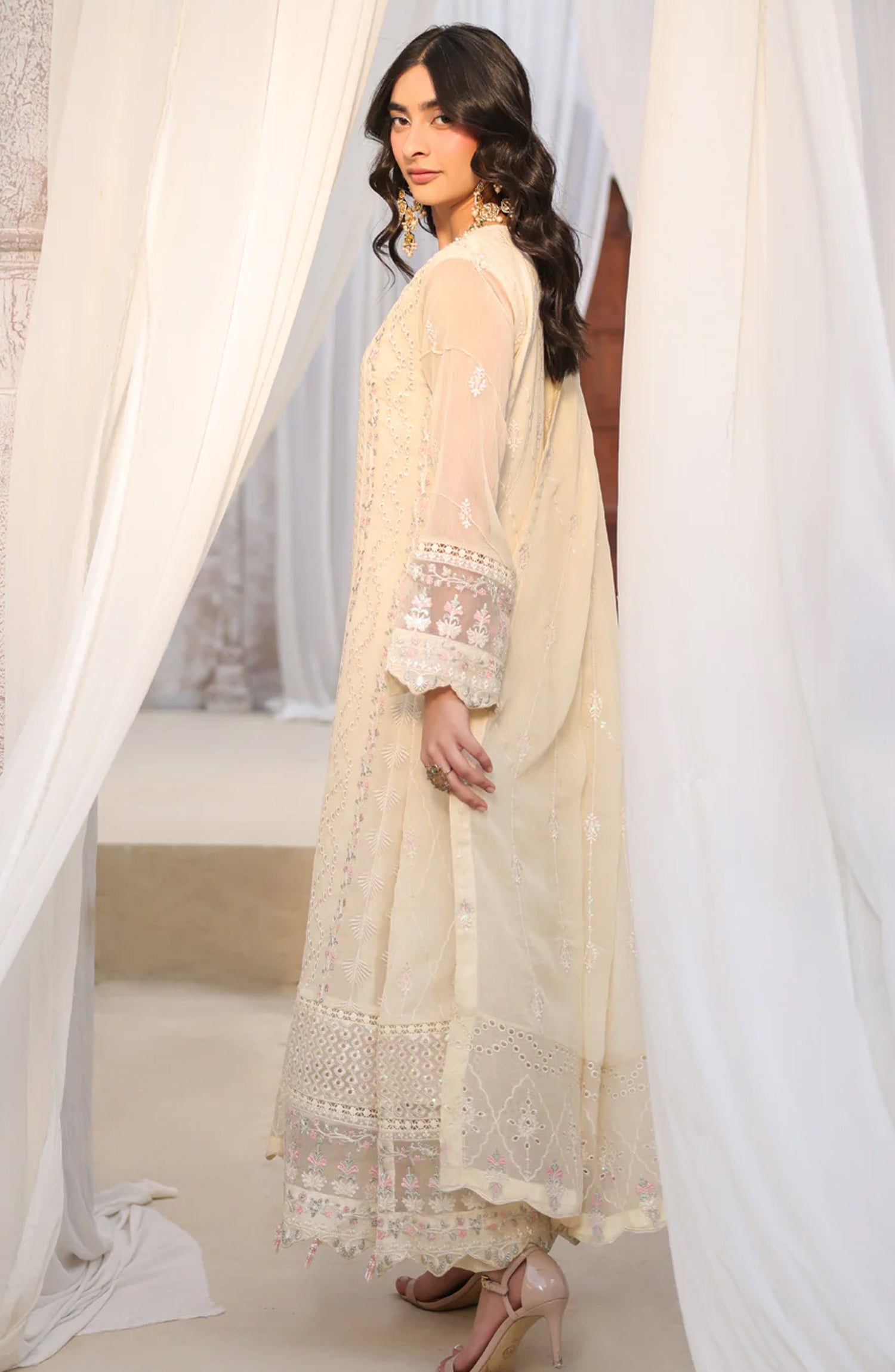 • Embroidered neckline on organza • Embellished Embroidered Chiffon Front 43"