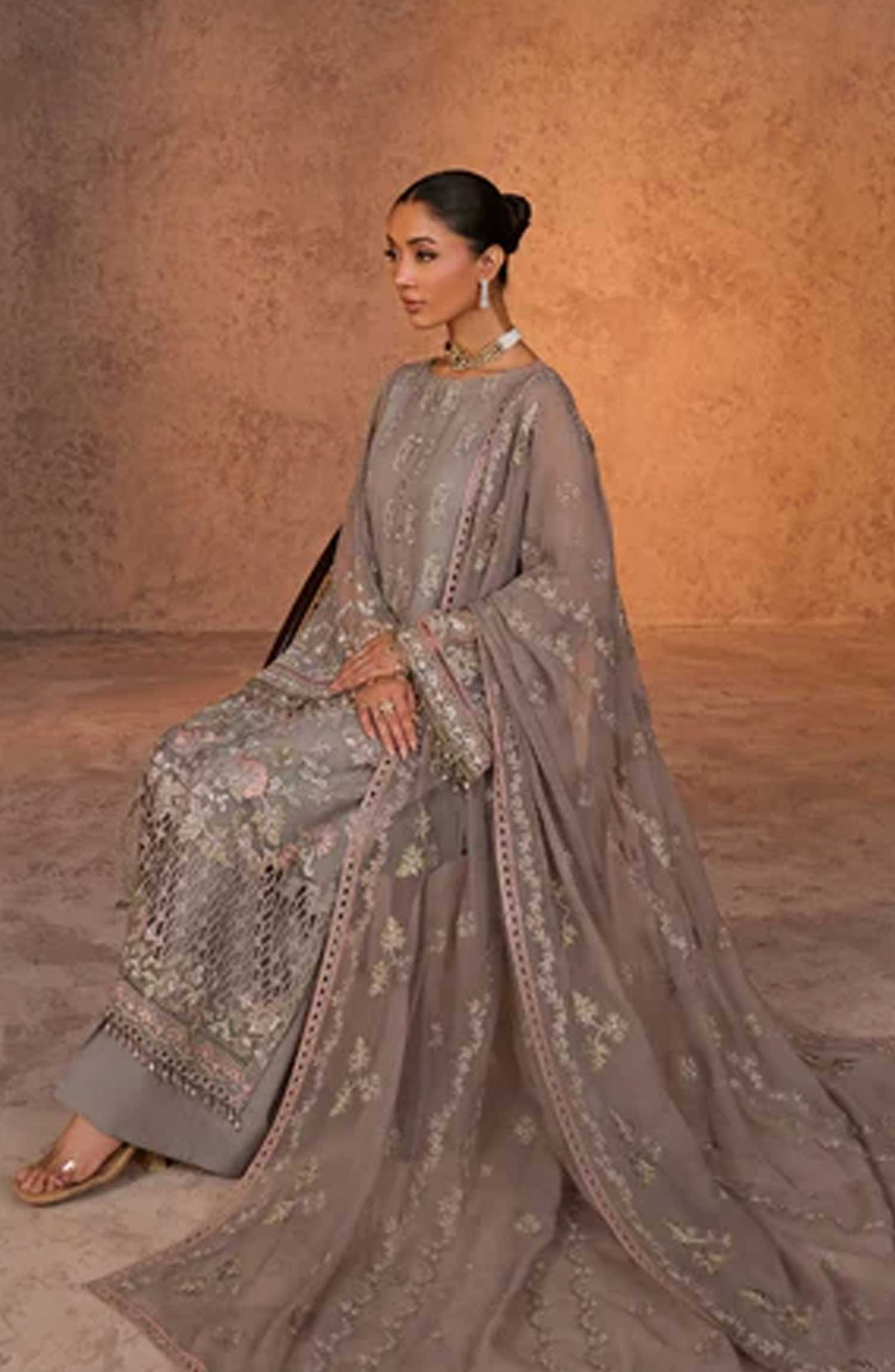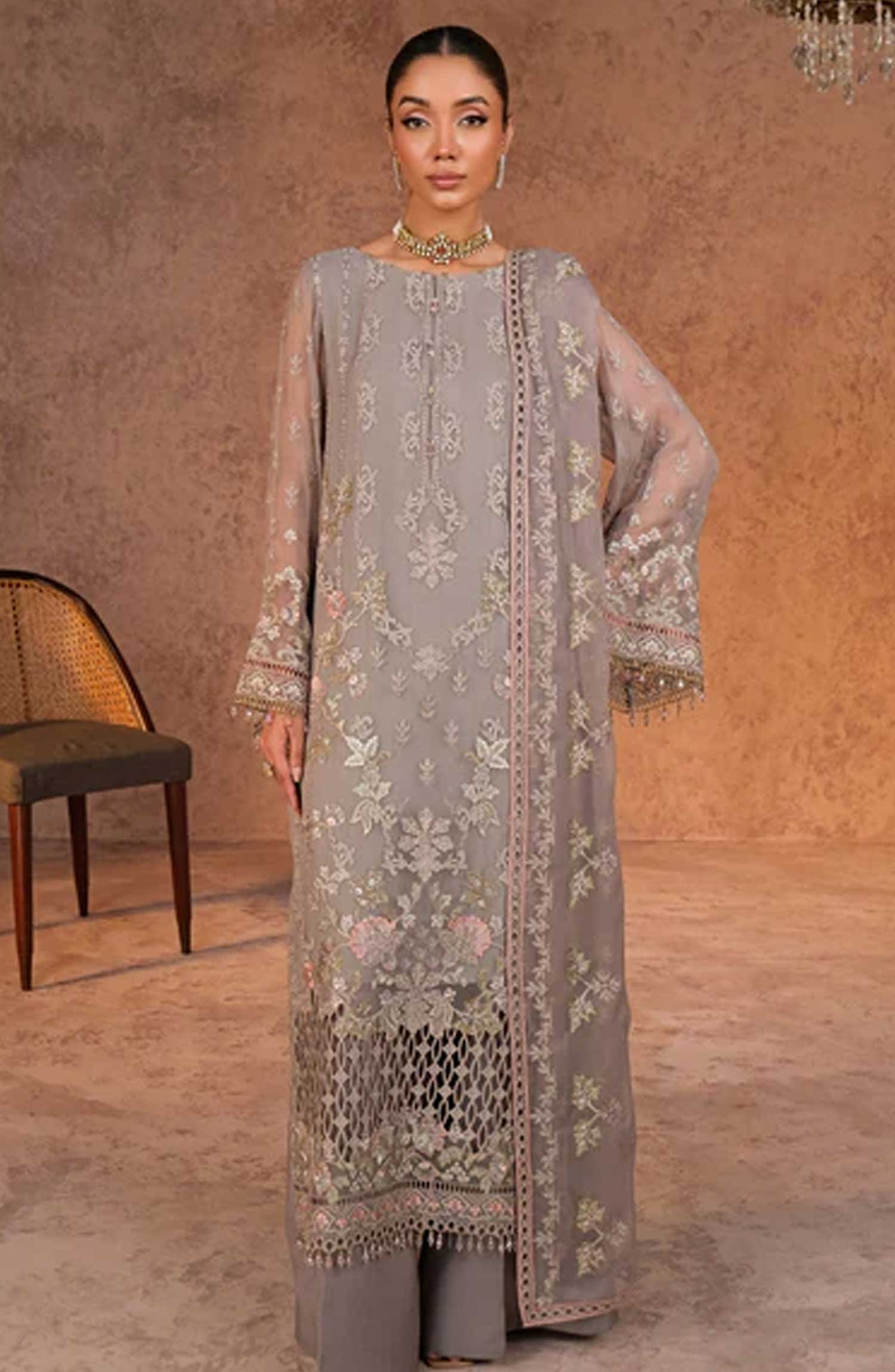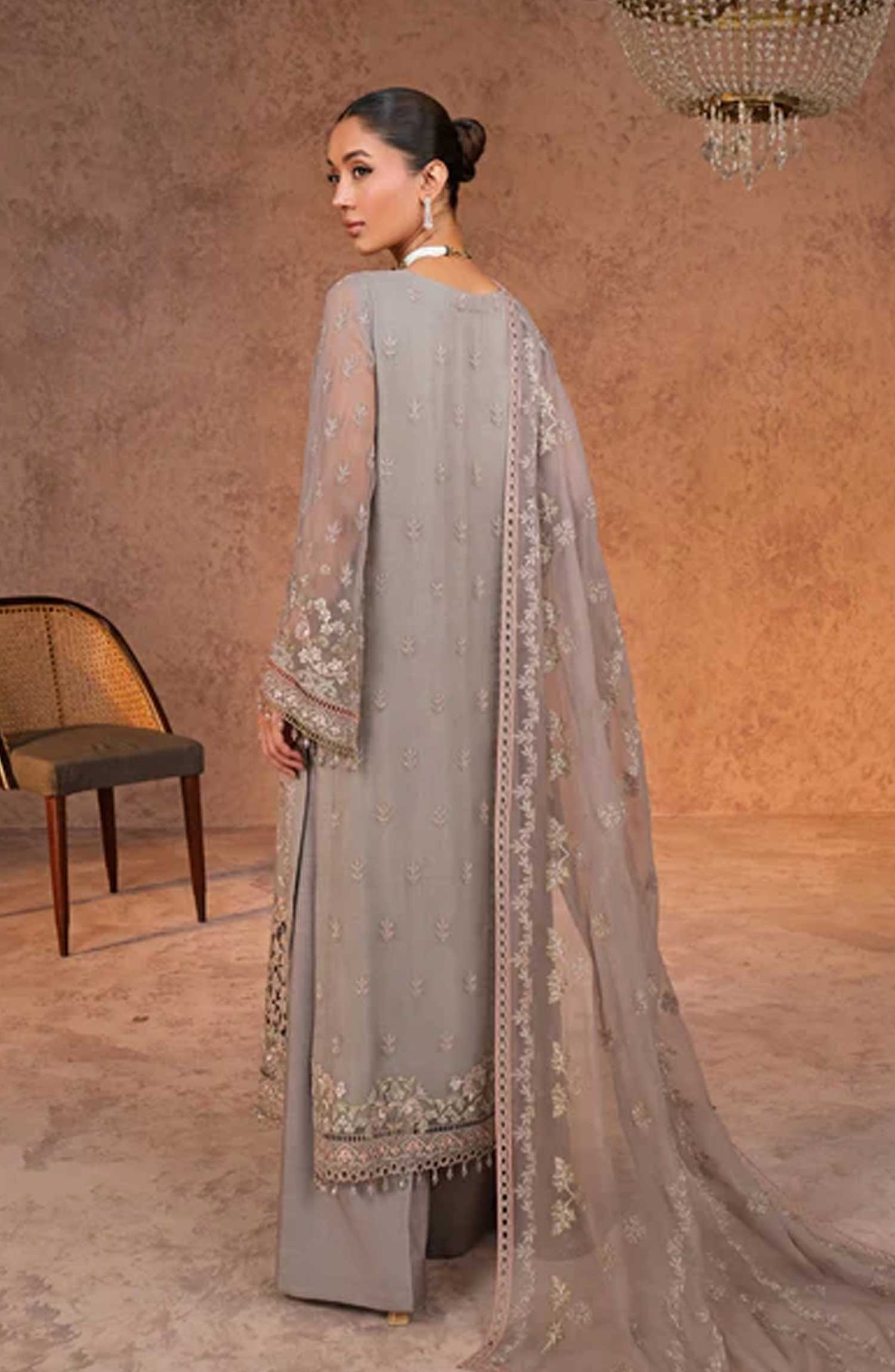 Lamisah Luxury Chiffon Unstitched Collection By Lavish Premium has been styled in the image for photography and illustrative purposes.
