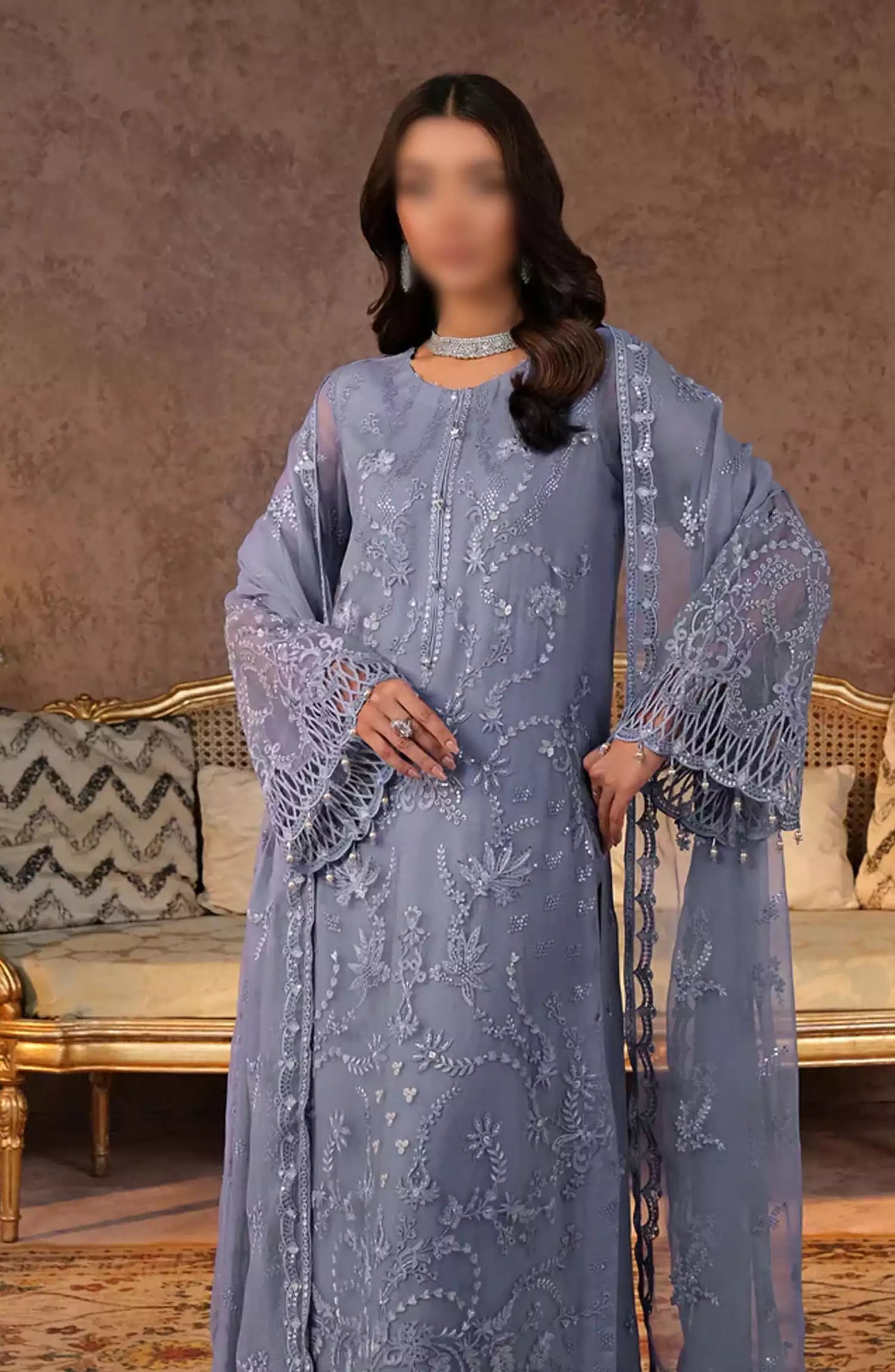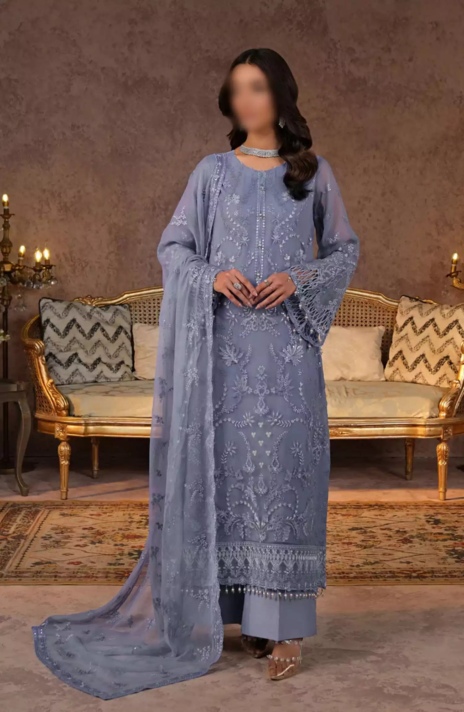 Modest Embroidered Chiffon Stitched 3 Piece Suit - 9840-Cblu - MOD25PRF - Blue - Festive Girls Collection