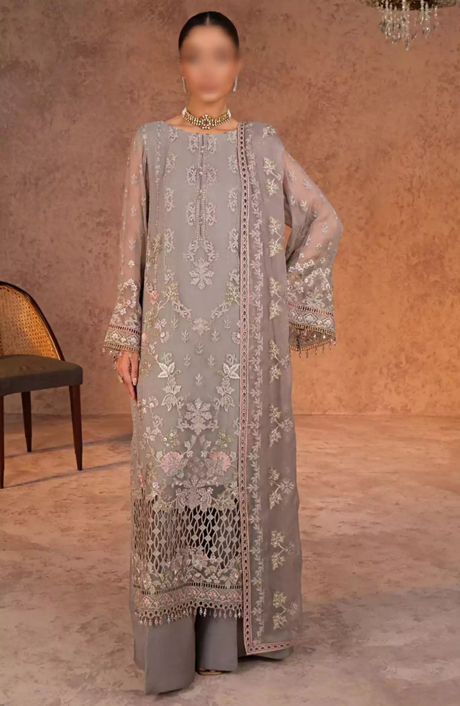 Modest Embroidered Chiffon Stitched 3 Piece Suit - 9615-Nblu - MOD25PRF - Blue - Festive Girls Collection