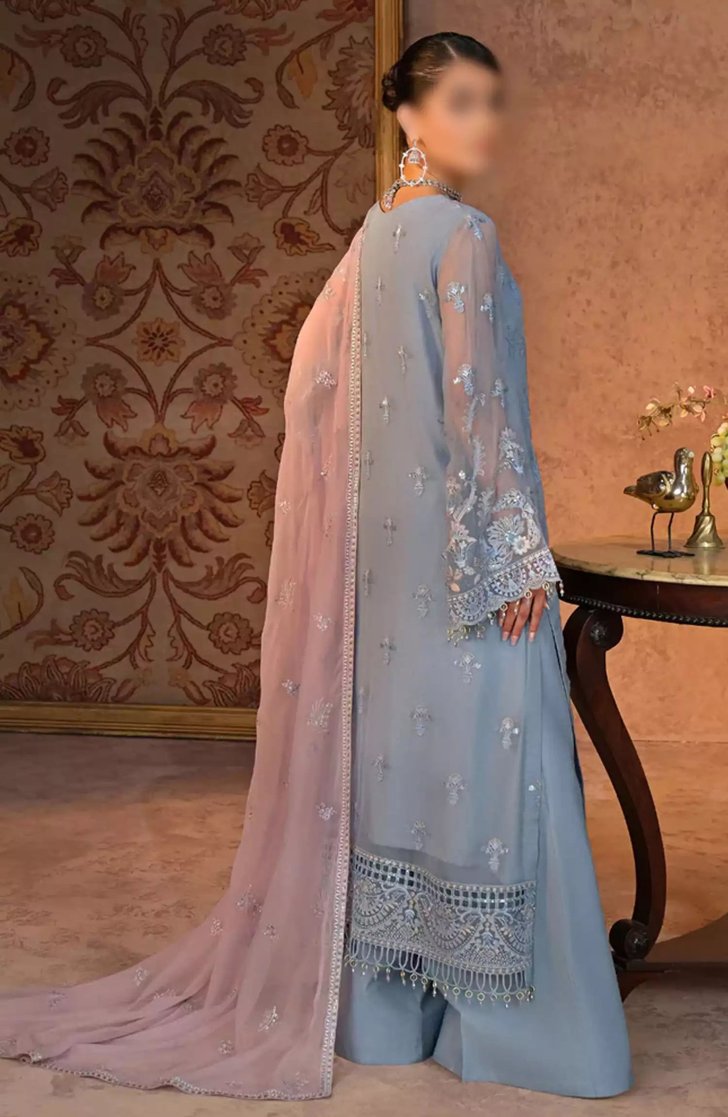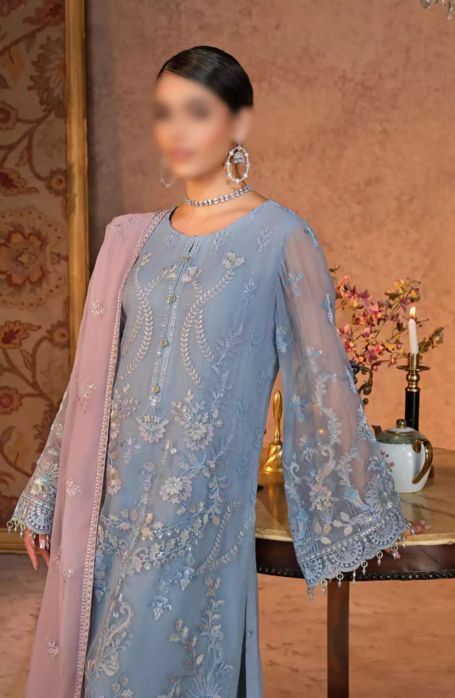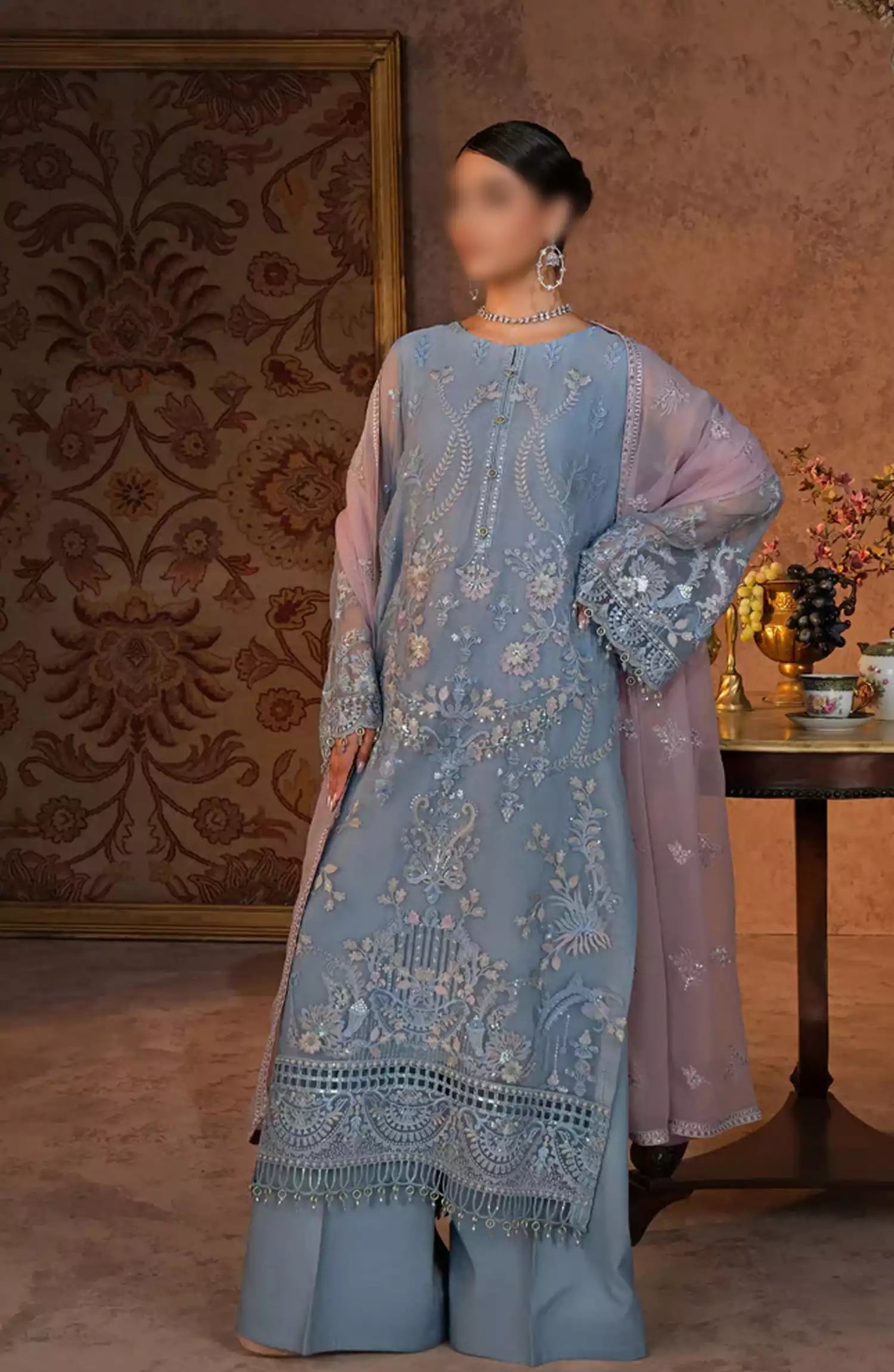 Modest Embroidered Chiffon Stitched 3 Piece Suit - 9840-Cblu - MOD25PRF - Blue - Festive Girls Collection