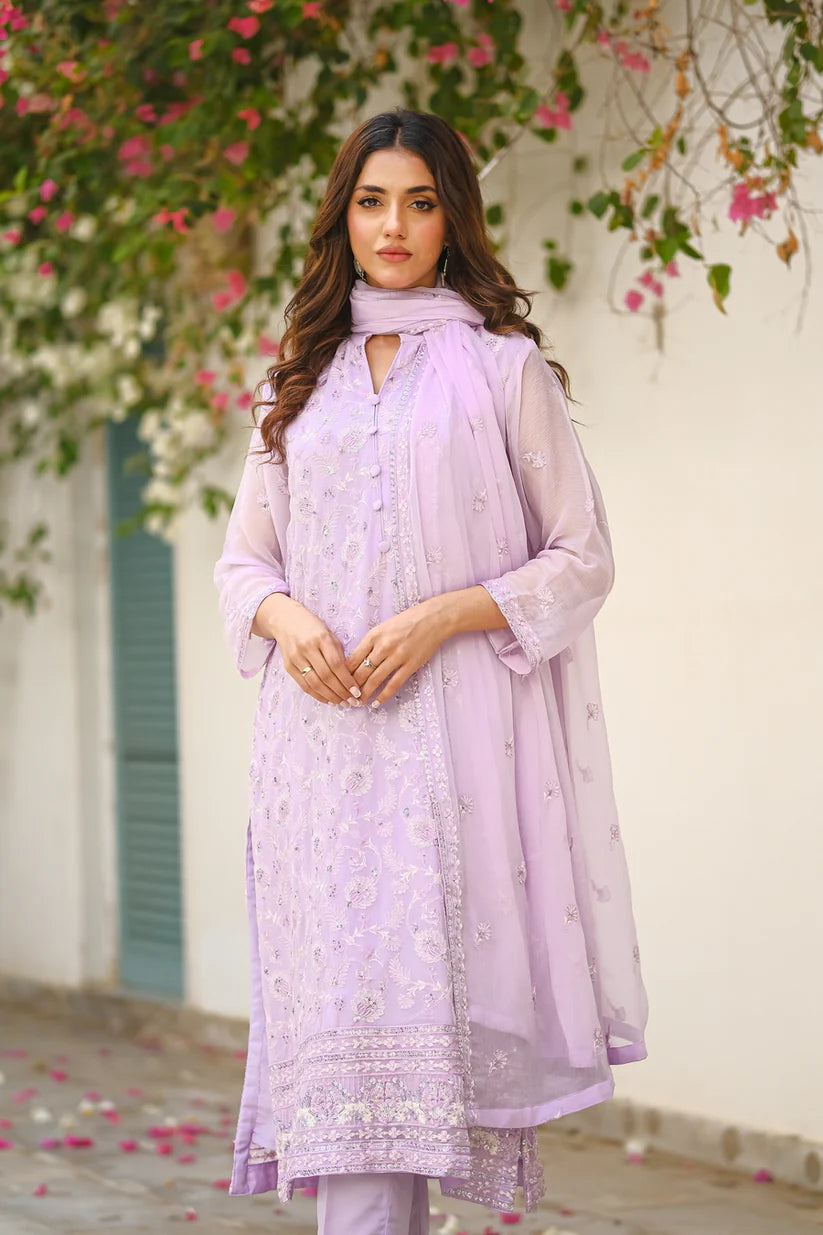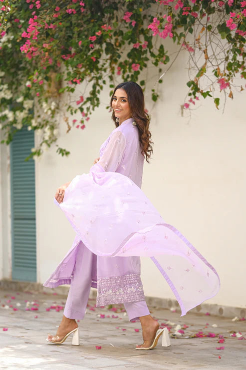 Indulge in the ethereal beauty of the "Lavender Dream" - a mesmerizing 3-piece luxury chiffon ensemble that embodies grace and sophistication. Crafted from the finest chiffon fabric in a delicate lilac hue, each piece of this ensemble is meticulously embroidered with intricate patterns, reminiscent of delicate lavender blossoms swaying in a tranquil breeze.