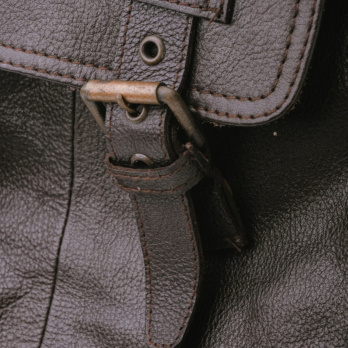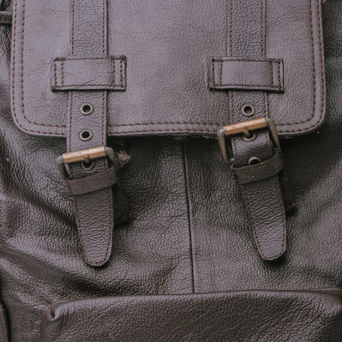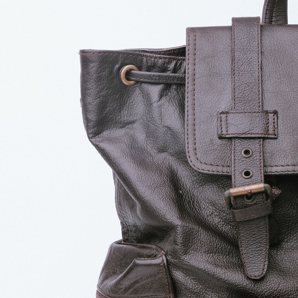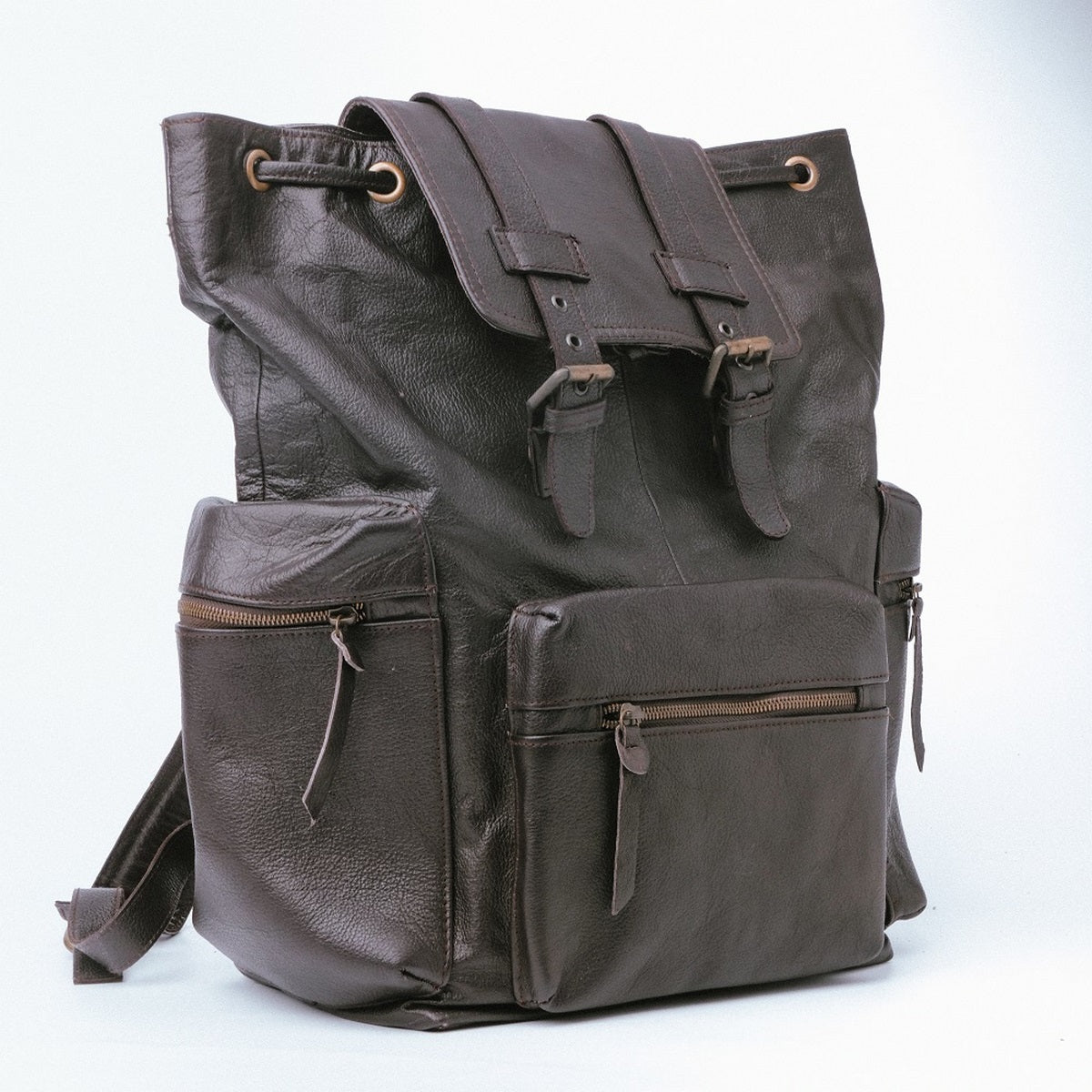 Leather drawstring and double buckled straps closure
