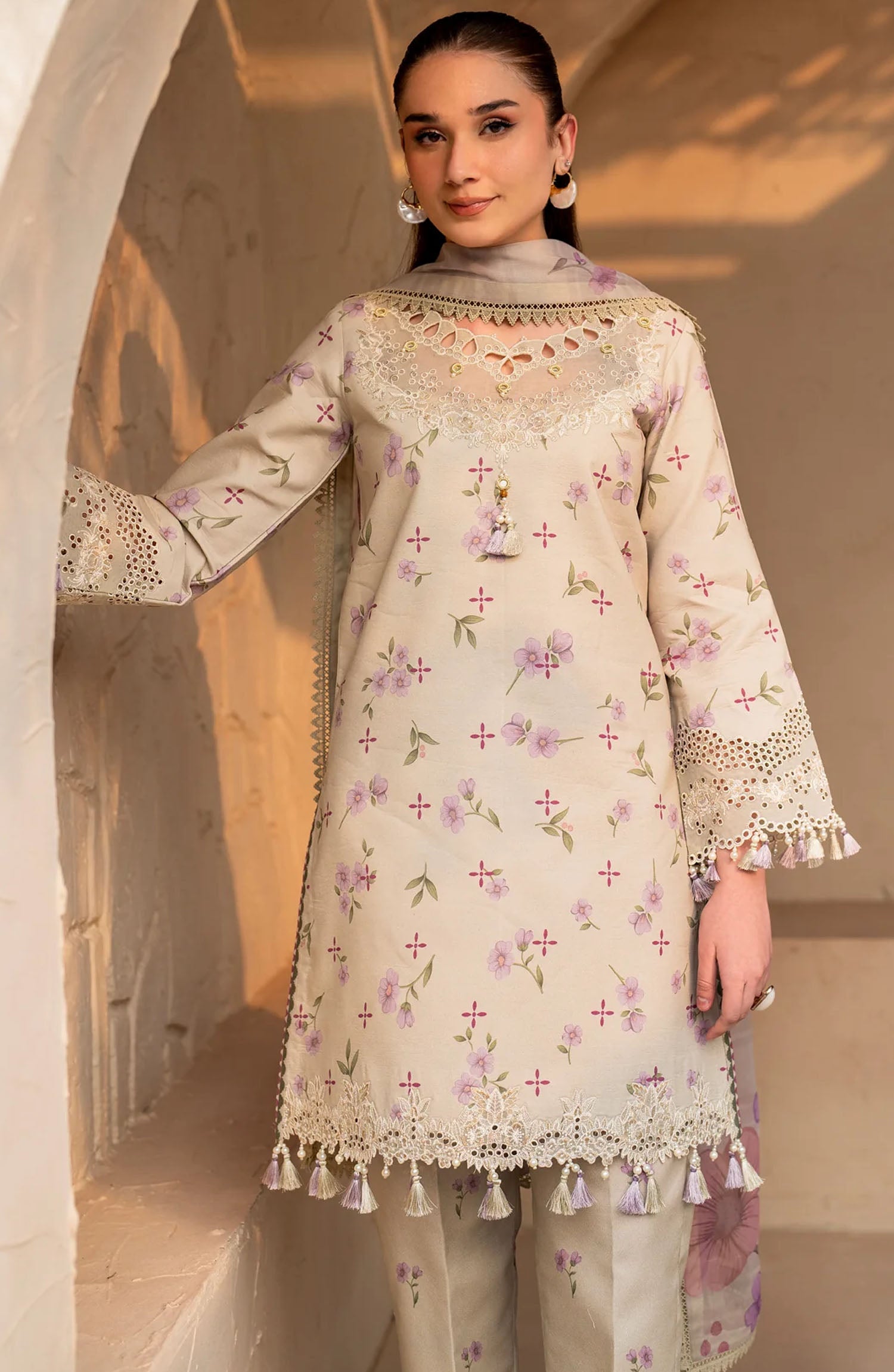 The standard style comes as a long-sleeved kameez with dupatta and trouser/shawlar.