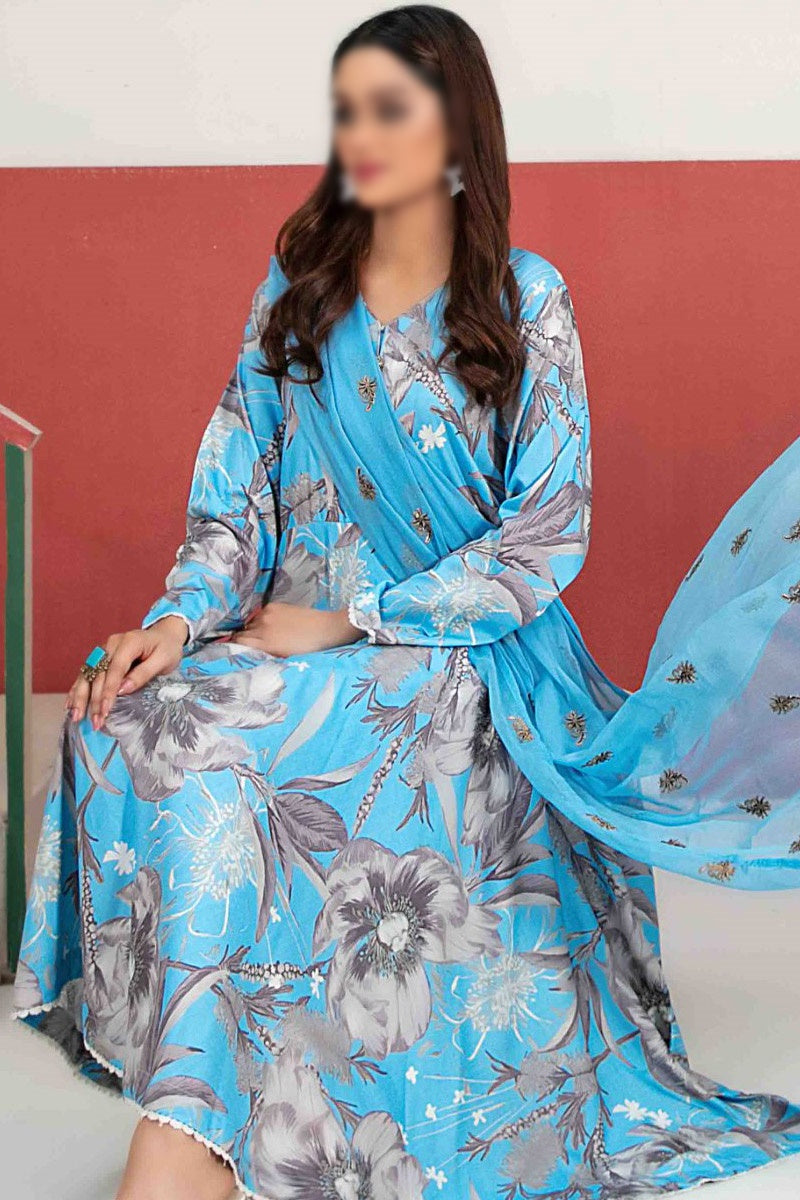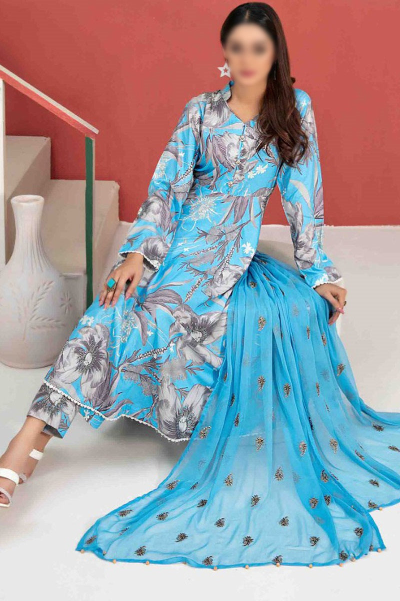 LIDA VOL I Digital Printed Staple Embroidered Chiffon Dupatta Collection 2023 has been styled in the image for photography and illustrative purposes.