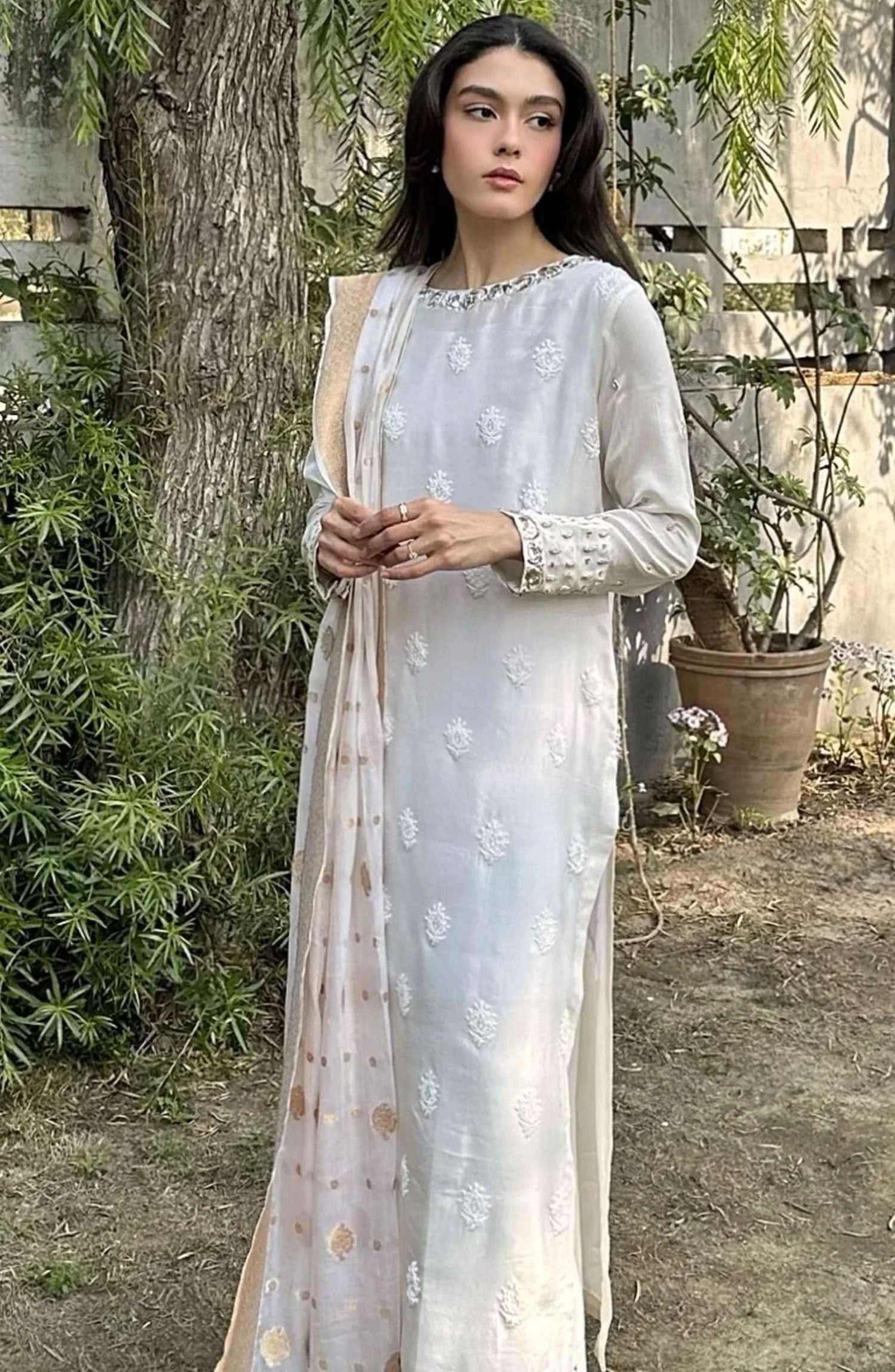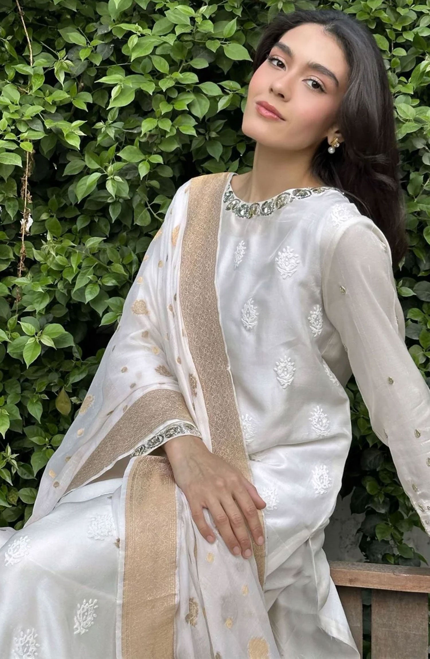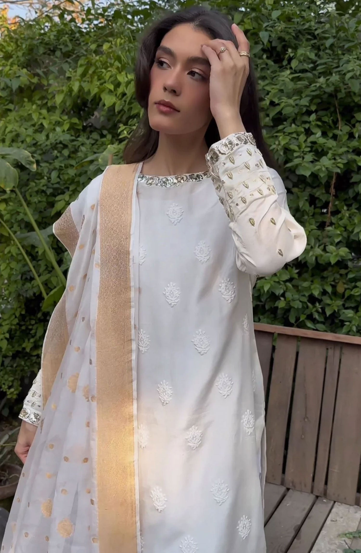 This beautiful minimal white sleek long shirt has delicate neck and cuffs worked with ganga jamni Kamdani and dabka work, we have paired this with loose pants worked with Kamdani spray on bottom and pure chiffon silk Banarsi dupatta(pattern of dupatta will variate).