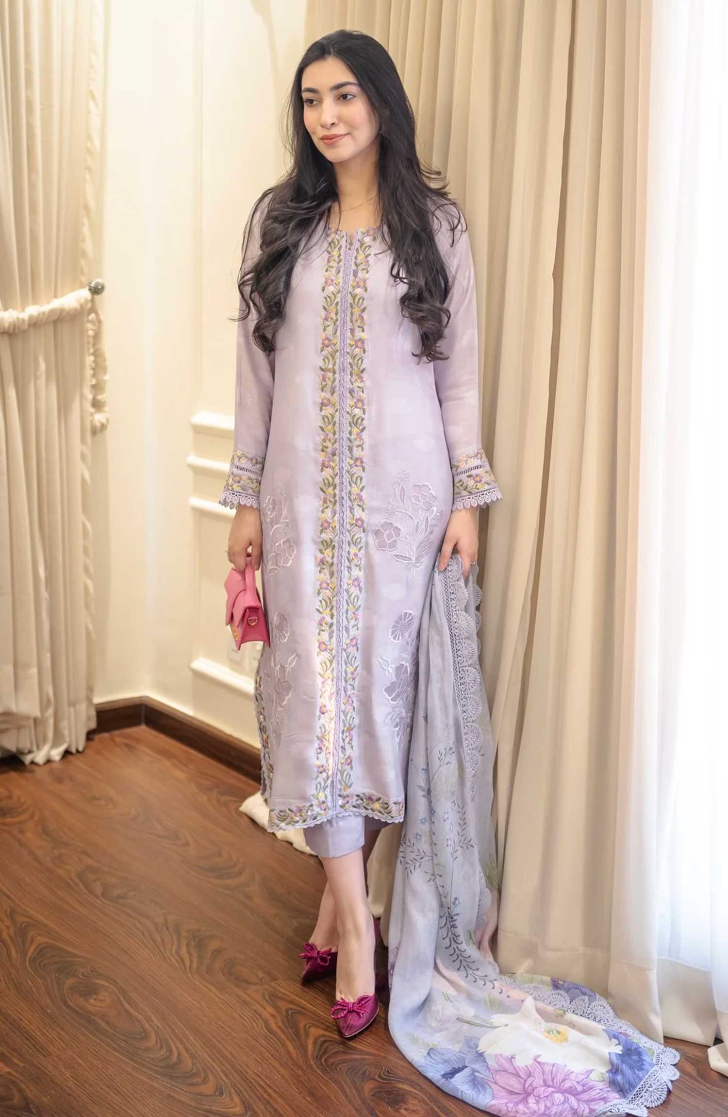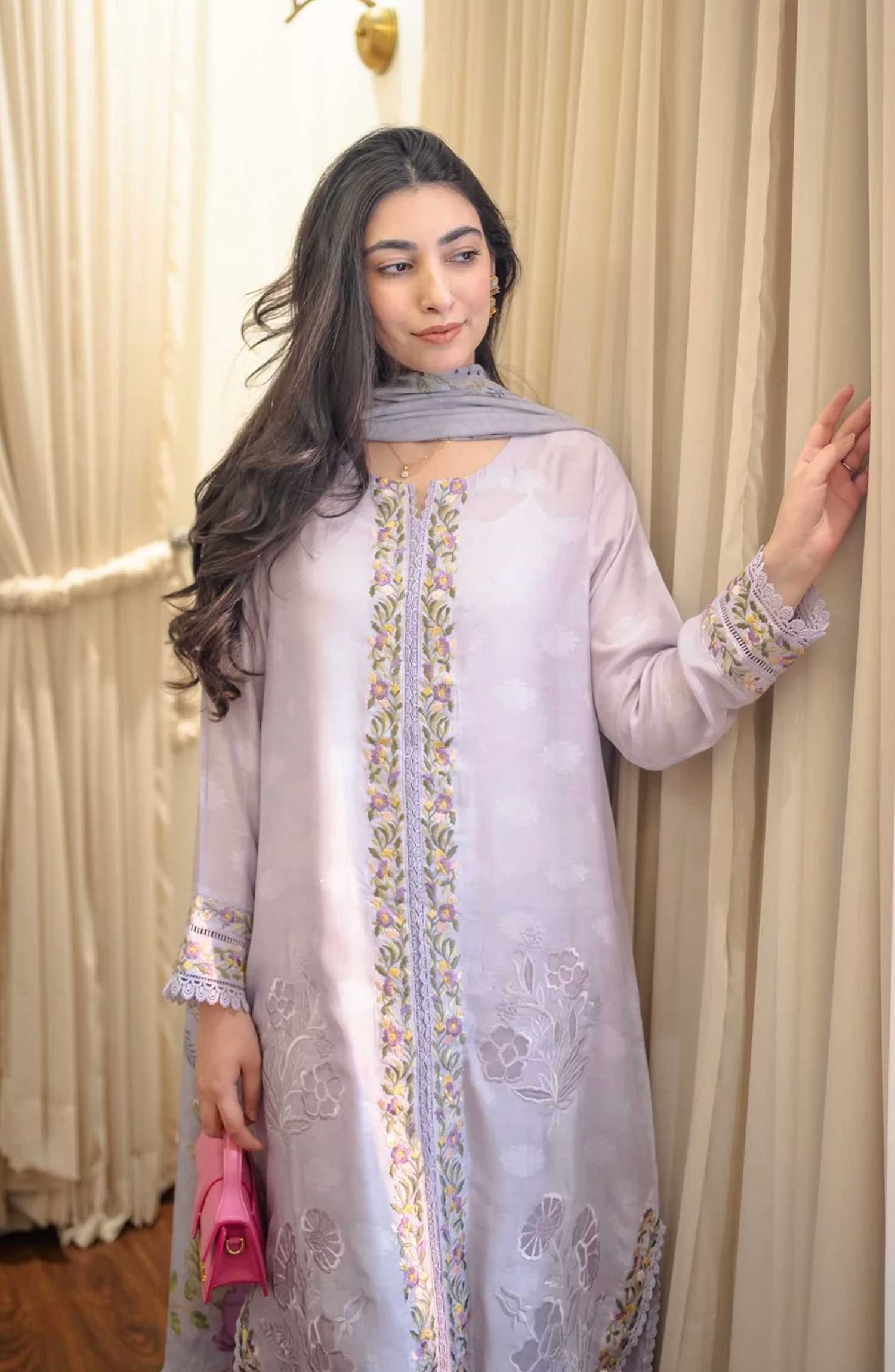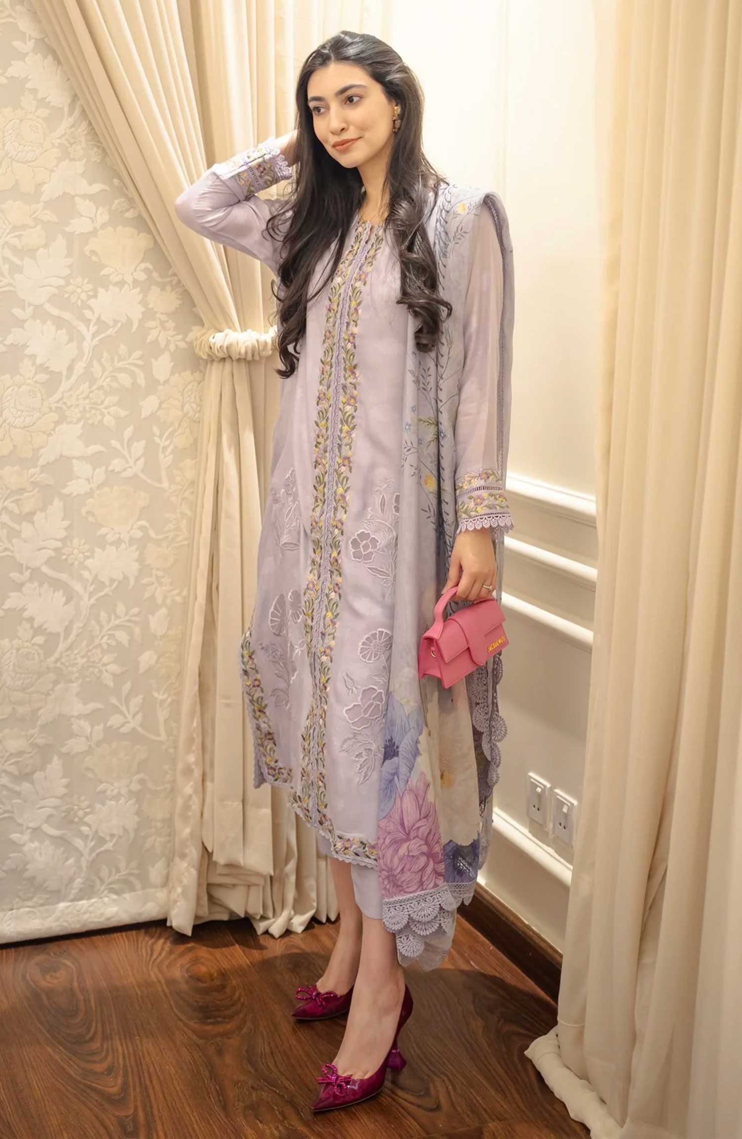 This sleek straight front open fit shirt on pure self cotton net lavender shirt has been heavily embroidered with resham work on front side slits and sleeves cuffs along with organza appliqué work on front panels. We have paired this shirt with printed floral dupatta edged with lace (which may vary) and straight fitted pants.