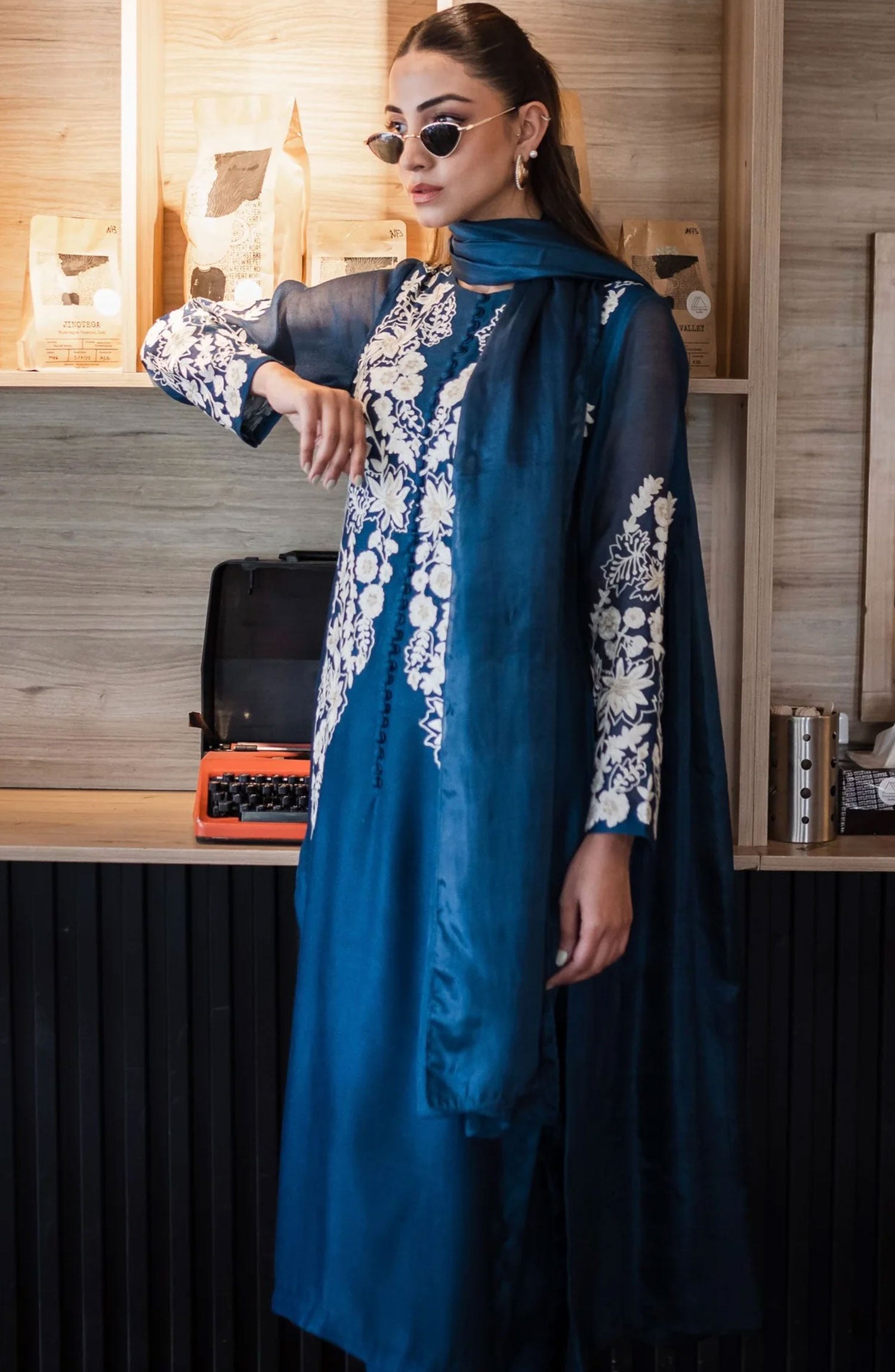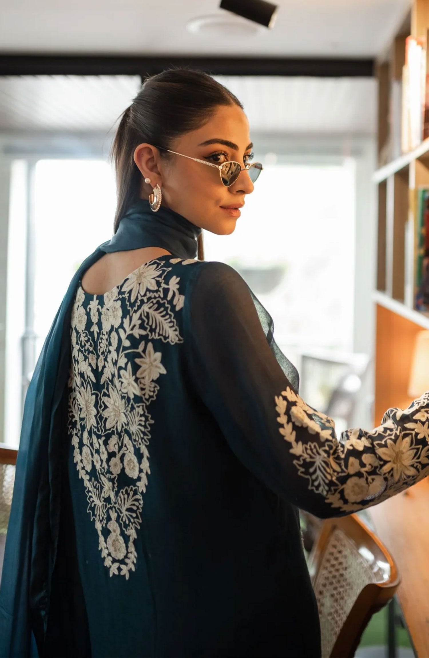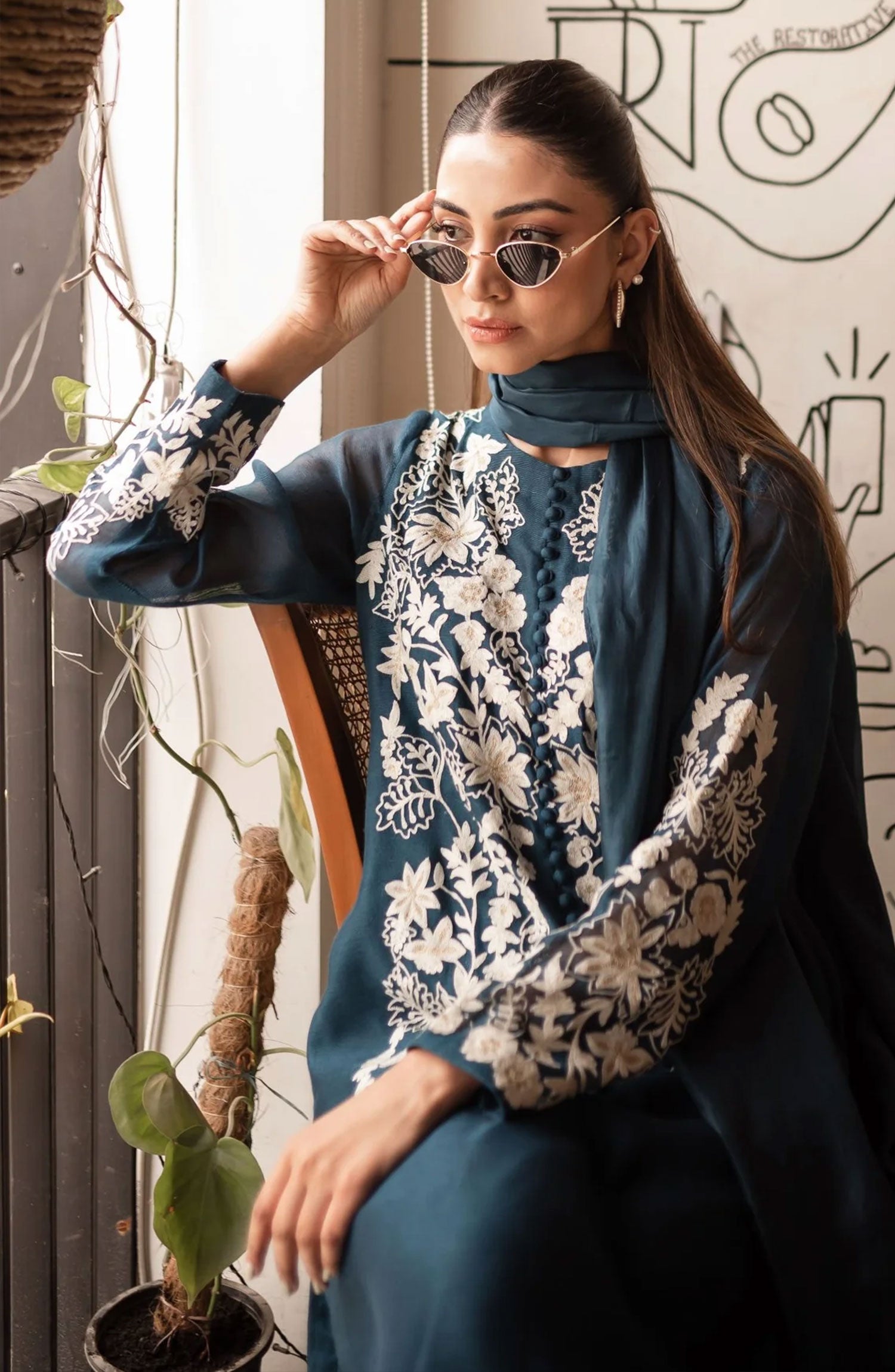 Luna Edit By Hues Atelier Embroidered Khaadi Net Stitched 3 Piece - Teal Blue Fit - HA25L - Festive Collection