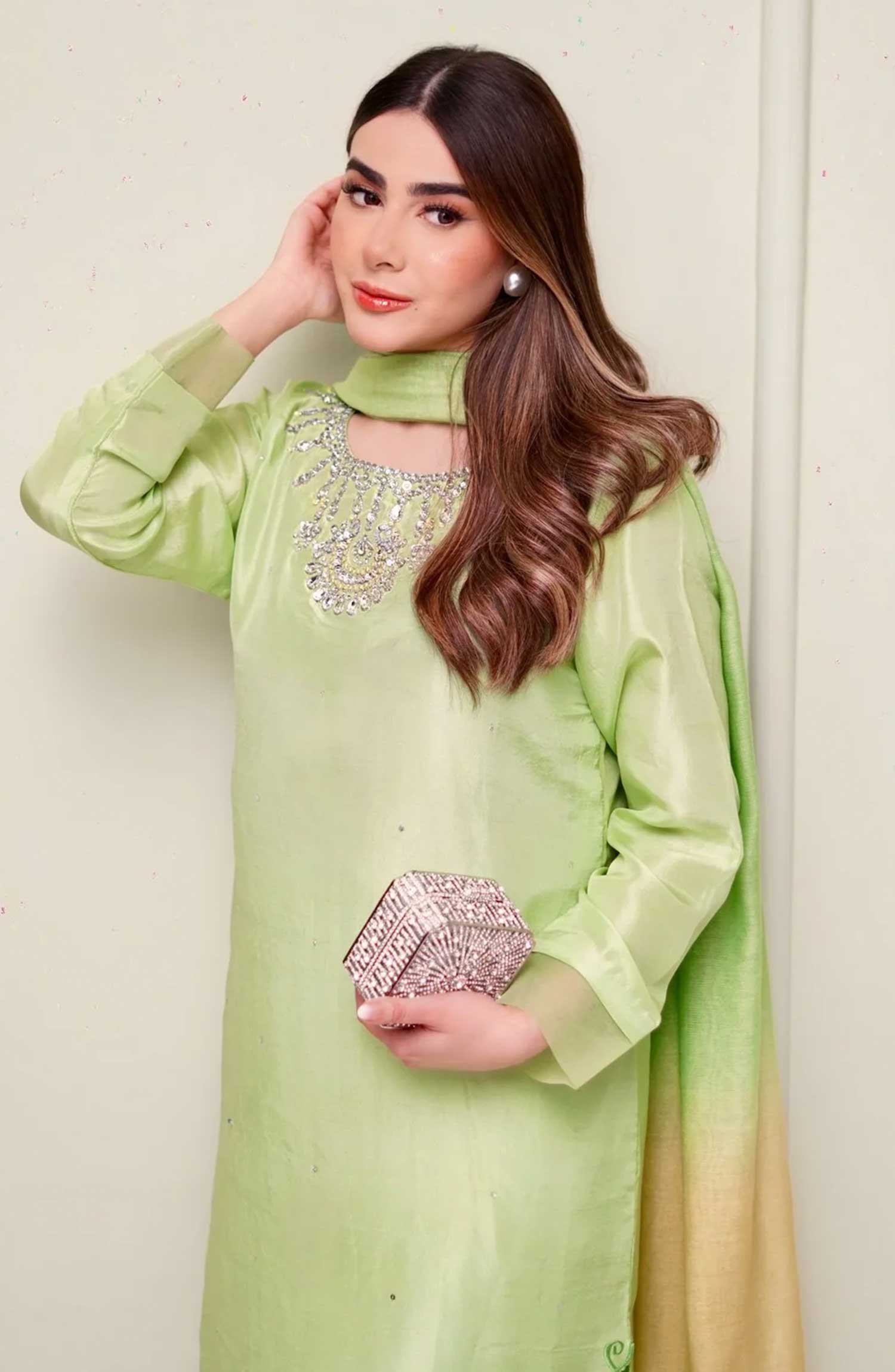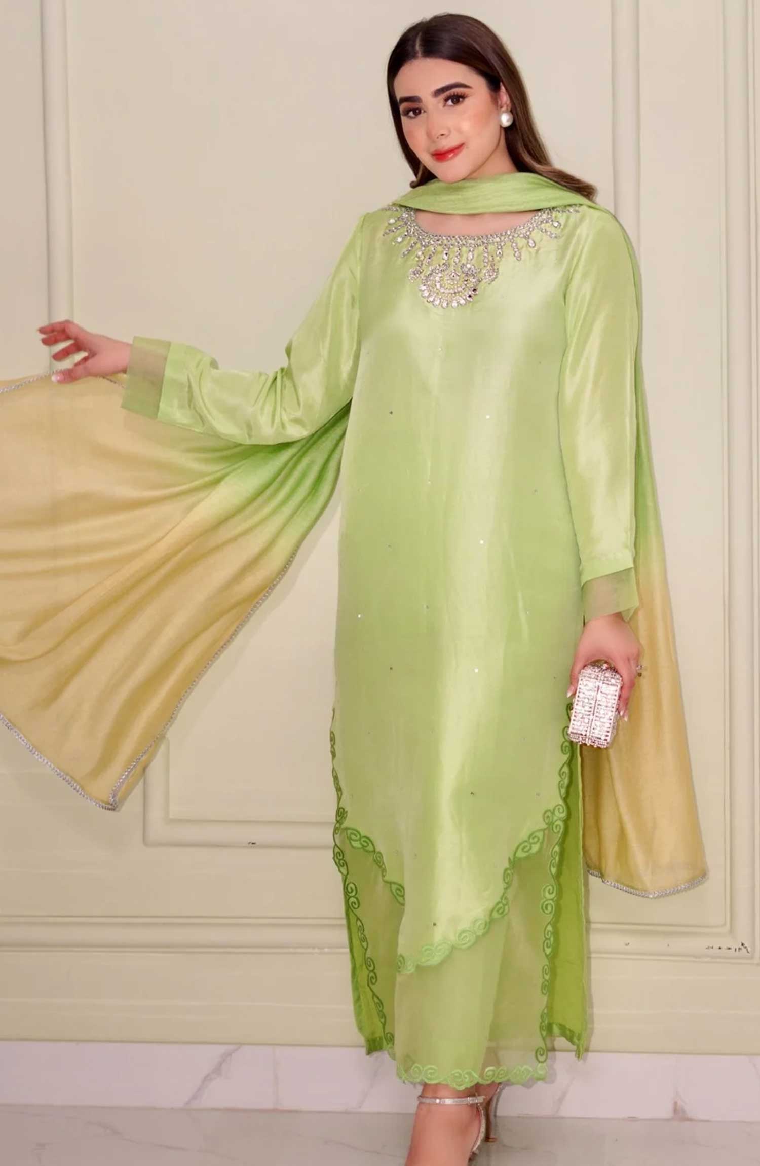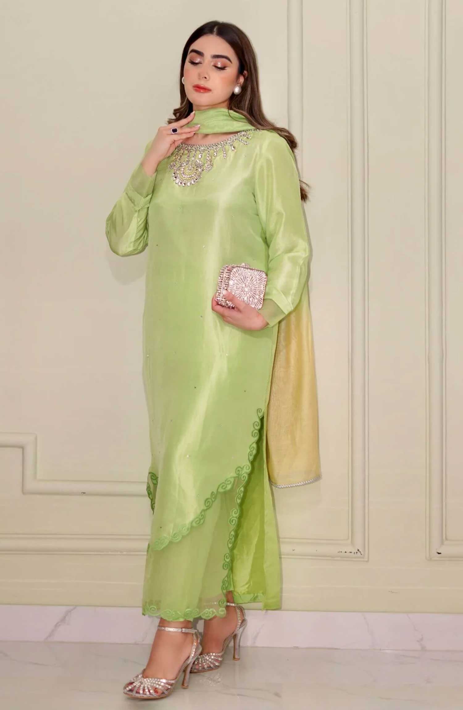 This minimal avocado green long shirt has a jewelled handworked neckline and spray allowed the shirt and the bottom of the shirt has organza sheer part joint with thread embroidery.Paired with two tone cotton net dupatta and straight pants.