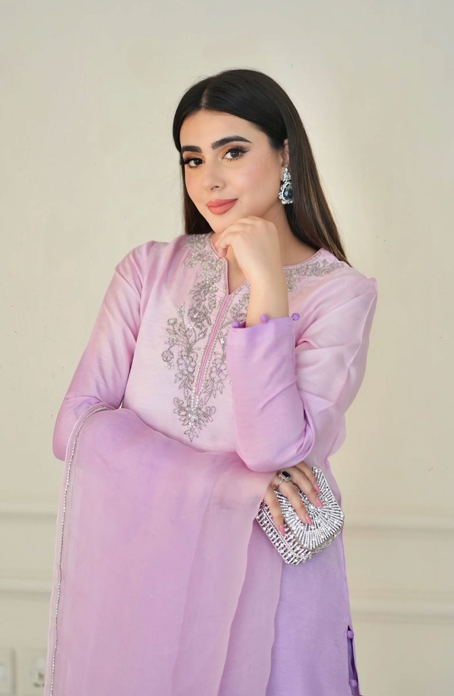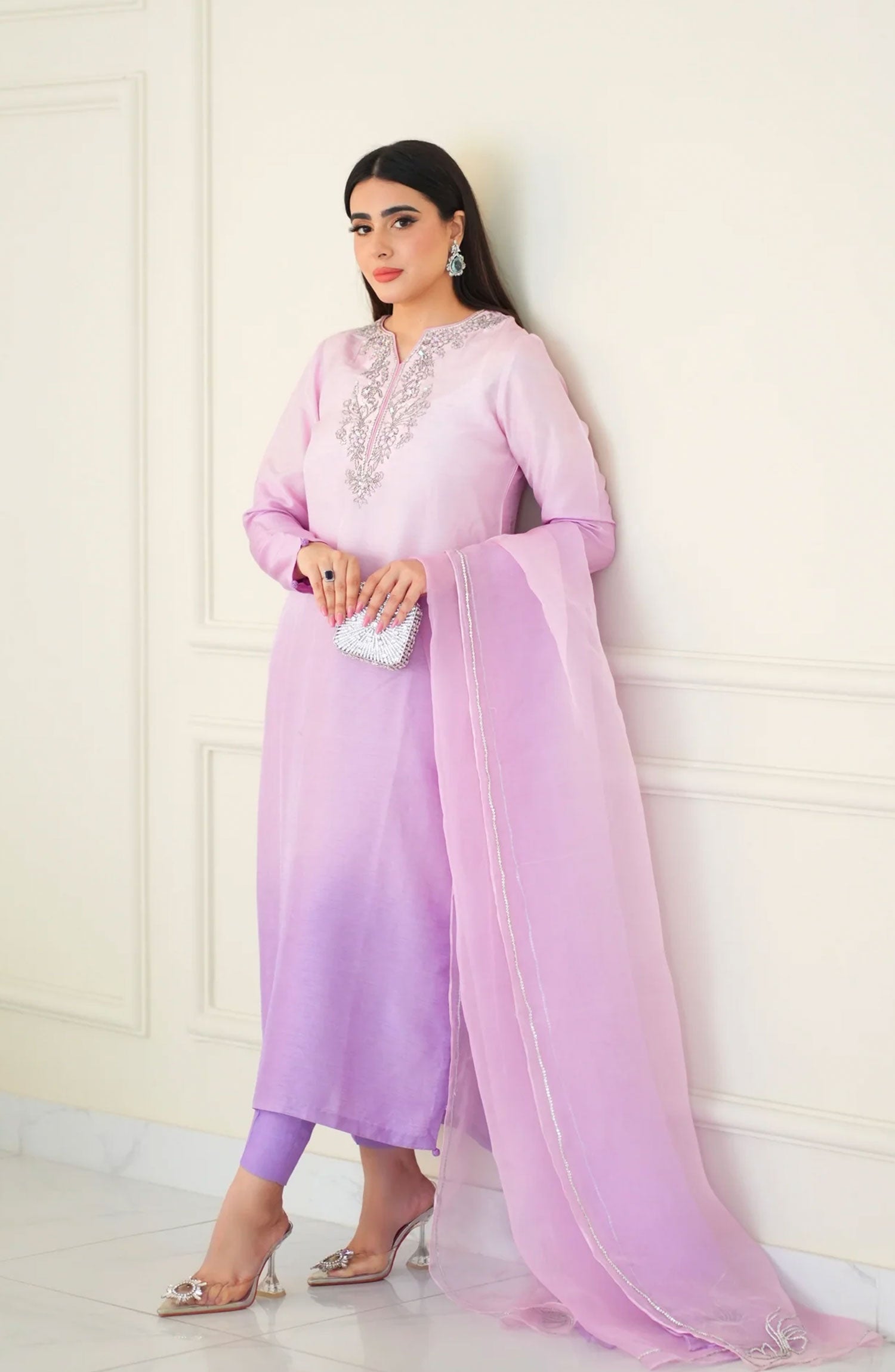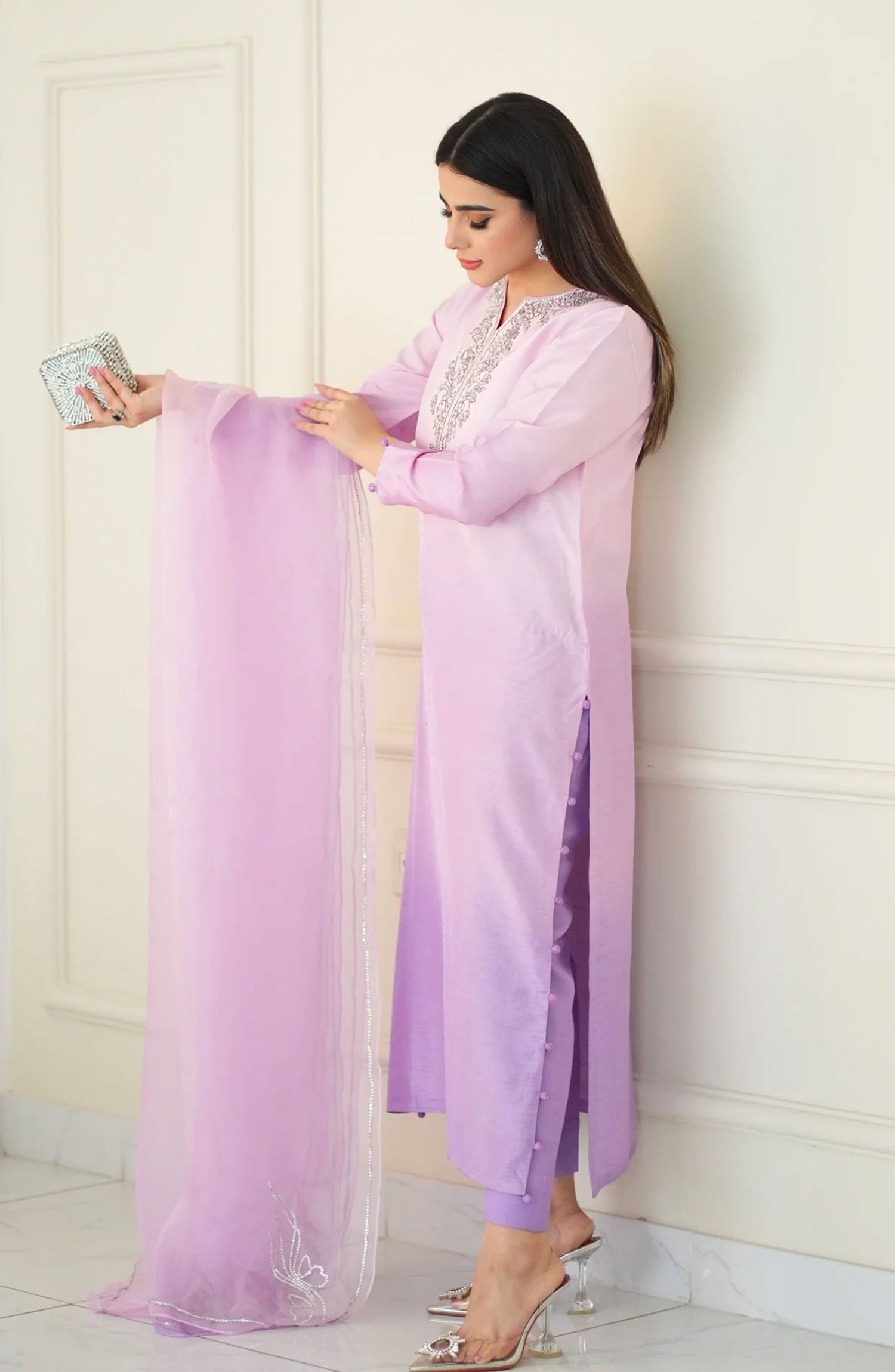 This pretty ombré lilac toned long shirt has intricate kutdana handworked neckline paired with organza dupatta which is handworked with Swarovskiâs worked border on all 4 sides of the dupatta and straight pants.