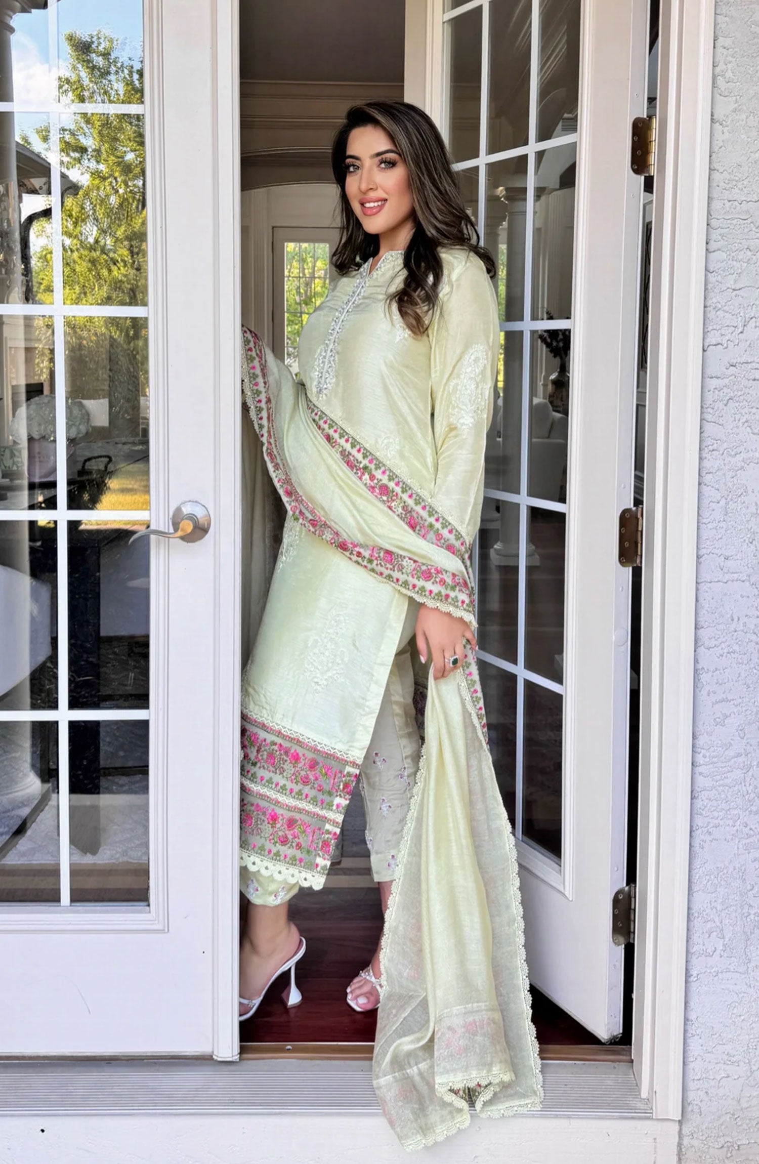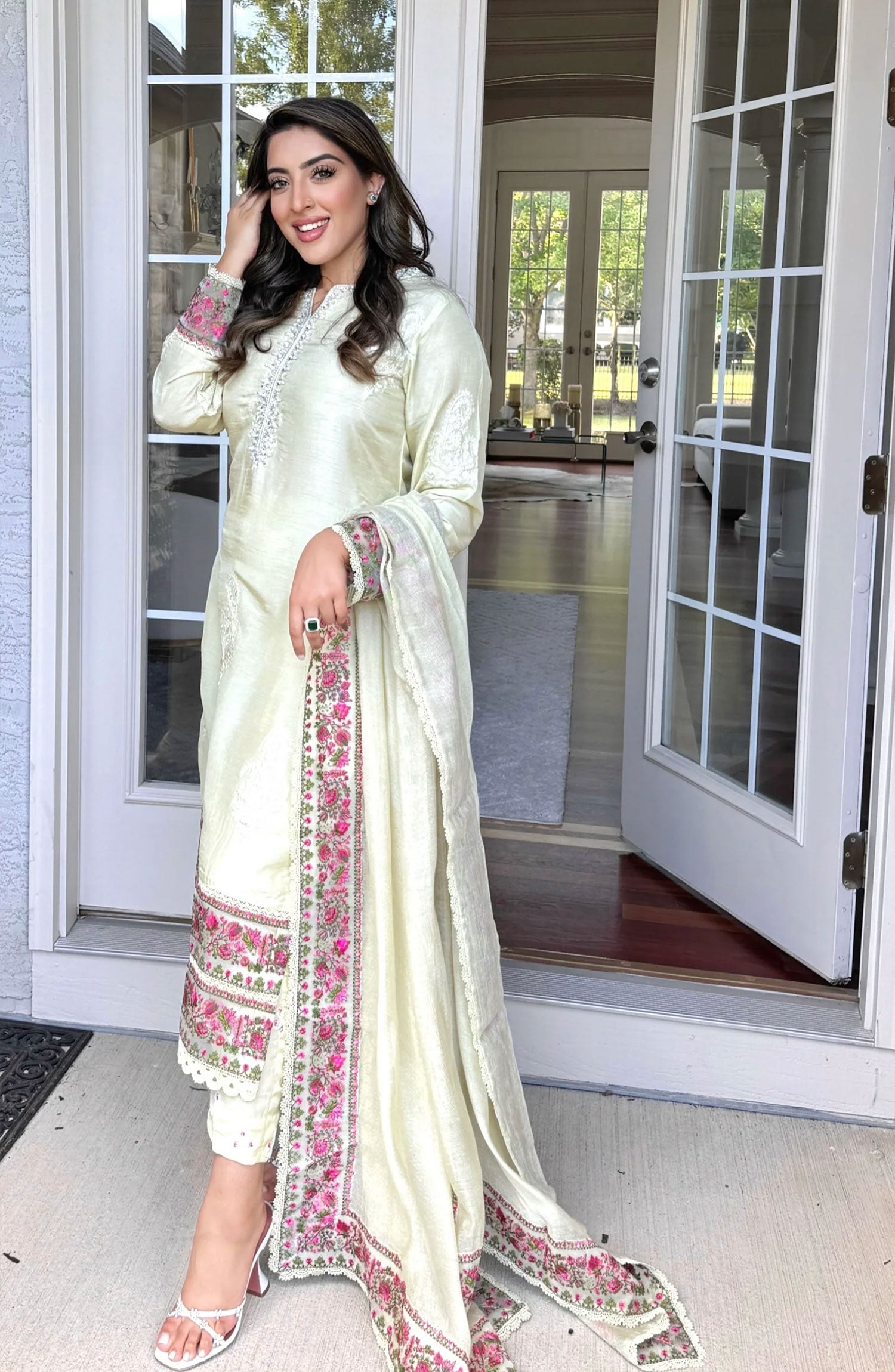 This sleek long off white Korean rawsilk shirt has embroidered with self Kashmiri stitch motives all over, with multi Kashmiri embroidered borders on bottom and the neck is handworked with pearls and Swarovskis. The dupatta has all over embroidered organza borders edged with laces and paired with straight pants.