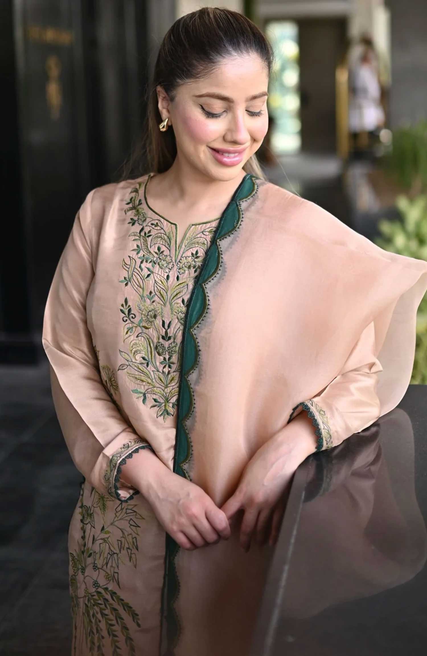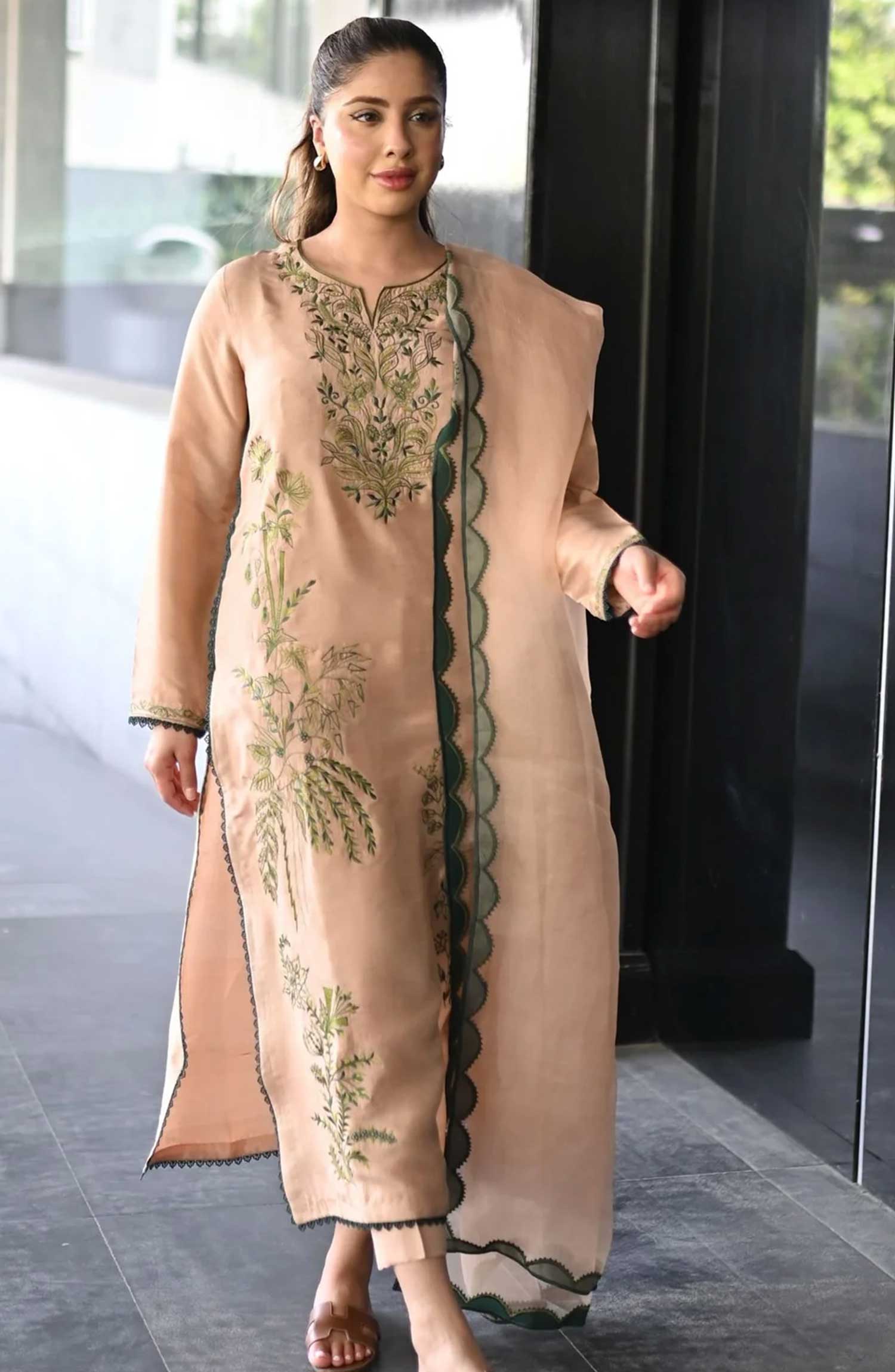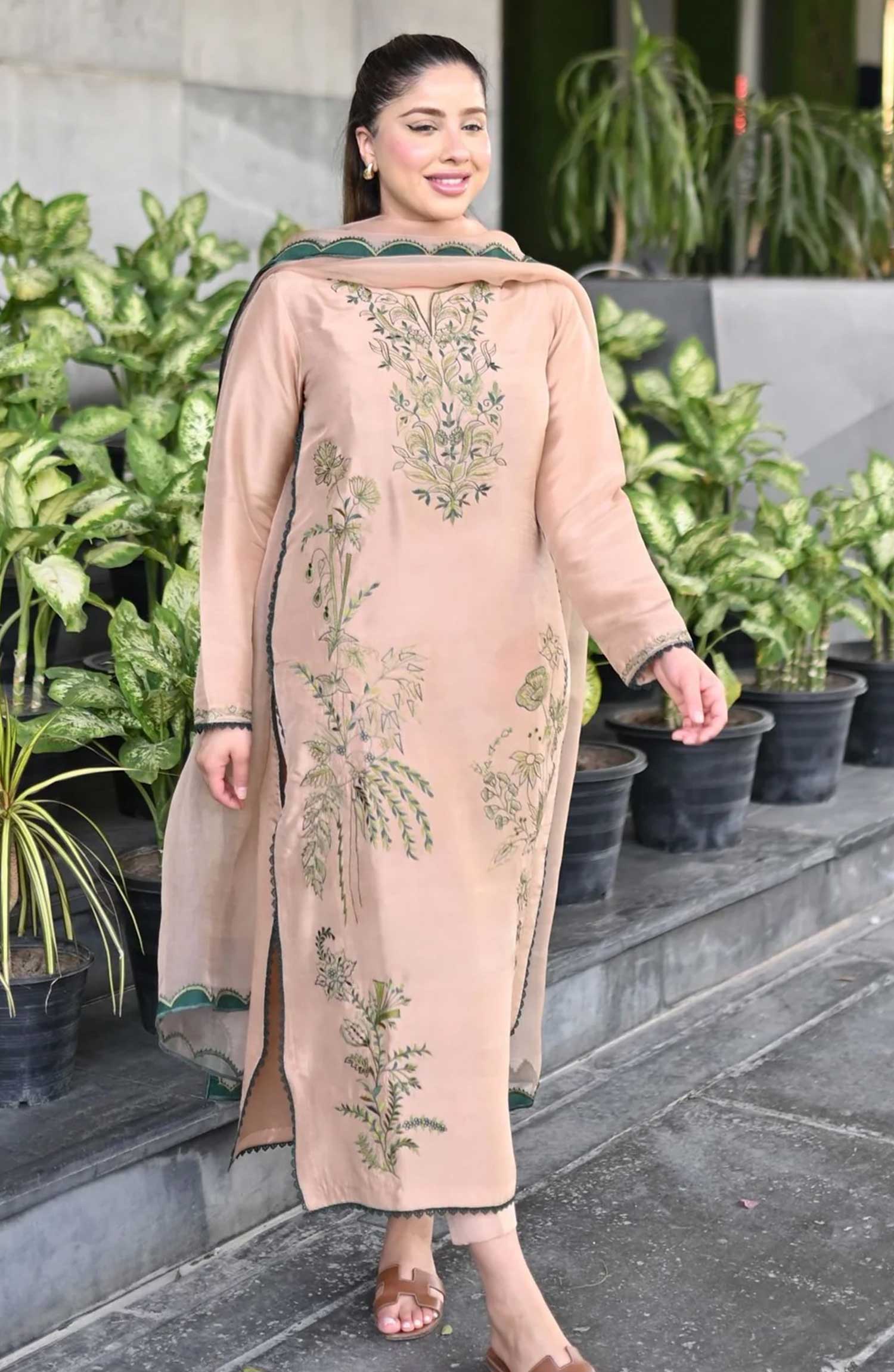 The beautiful caramel beige pure rawsilk shirt has garden greens embroidery on it and a sleeker long cut paired with straight pants and organza dupatta which has green appliqué scalloped on the borders.