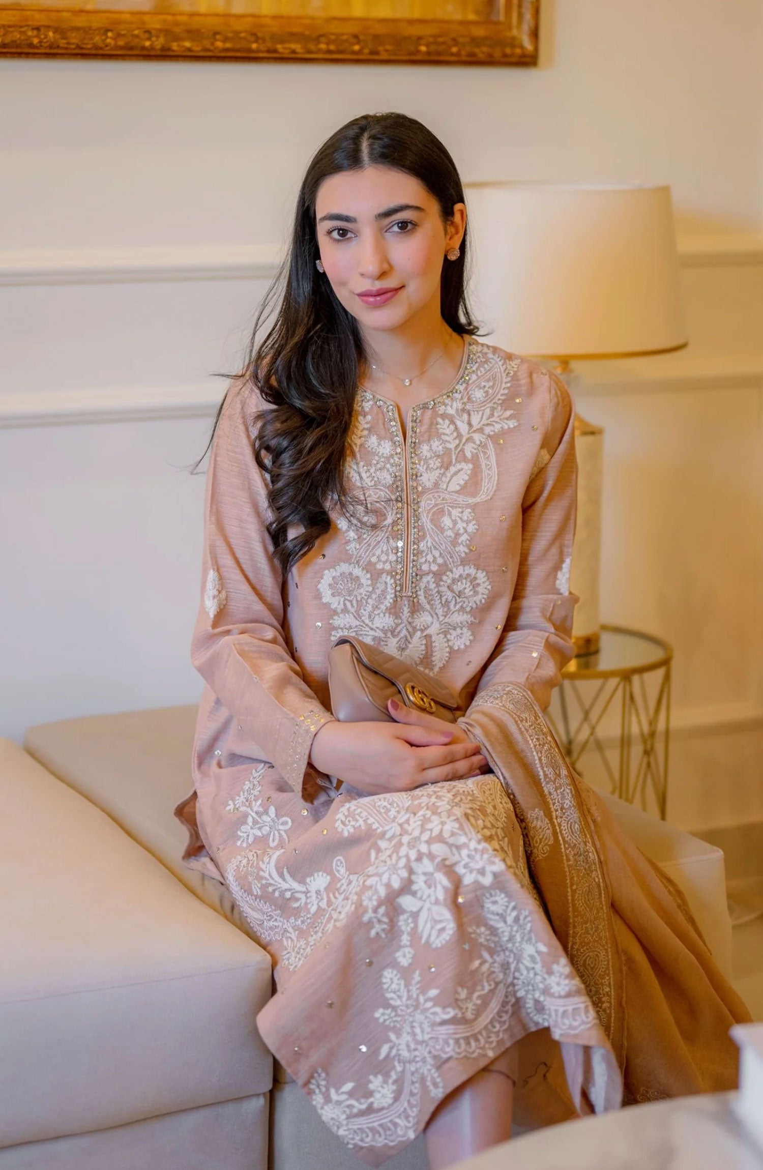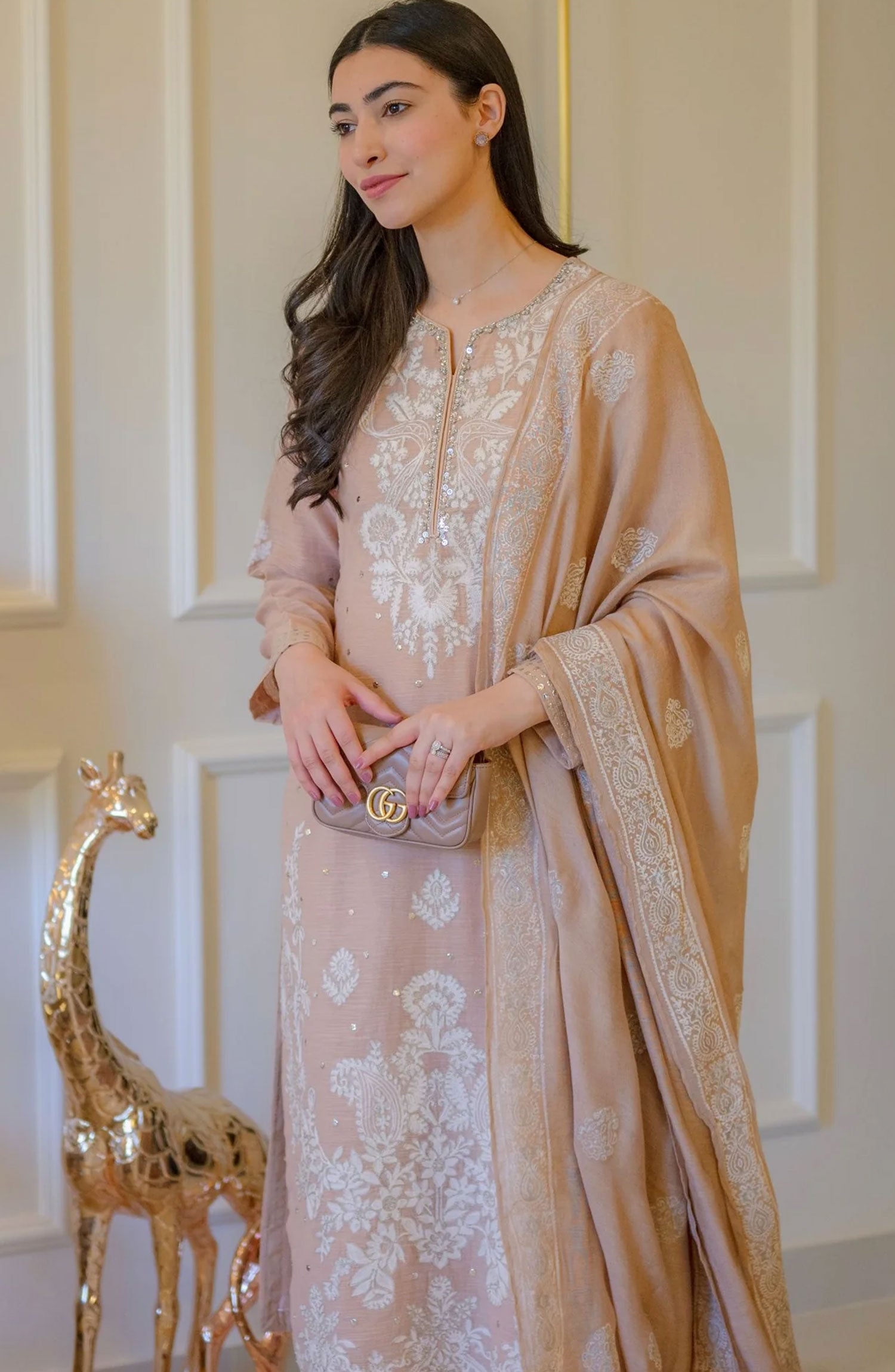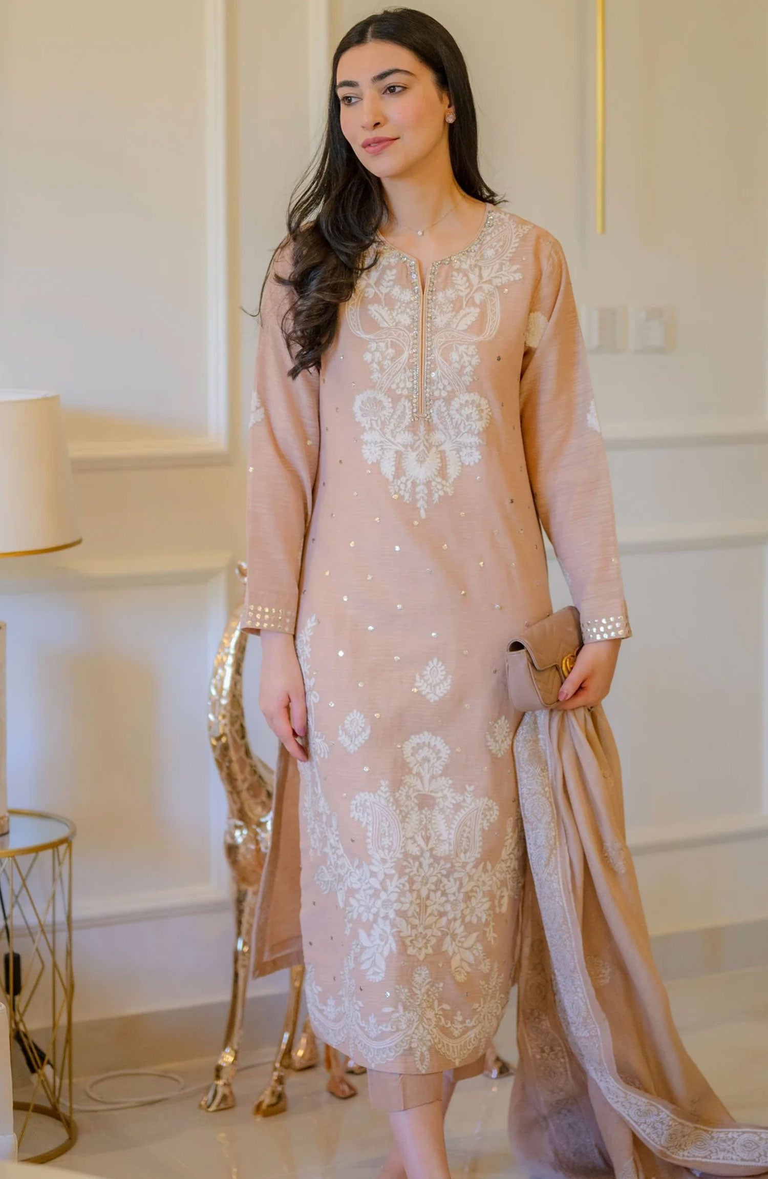 Home Luna Edit By Hues Atelier Embroidered Raw Silk Stitched 3 Piece - Nude And White - HA25L - Festive Collection