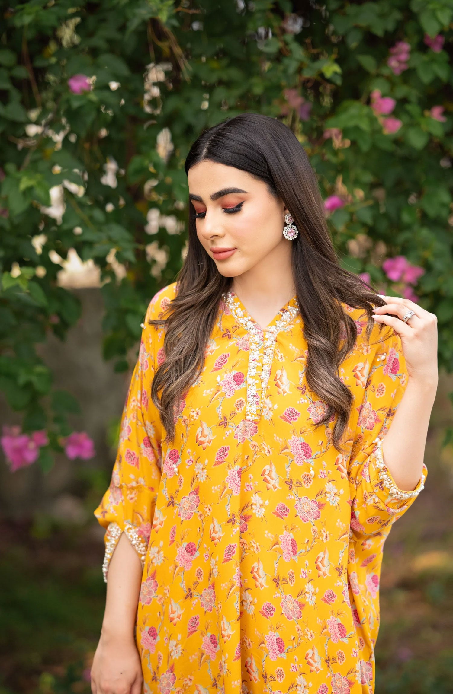 Kaftan styled long shirt is done on pure printed grip which is hand worked with pearls and crystals on neck and sleeves. Paired with straight pants.