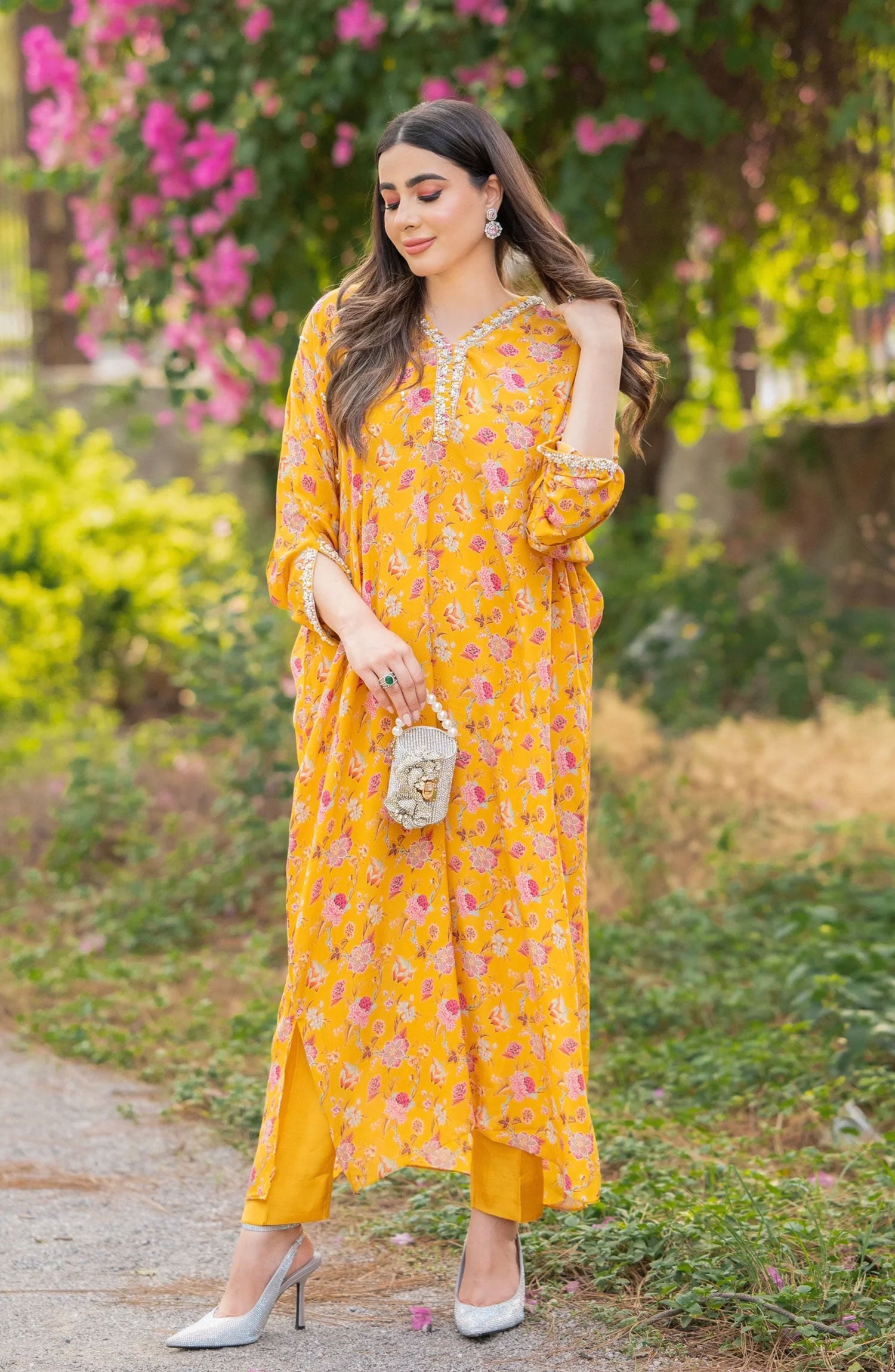Home Luna Edit By Hues Atelier Printed Grip Stitched 2 Piece - Mustard Printed Kaftan Set - HA25L - Festive Collection