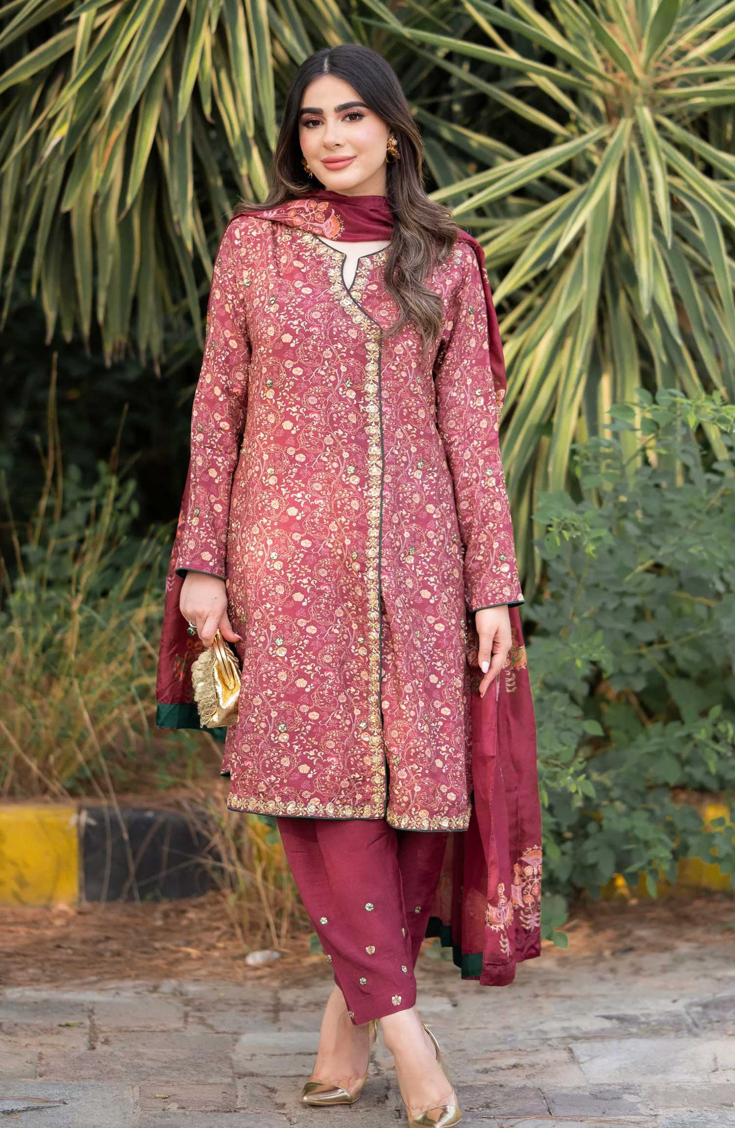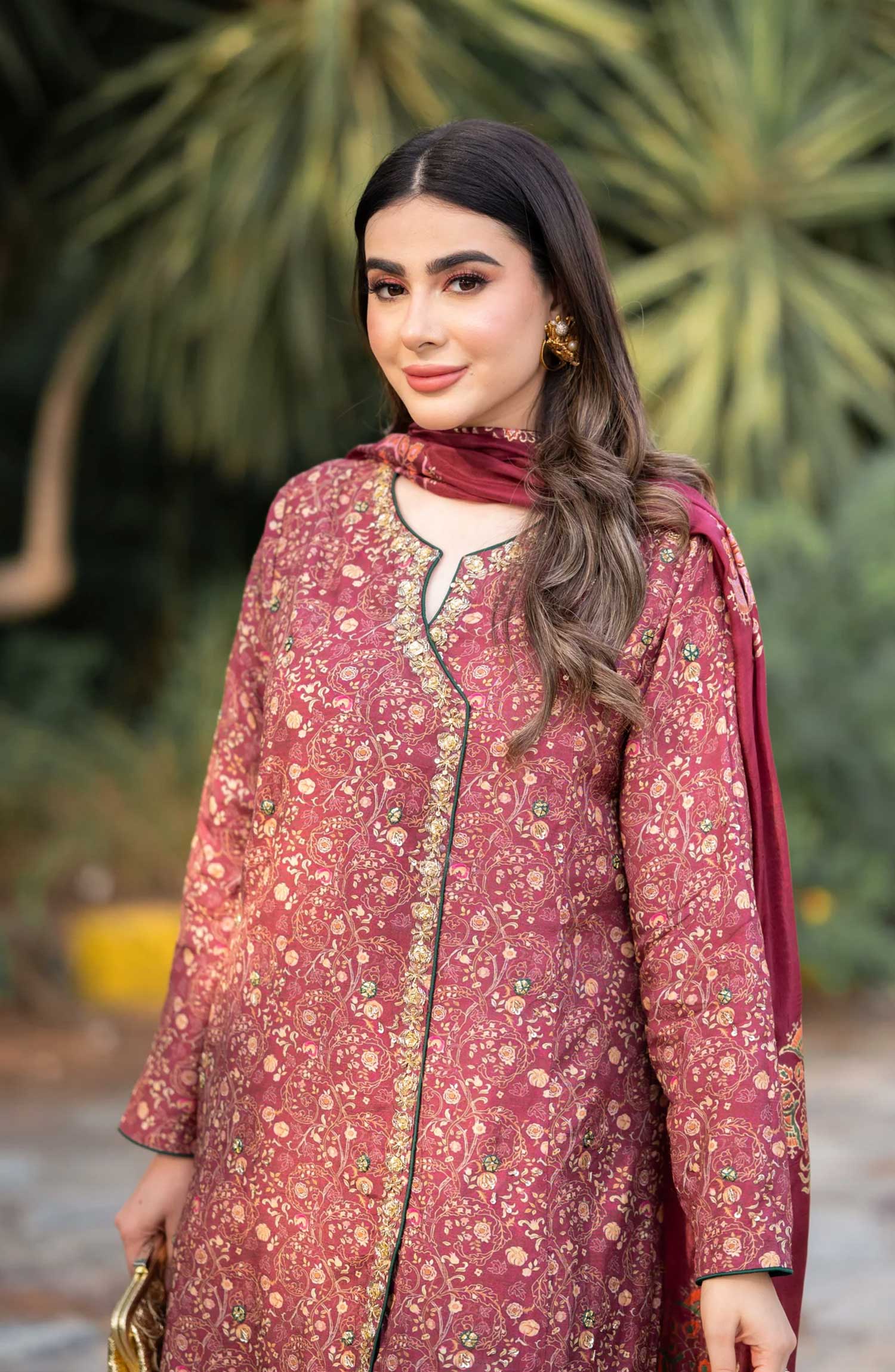 Luna Edit By Hues Atelier Printed Korean Raw Silk Stitched 3 Piece - Deep Maroon Printed Fit - HA25L - Festive Collection