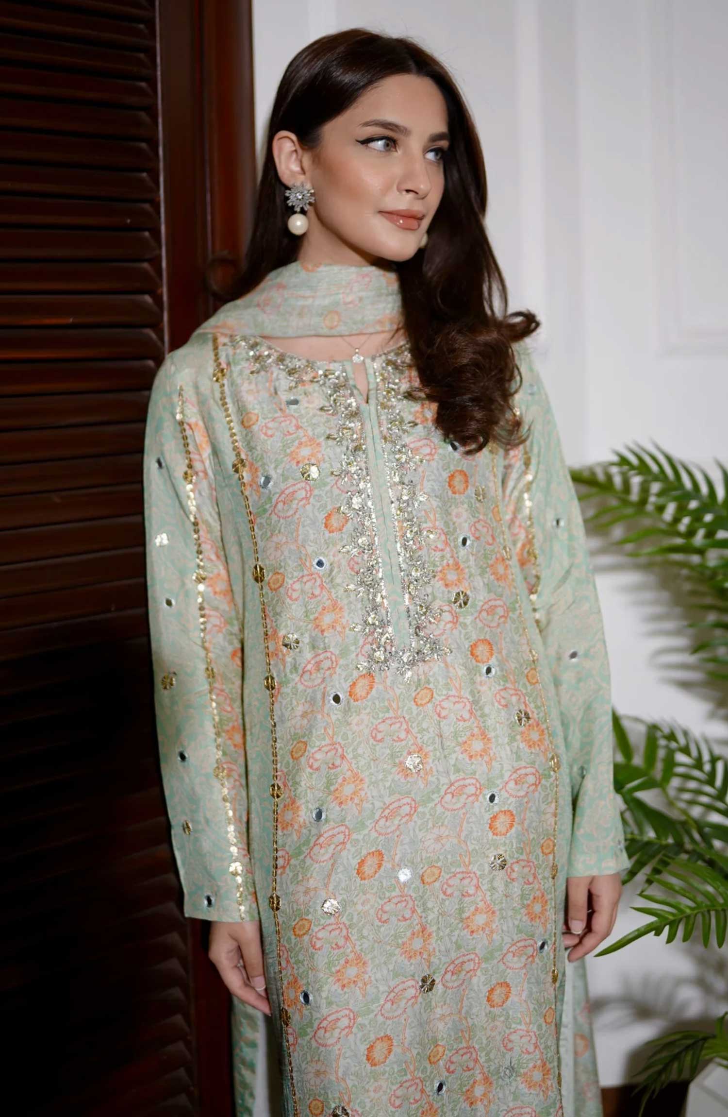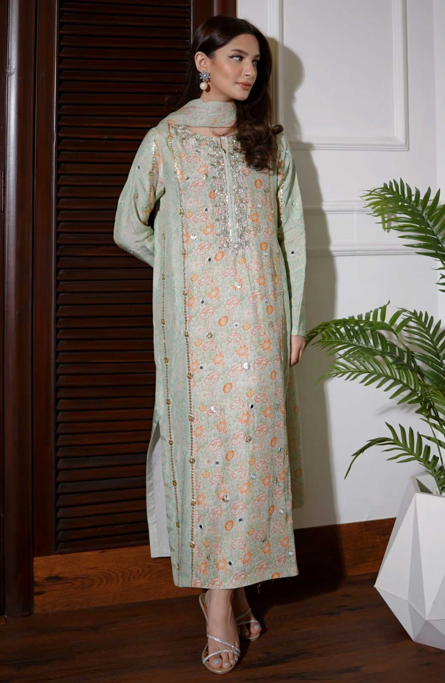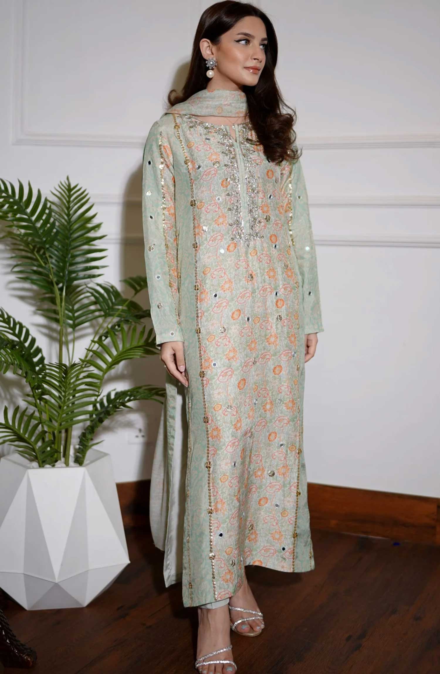 Home Luna Edit By Hues Atelier Printed Korean Raw Silk Stitched 3 Piece - Gota Floral Printed Fit - HA25L - Festive Collection