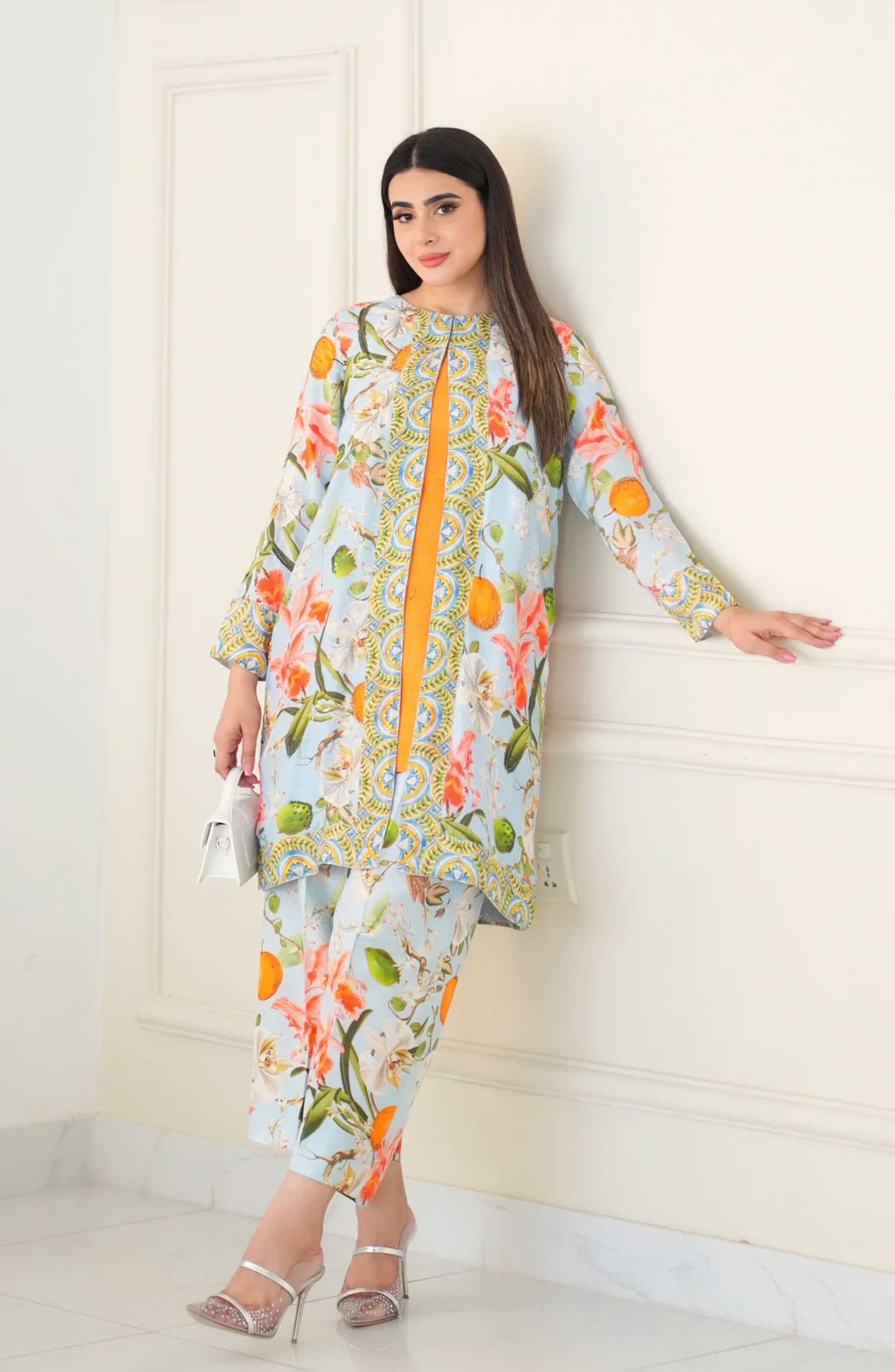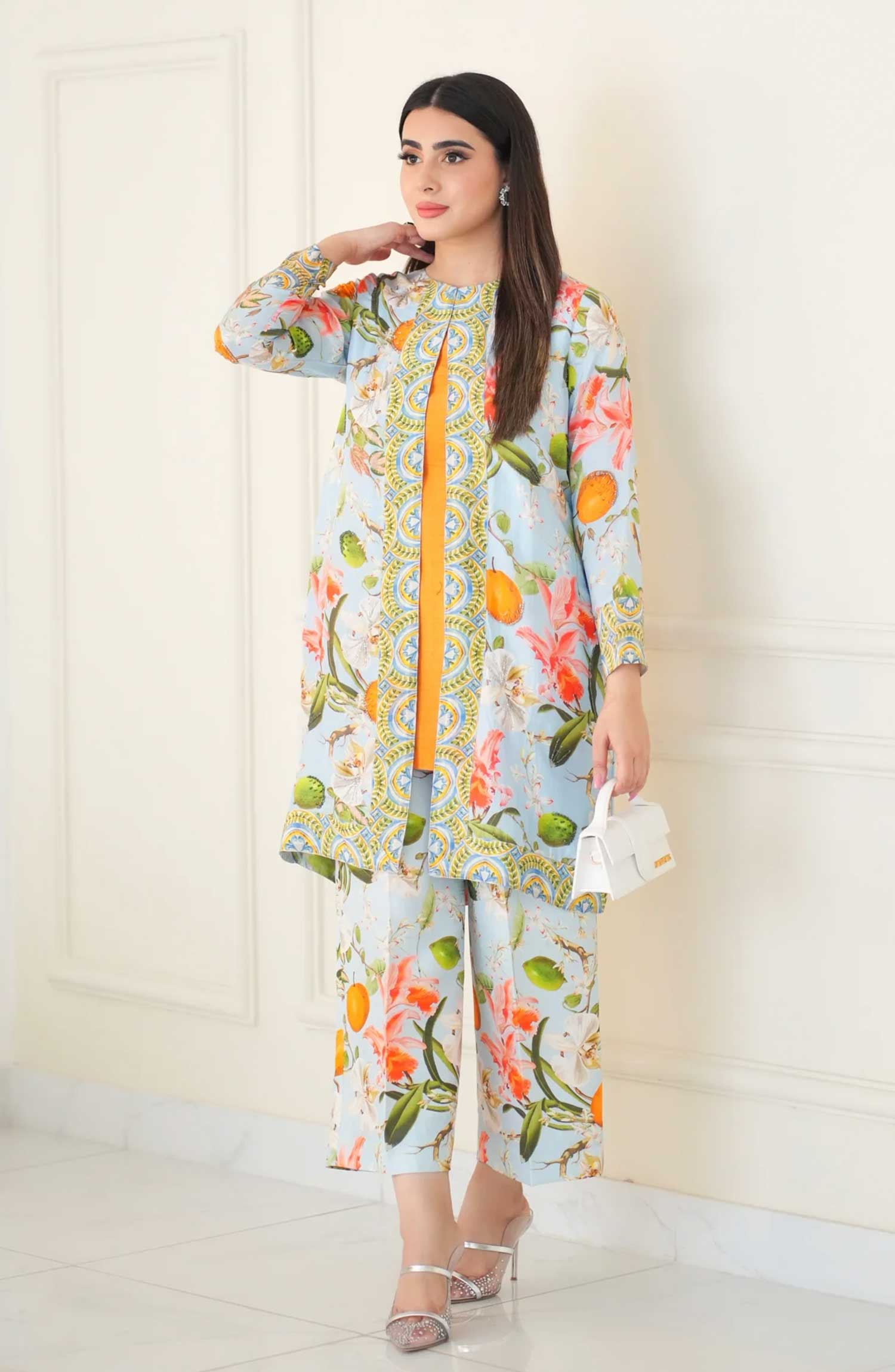 Home Luna Edit By Hues Atelier Printed Raw Silk Stitched 2 Piece - Ice Blue Cord Set - HA25L - Festive Collection