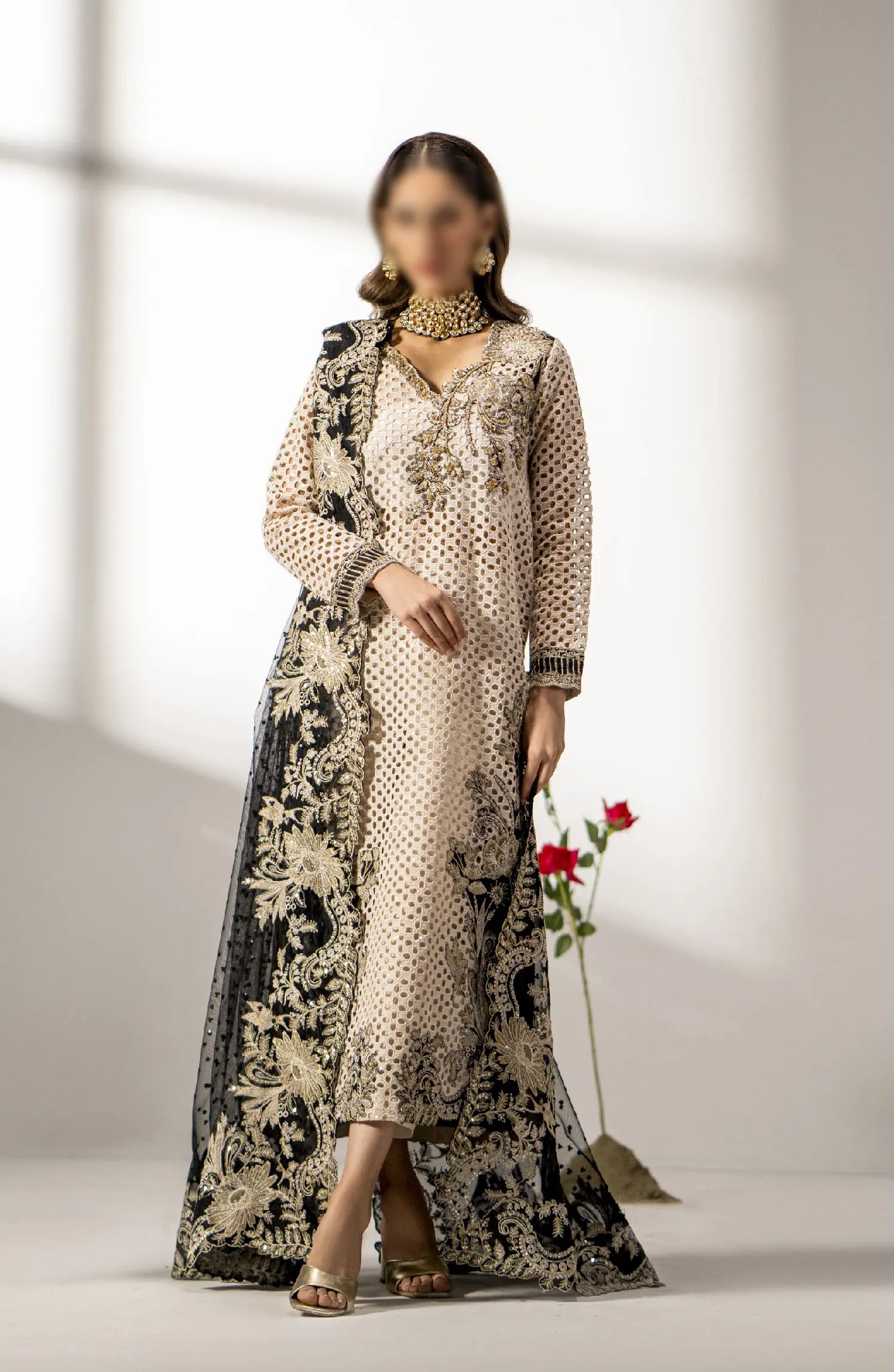 The standard style comes as a long-sleeved kameez with dupatta and trouser/shawlar.
