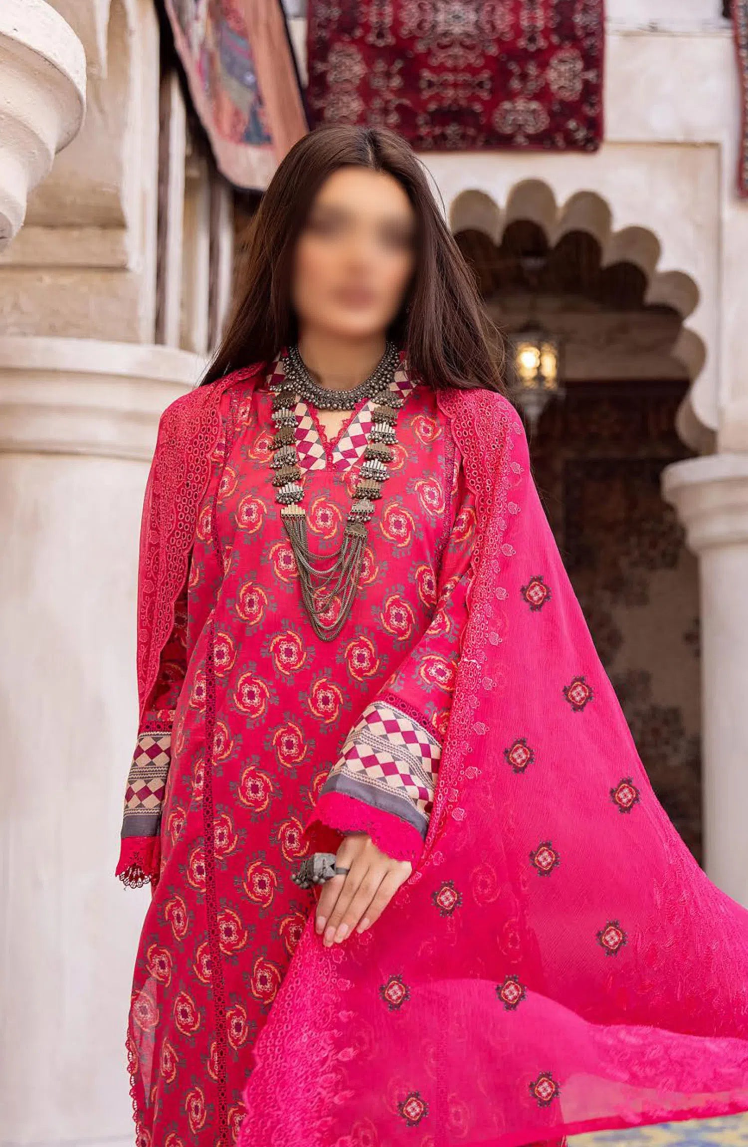 Mahees Digital Printed Lawn Collection 2024 has been styled in the image for photography and illustrative purposes.