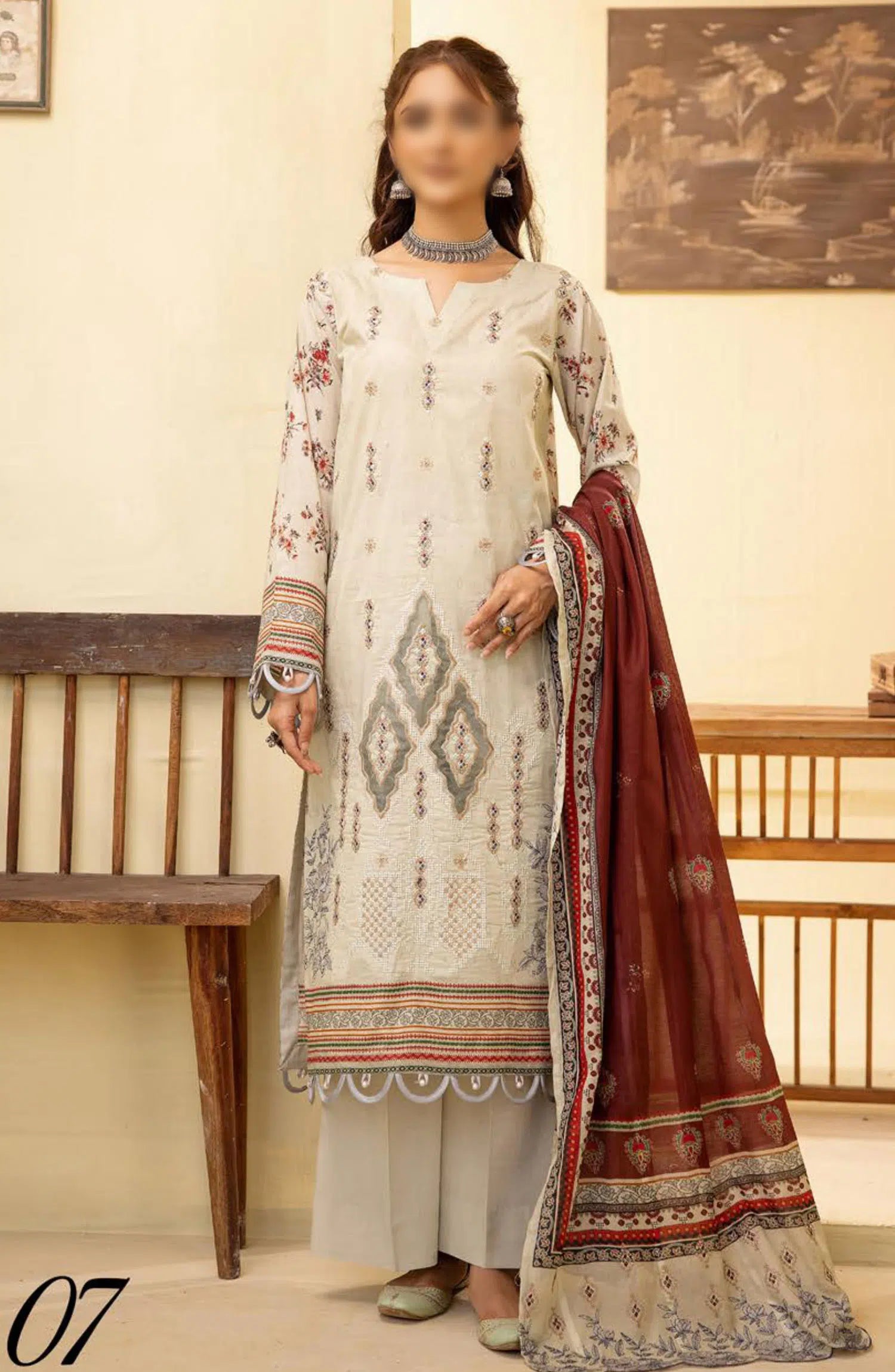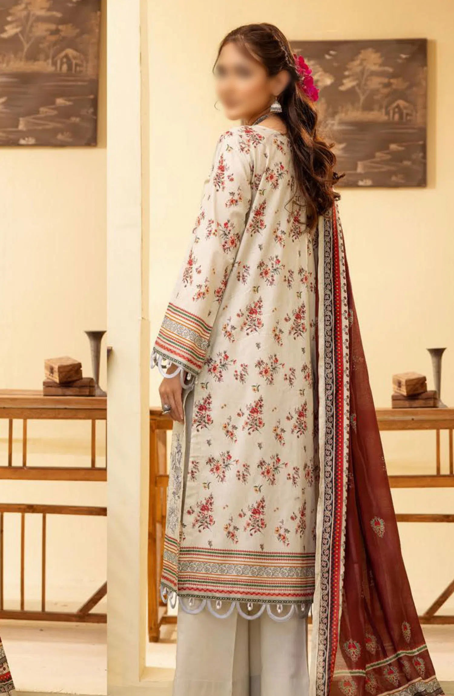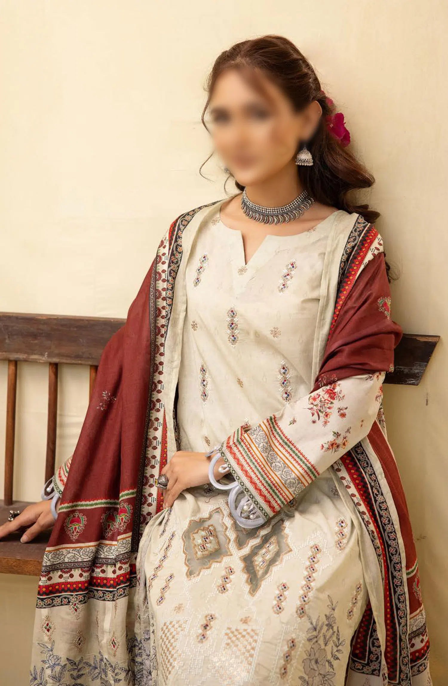 Mahees Ghazal Embroidered Lawn with Emb Voile Dupatta Collection has been styled in the image for photography and illustrative purposes.