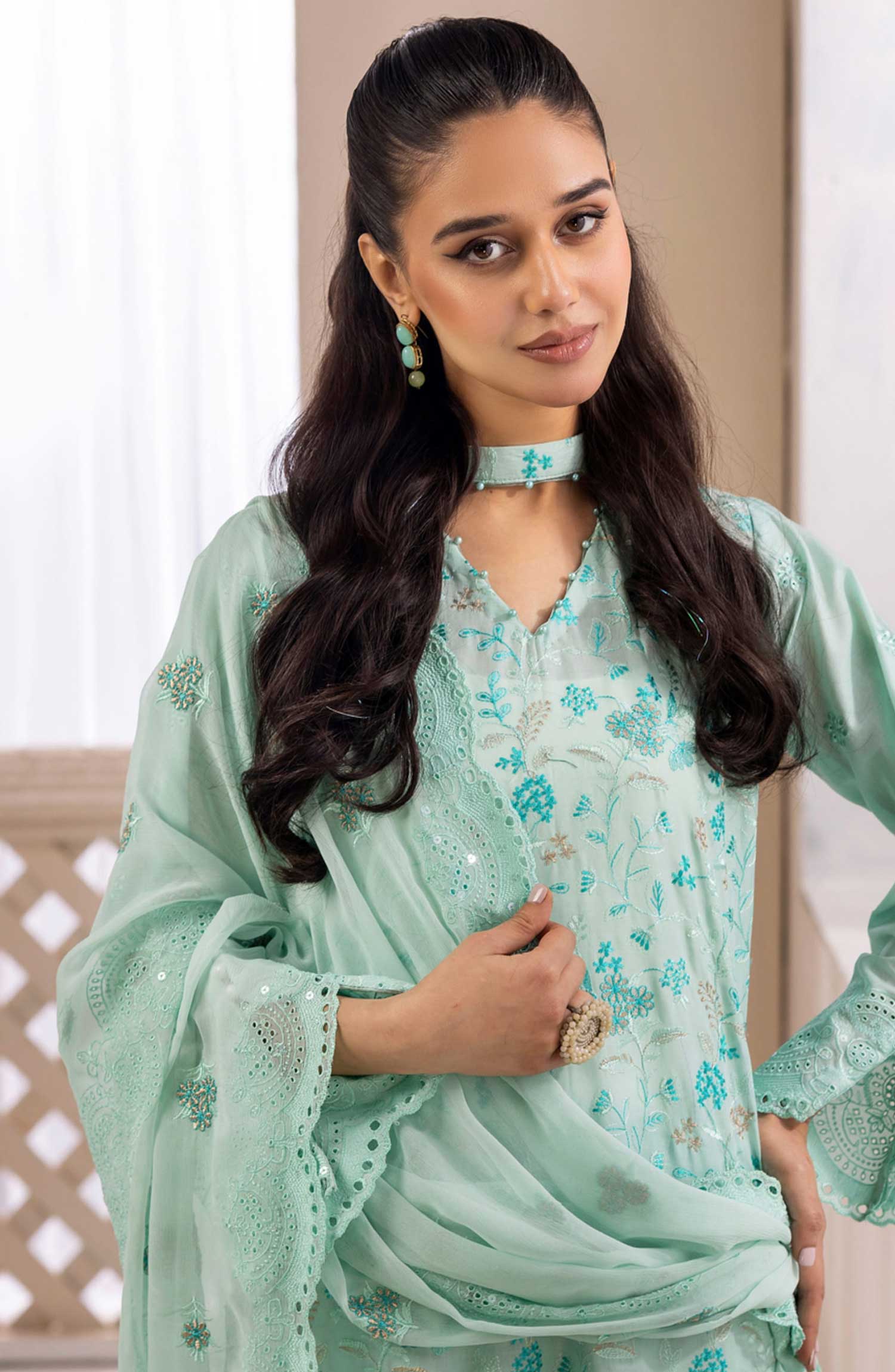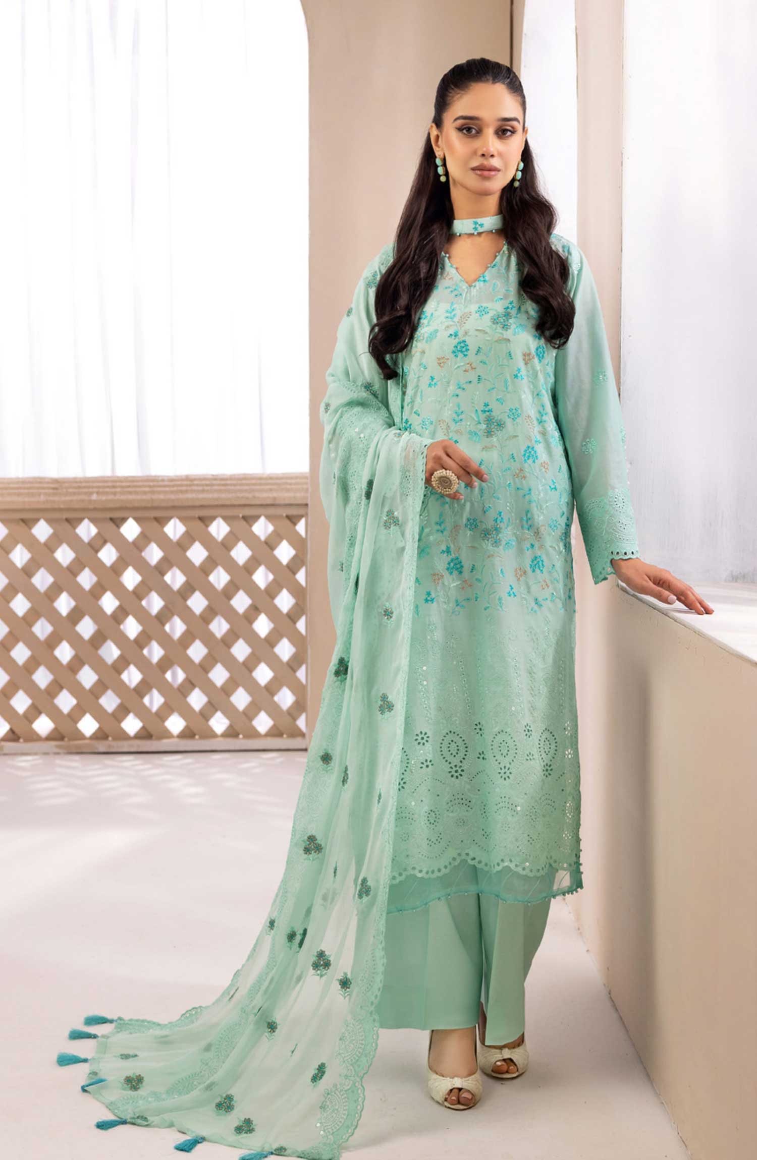 Modest Embroidered Chiffon Stitched 3 Piece Suit - 9740-Grn - MOD25PRF - Green - Festive Girls Collection
