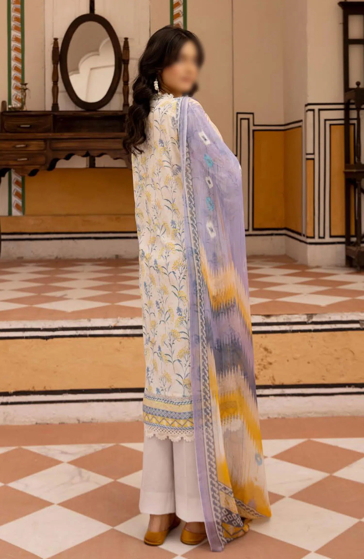 Mahees Printed Chikankari Lawn Collection By Riaz Arts has been styled in the image for photography and illustrative purposes.