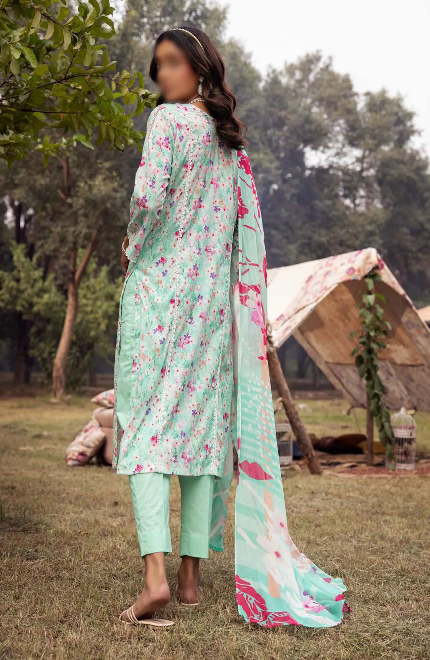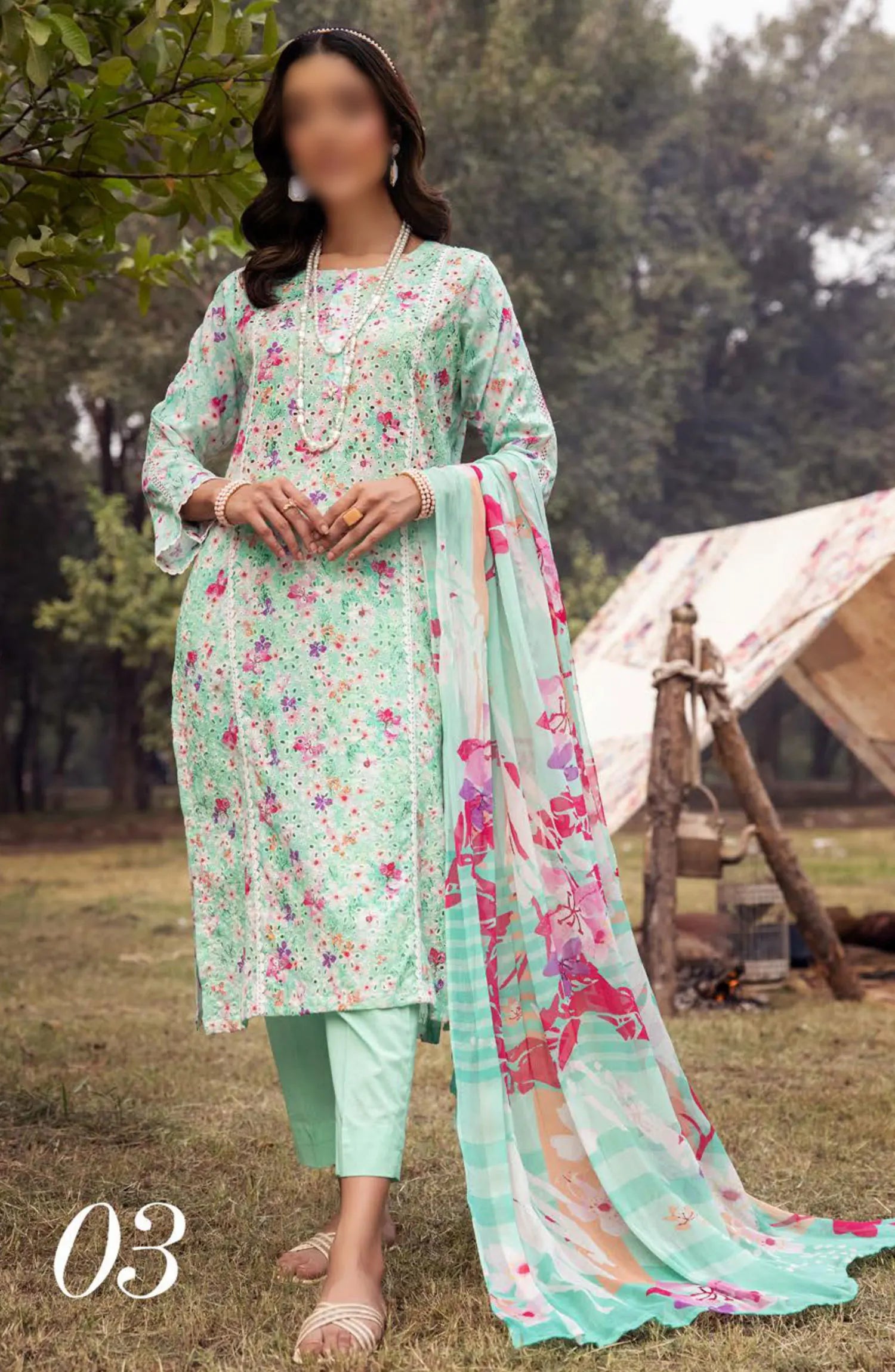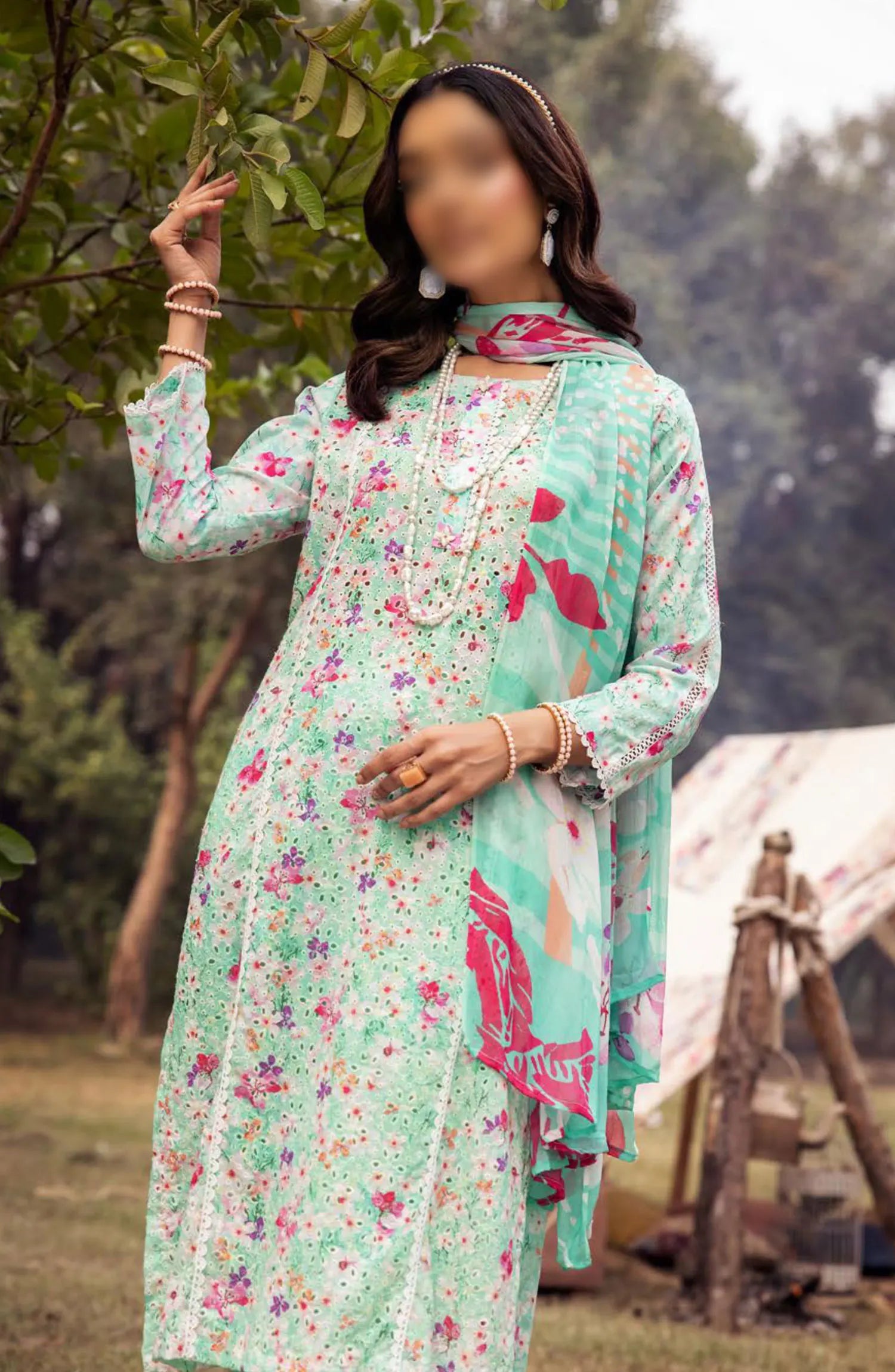 Mahees Printed Chikiankari Lawn Collection Vol 06 2024 has been styled in the image for photography and illustrative purposes.