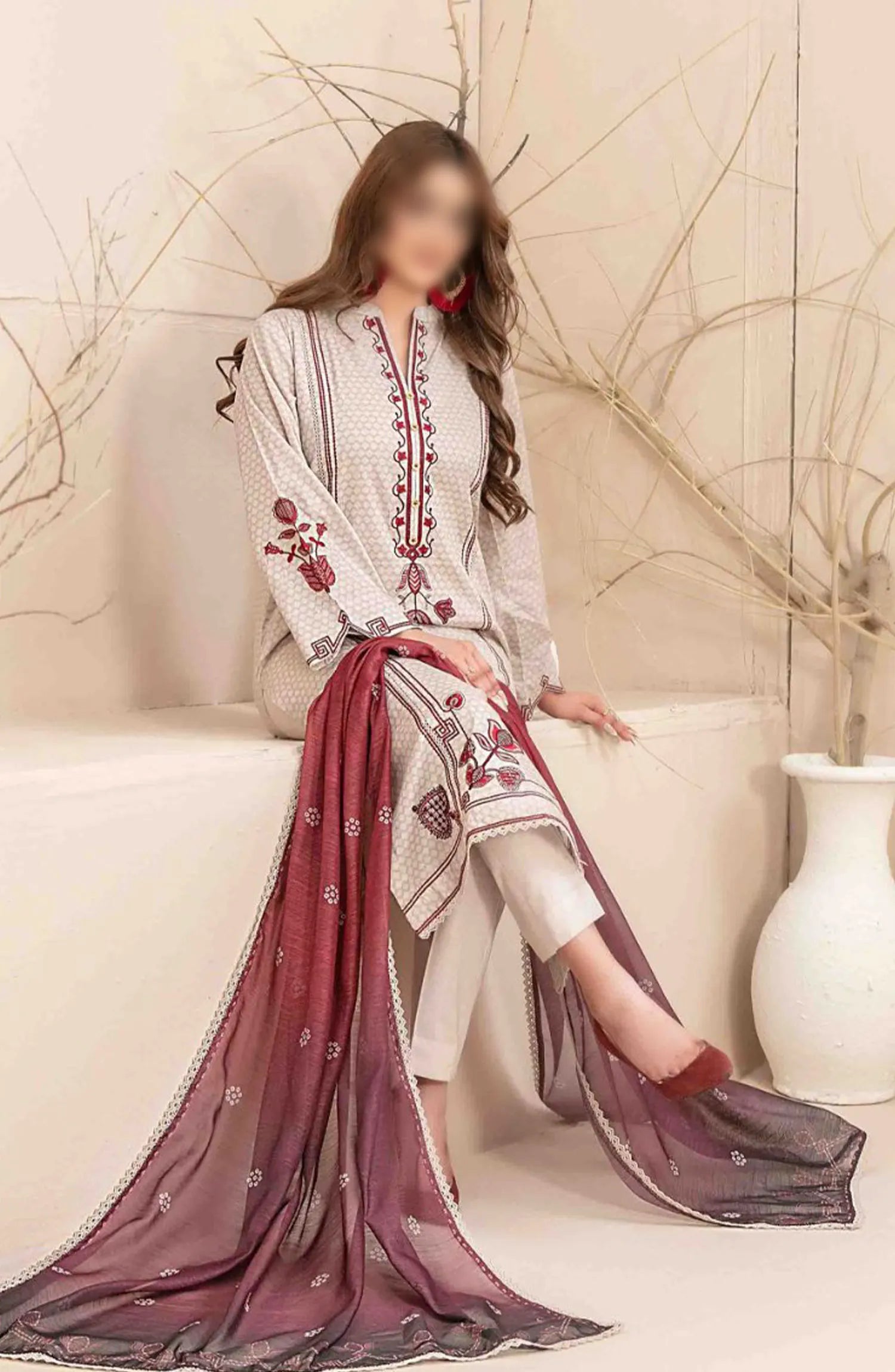 Mahlaa VOL II - Stitched Embroidered Lawn Collection has been styled in the image for photography and illustrative purposes.