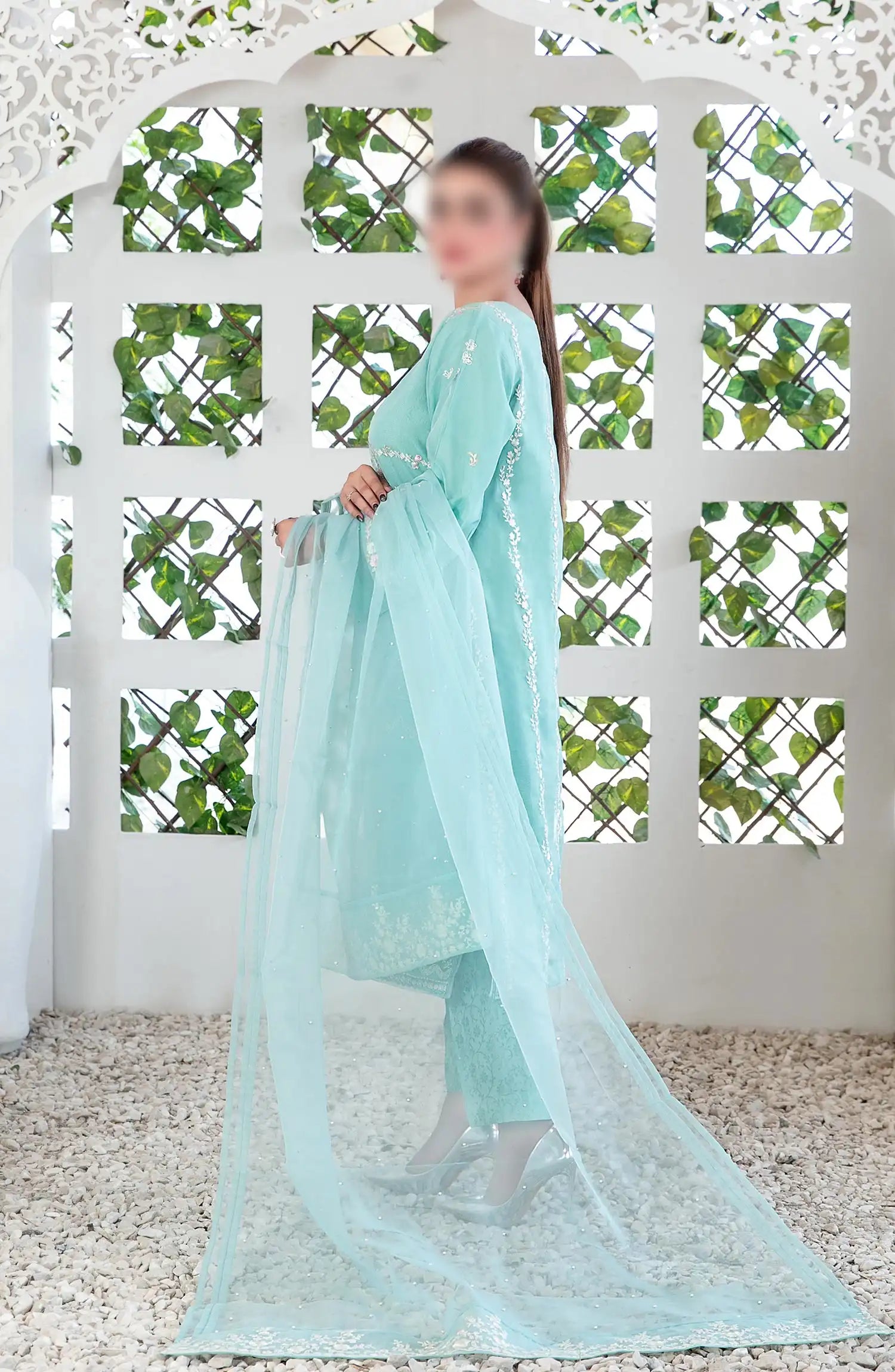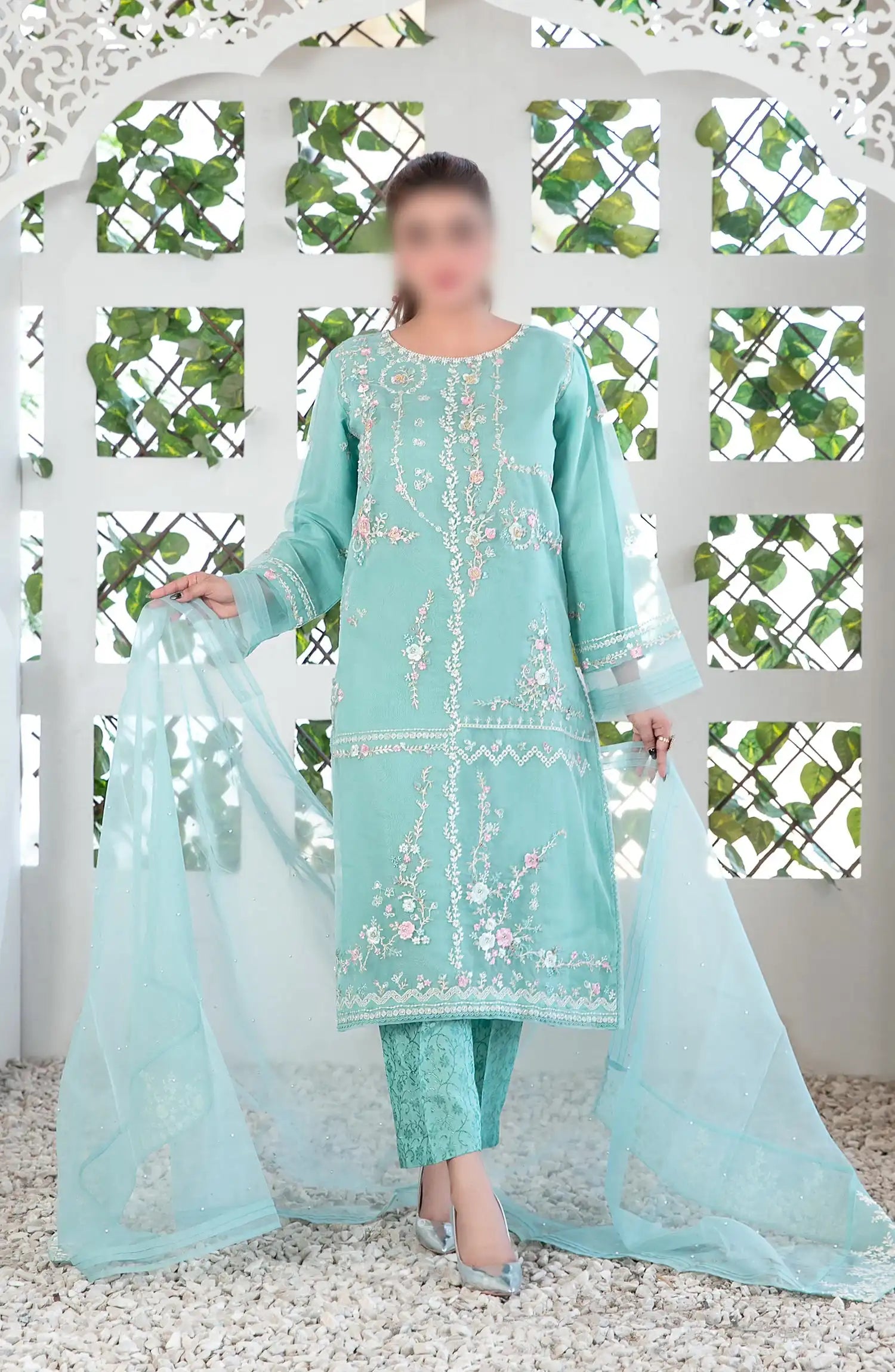 Manha - Fancy Stitched Organza Collection has been styled in the image for photography and illustrative purposes.