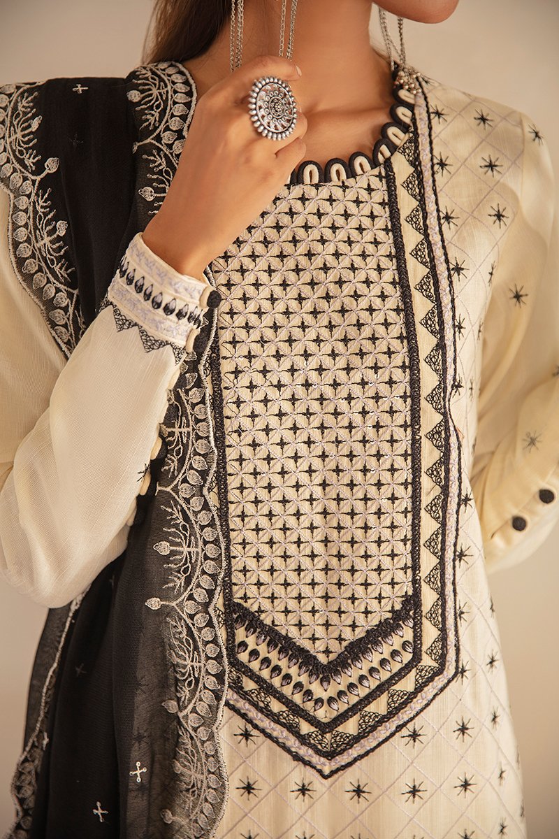 Note: Cross Stitch Manzil Khaddar and Linen Unstitched Collection has been styled in the image for photography and illustrative purposes.