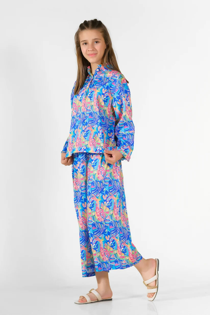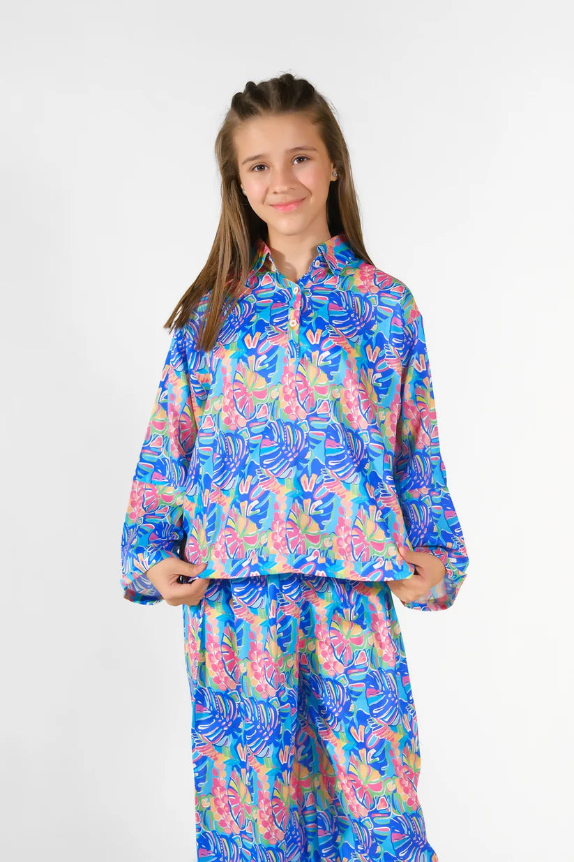 Introducing the captivating "Marine Vines" ensemble, a delightful fusion of oceanic hues and leafy prints designed especially for girls. This short shirt embodies the tranquil beauty of the sea, with its gentle waves of blue and intricate leafy patterns evoking the serenity of an underwater oasis. The soft fabric whispers of ocean breezes, while the playful cut adds a touch of youthful charm. Whether paired with shorts for a day at the beach or layered with a skirt for a casual outing, the "Marie Vines" promises to infuse every moment with the refreshing spirit of coastal living.