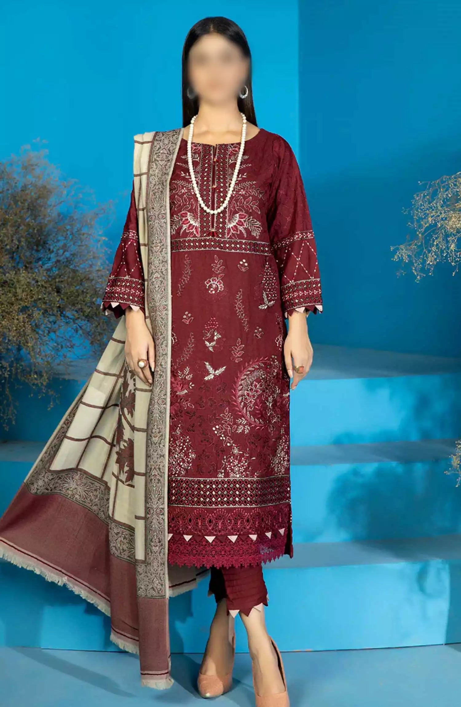 Modest Embroidered Khaddar Stitched 3 Piece Suit - 10050-Mar - MOD25WNT - Maroon - Winter Collection