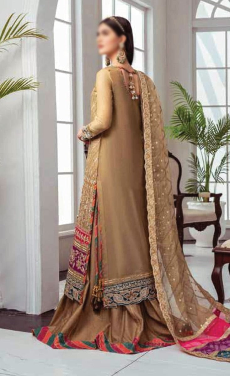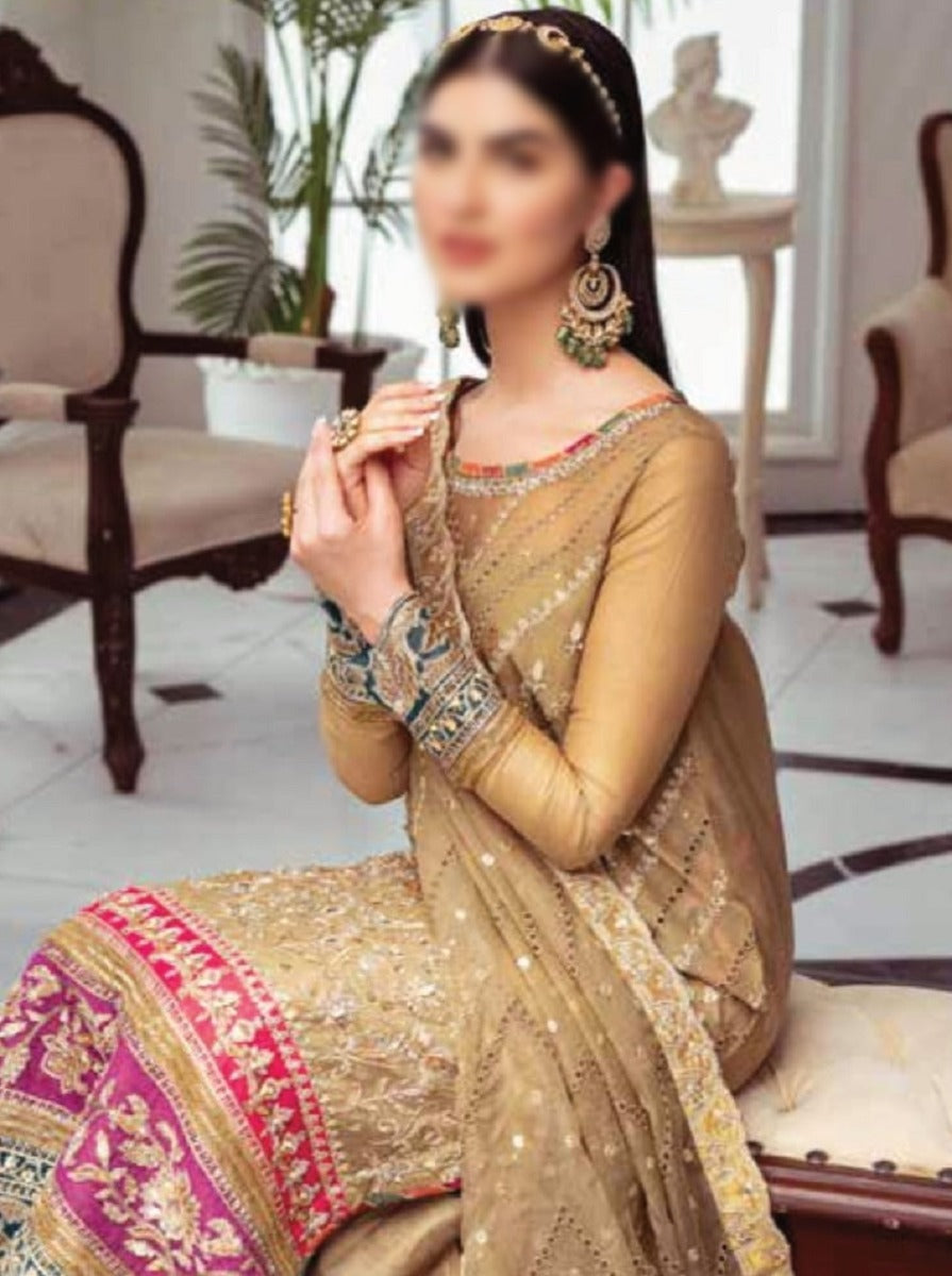 The standard style comes as a long-sleeved kameez with dupatta and trouser/shalwar.