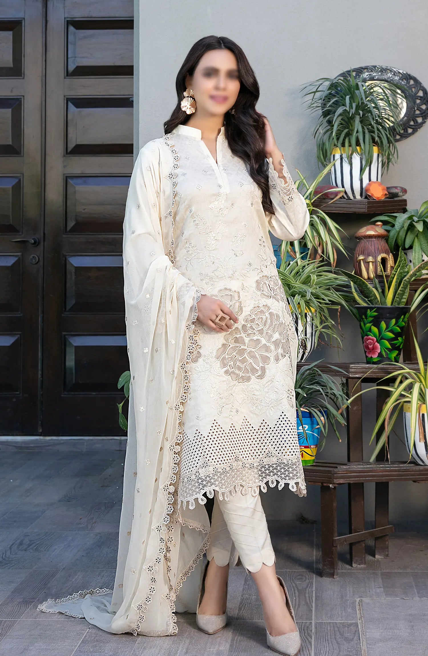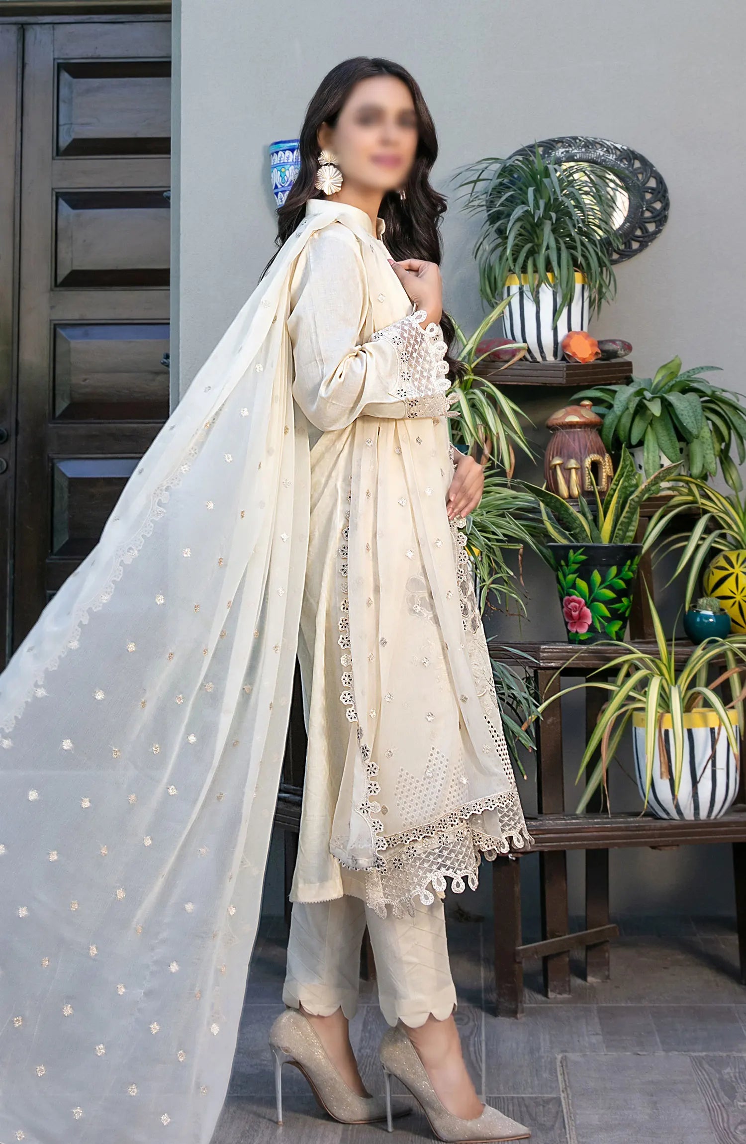 The standard style comes as a long-sleeved kameez with dupatta and trouser/shalwar.