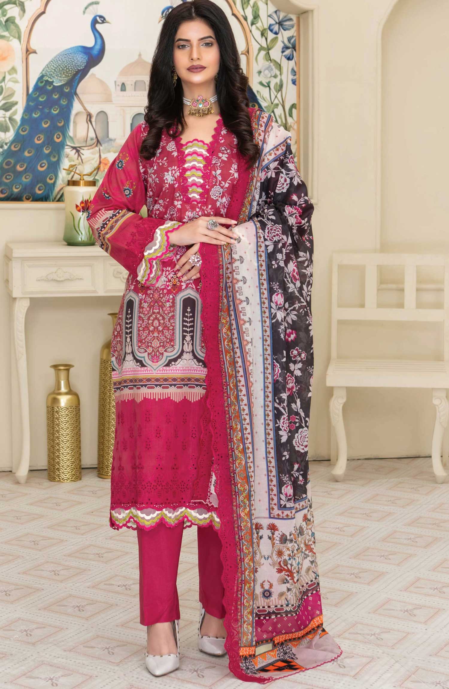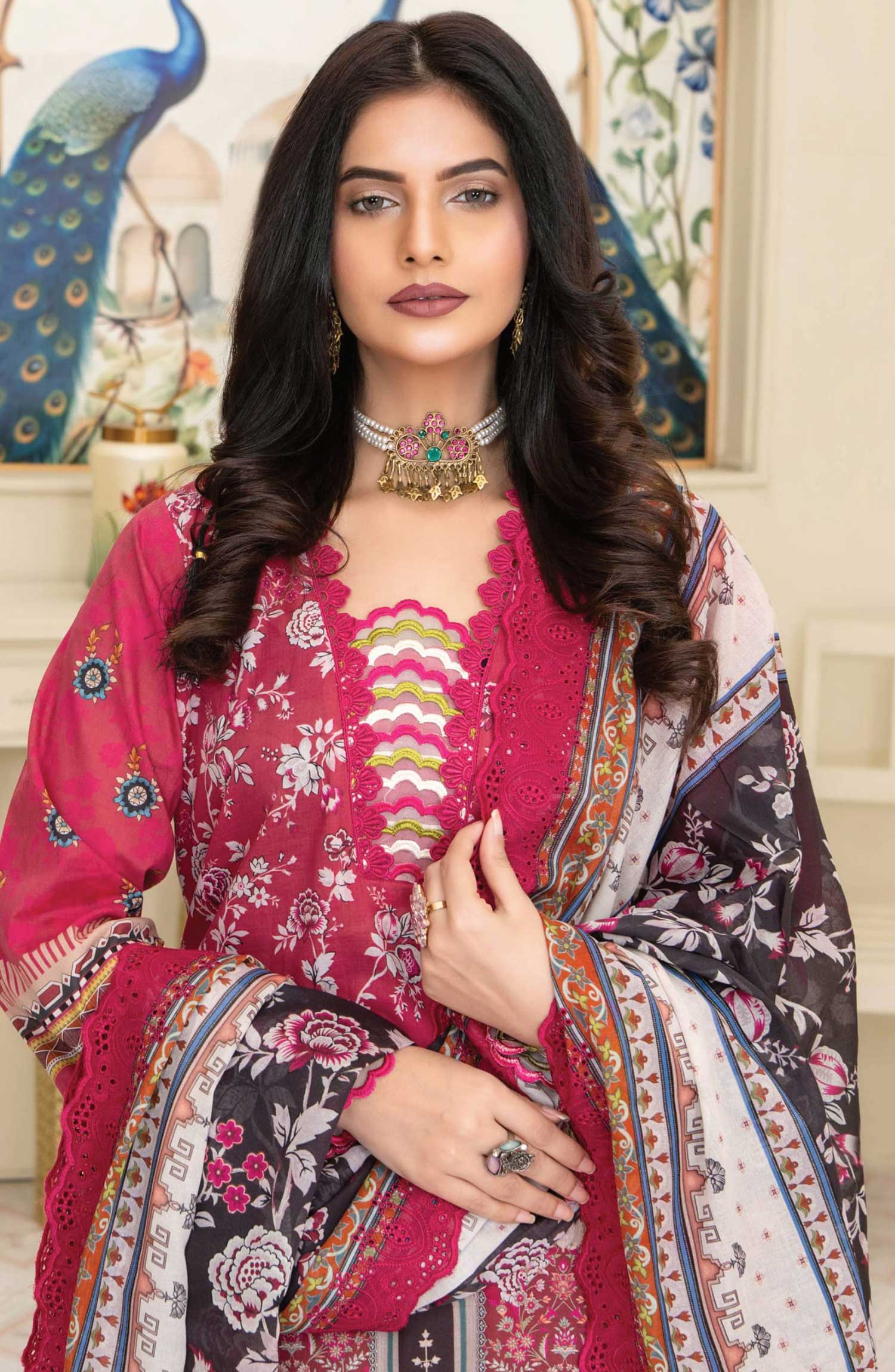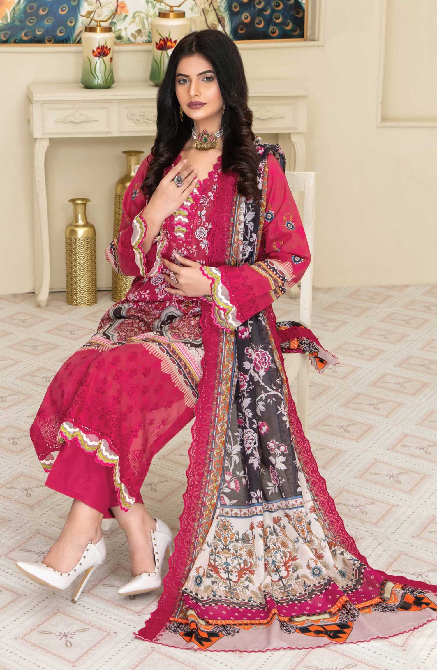 Mashaal Exclusive Digital Printed and Embroidered Lawn Collection by Riaz Arts has been styled in the image for photography and illustrative purposes.