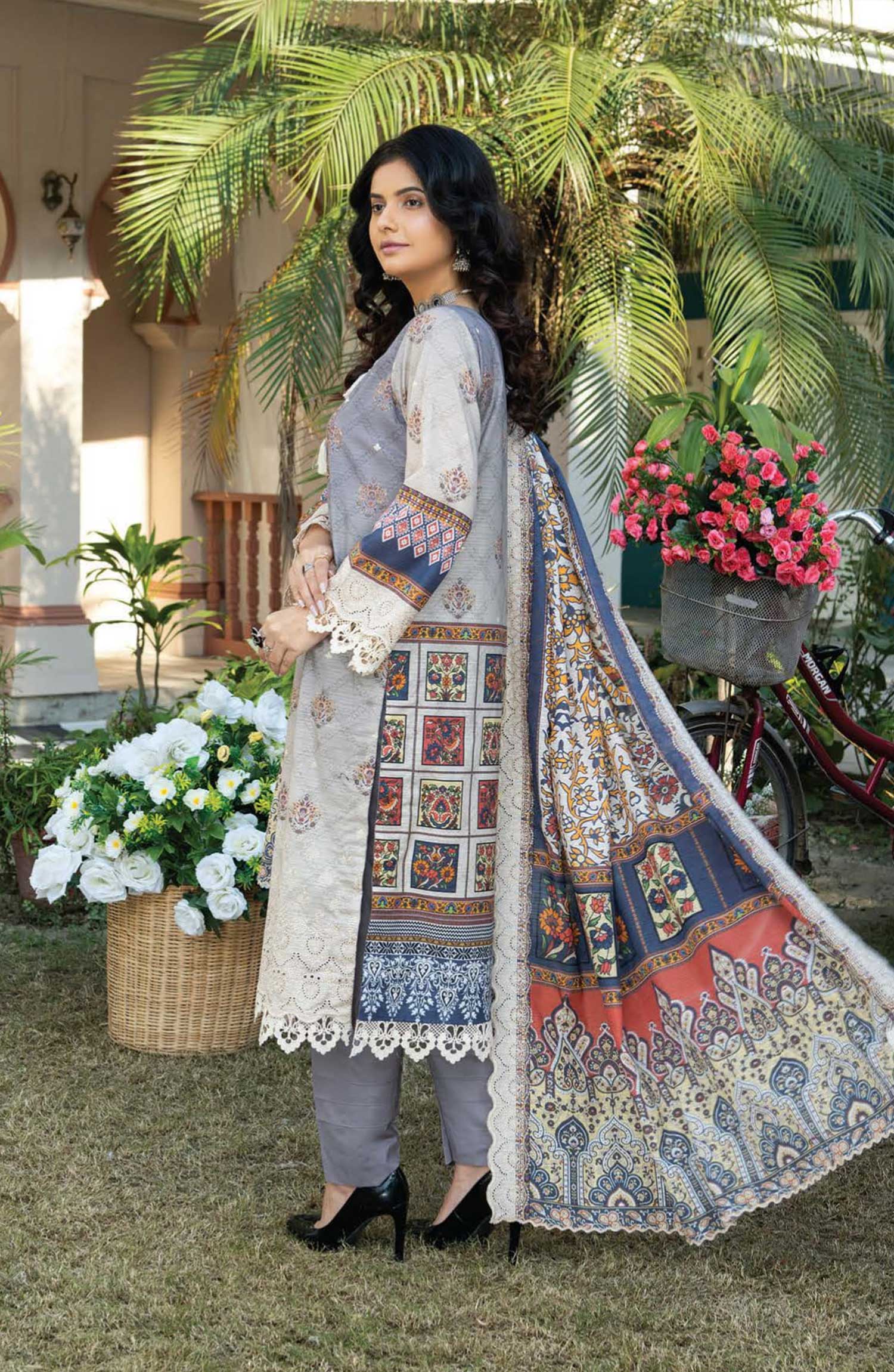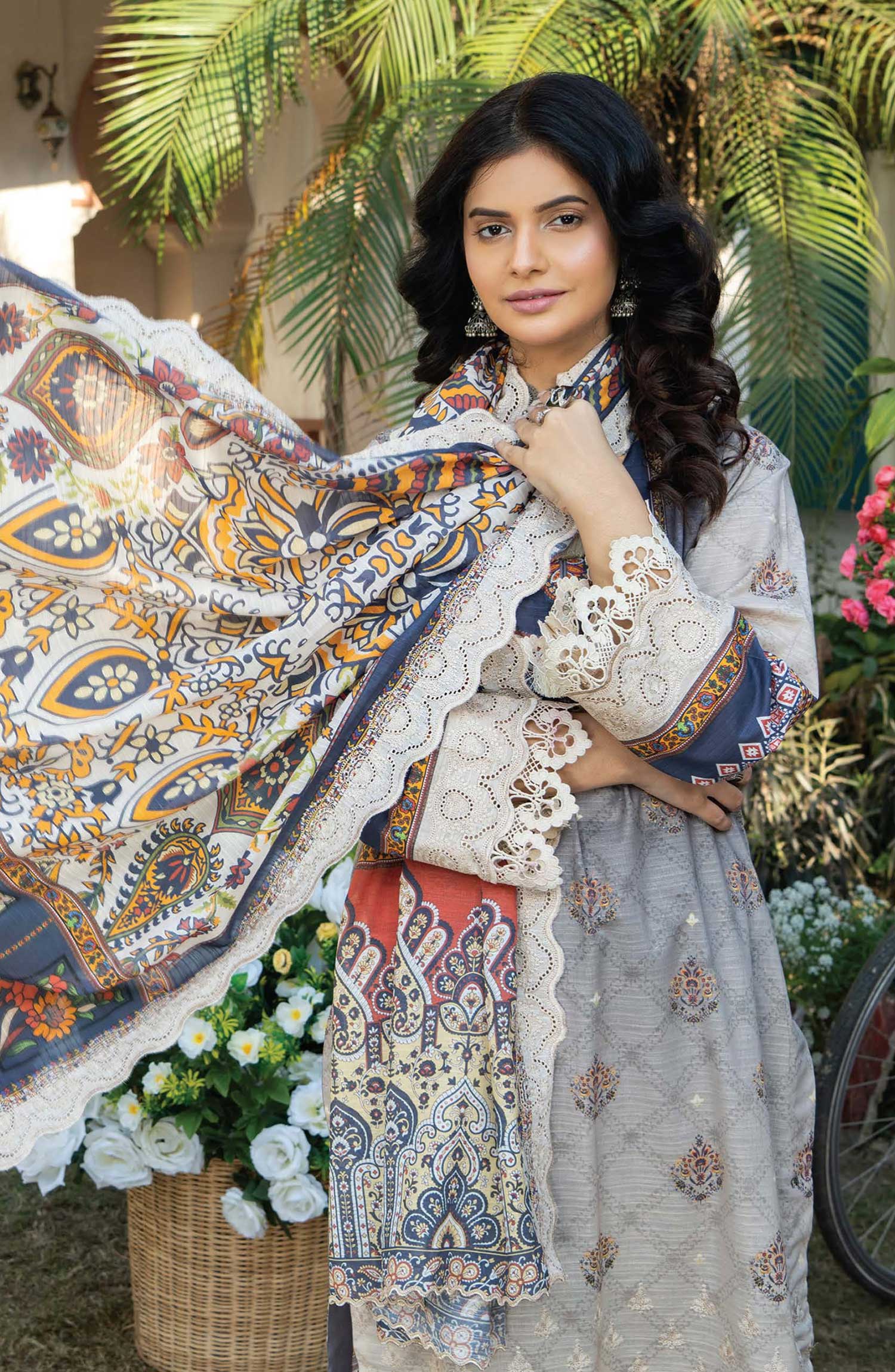 Mashaal Exclusive Digital Printed Embroidered Lawn Collection Vol 02 has been styled in the image for photography and illustrative purposes.