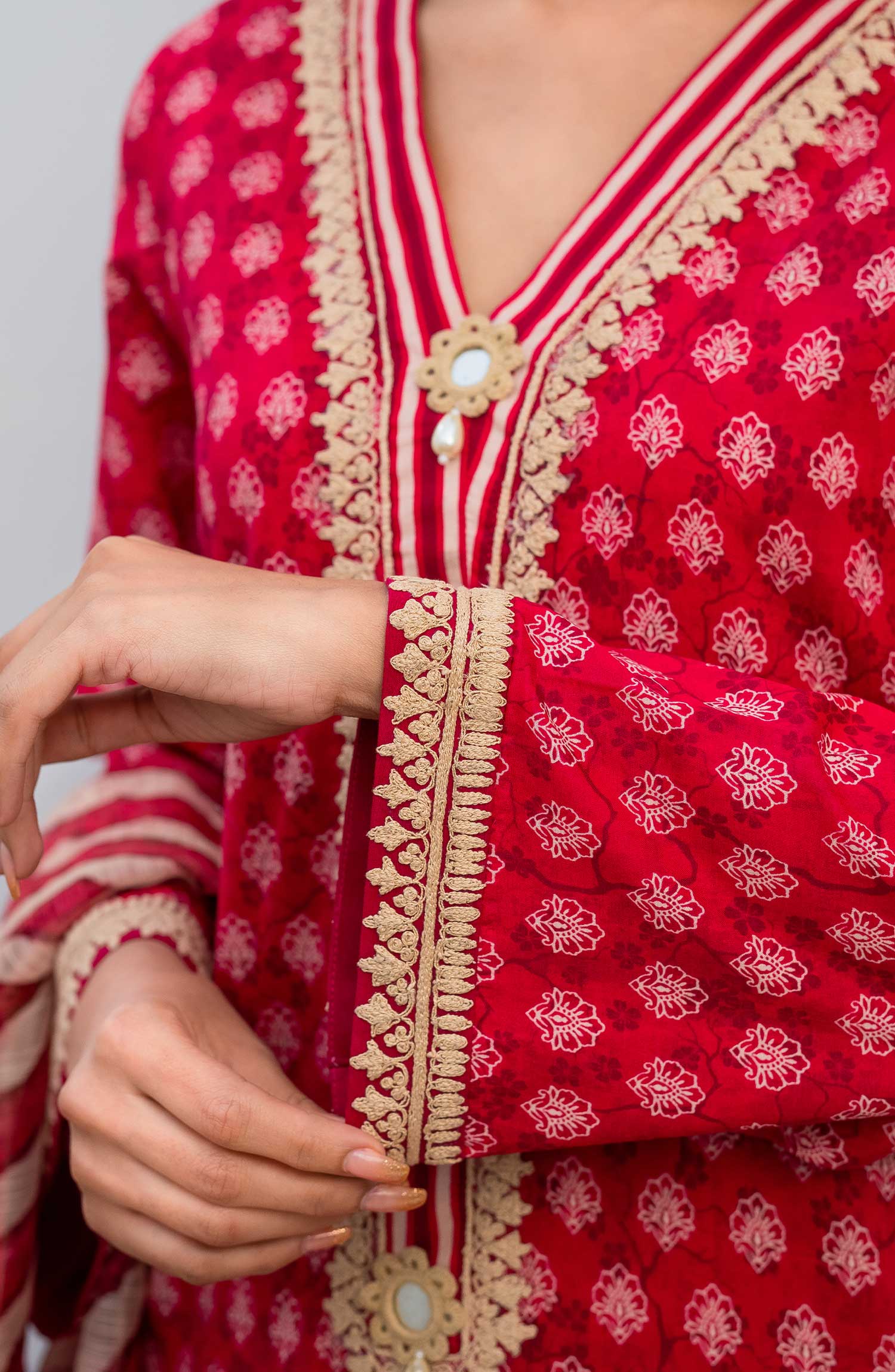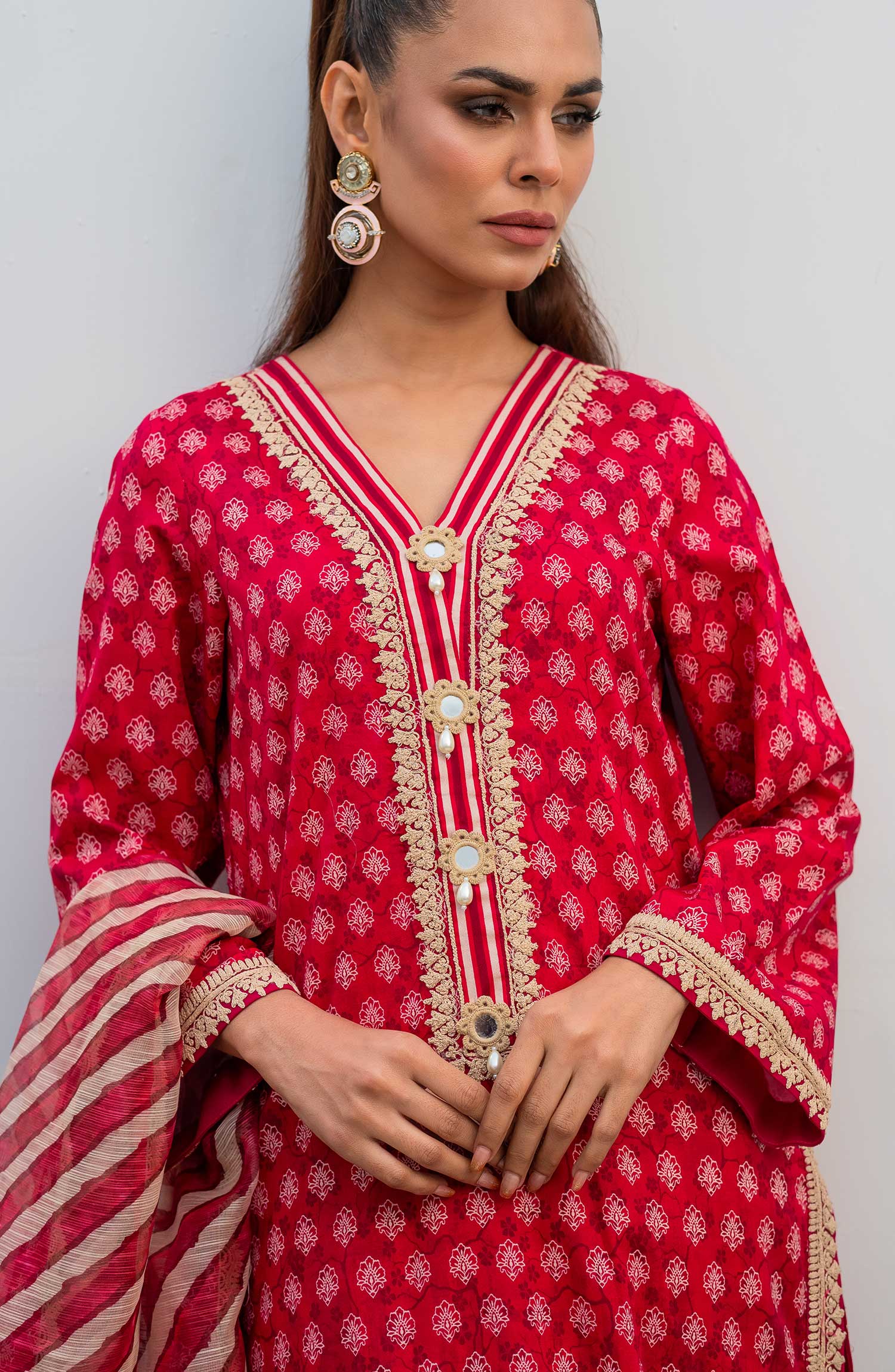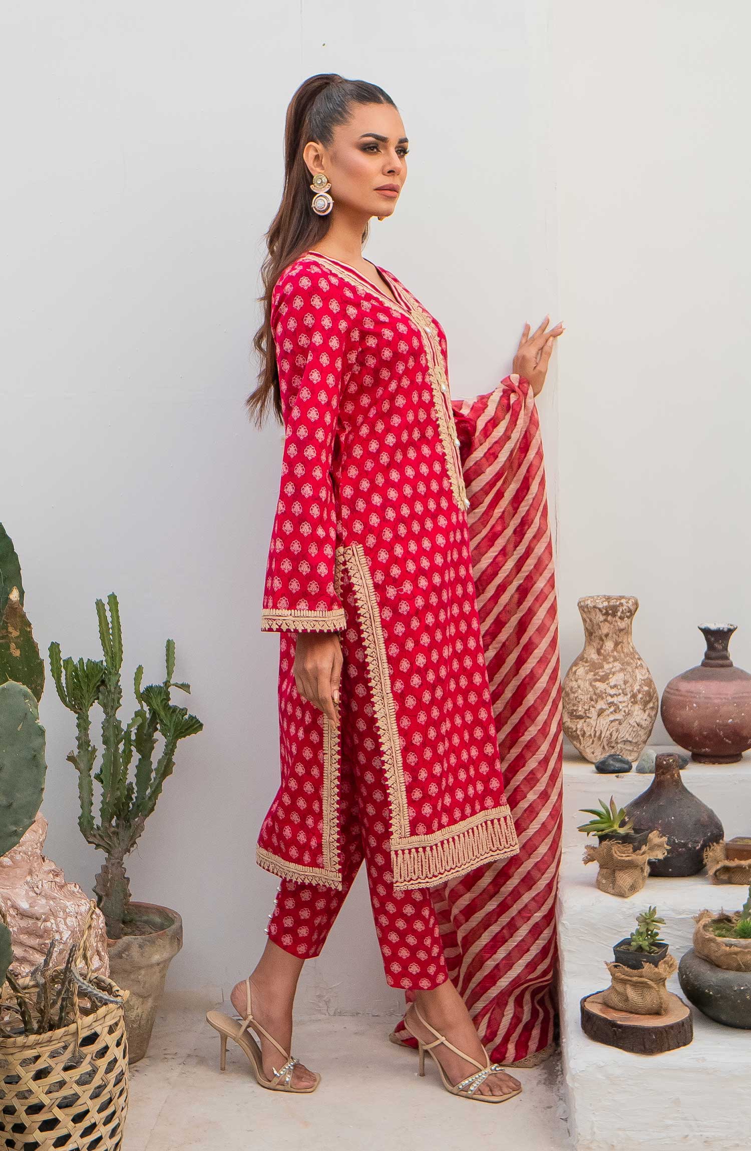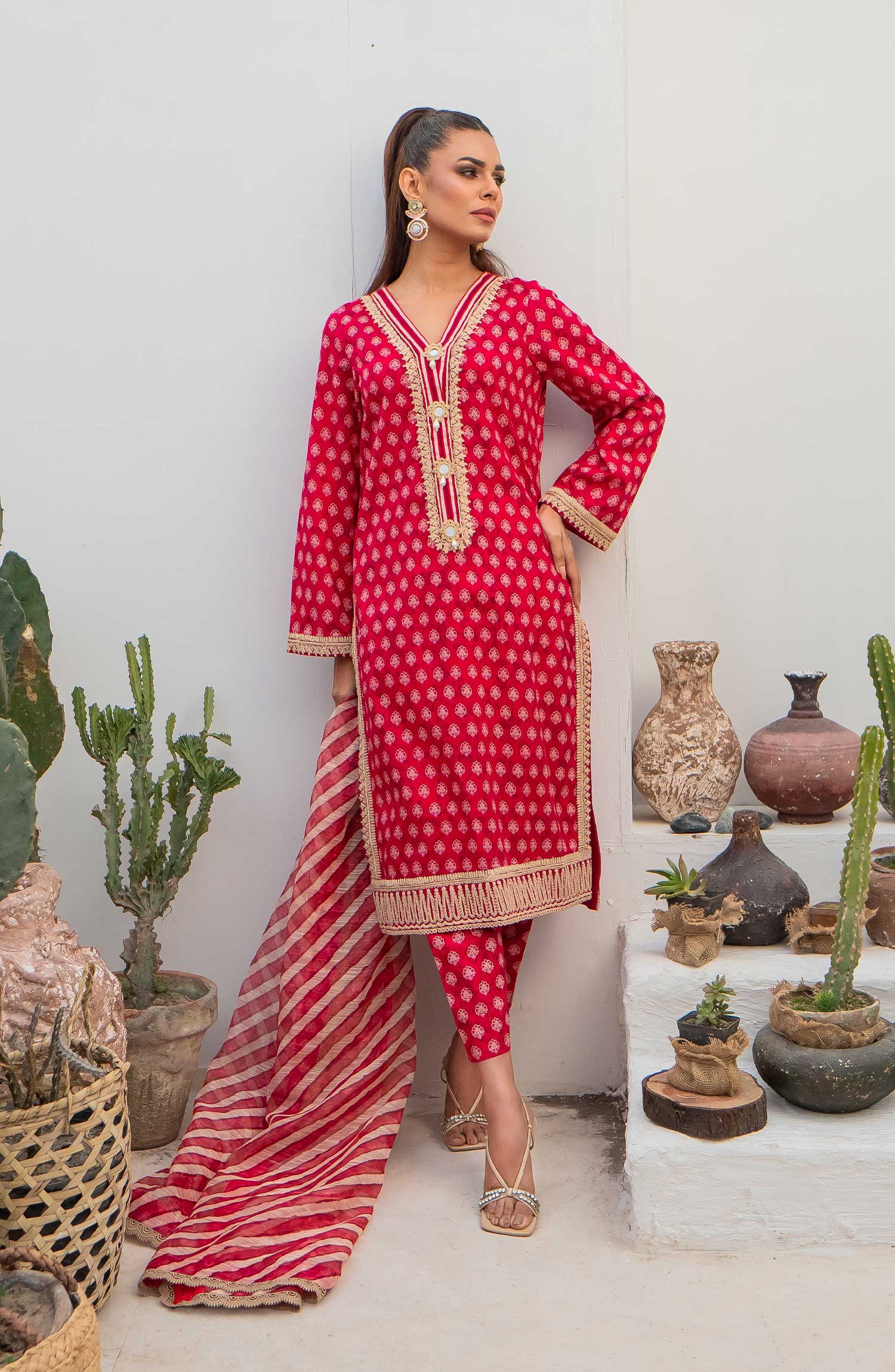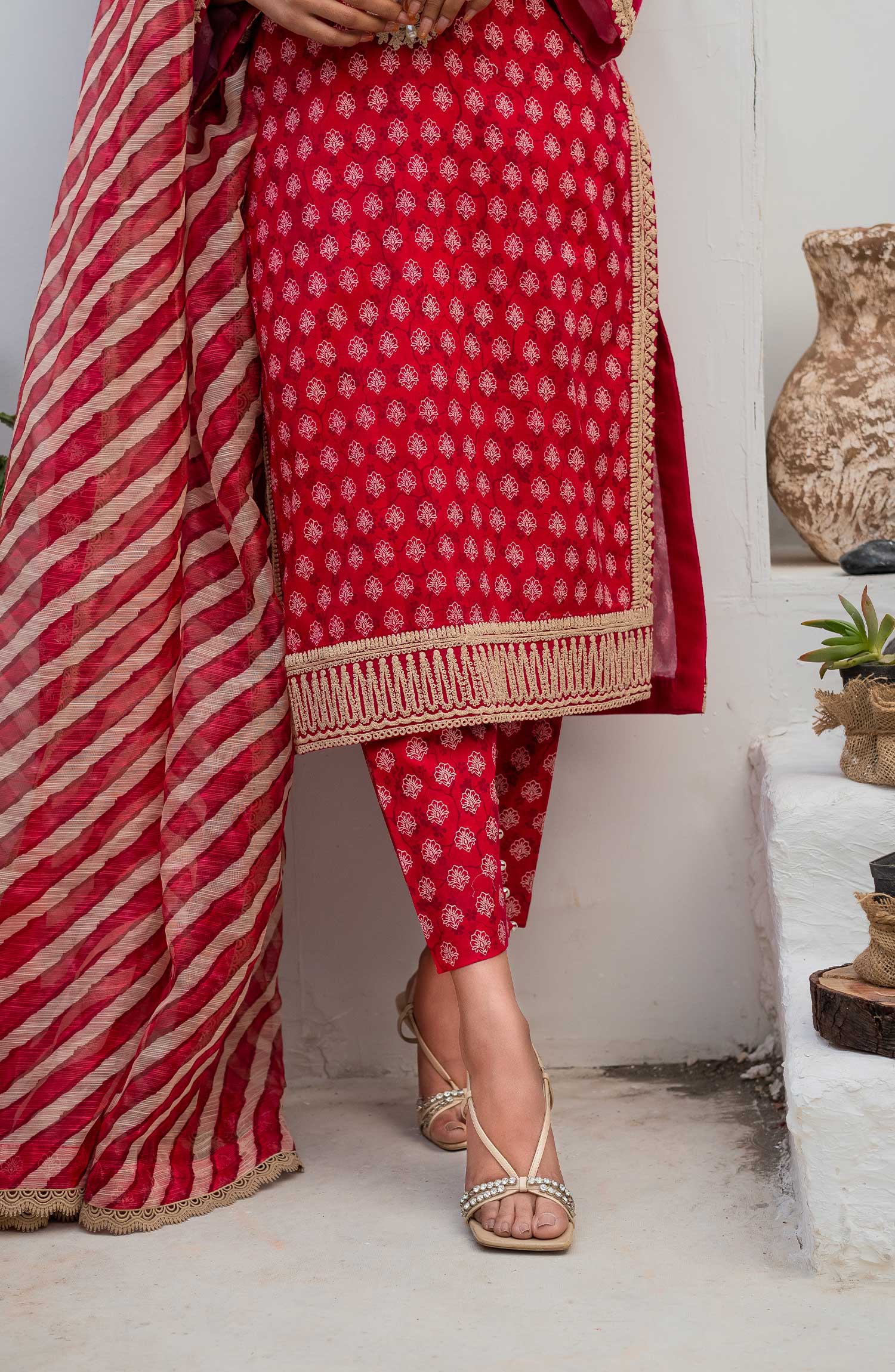 The standard style comes as a long-sleeved kameez with dupatta and trouser/shawlar.