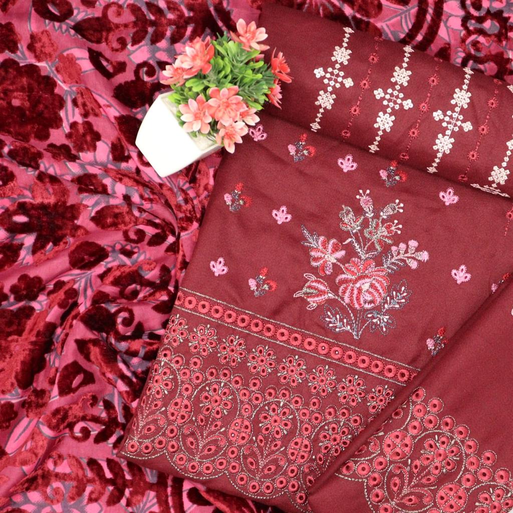 Unstiched Embroidered Dhanak suit with Velvet Dupatta