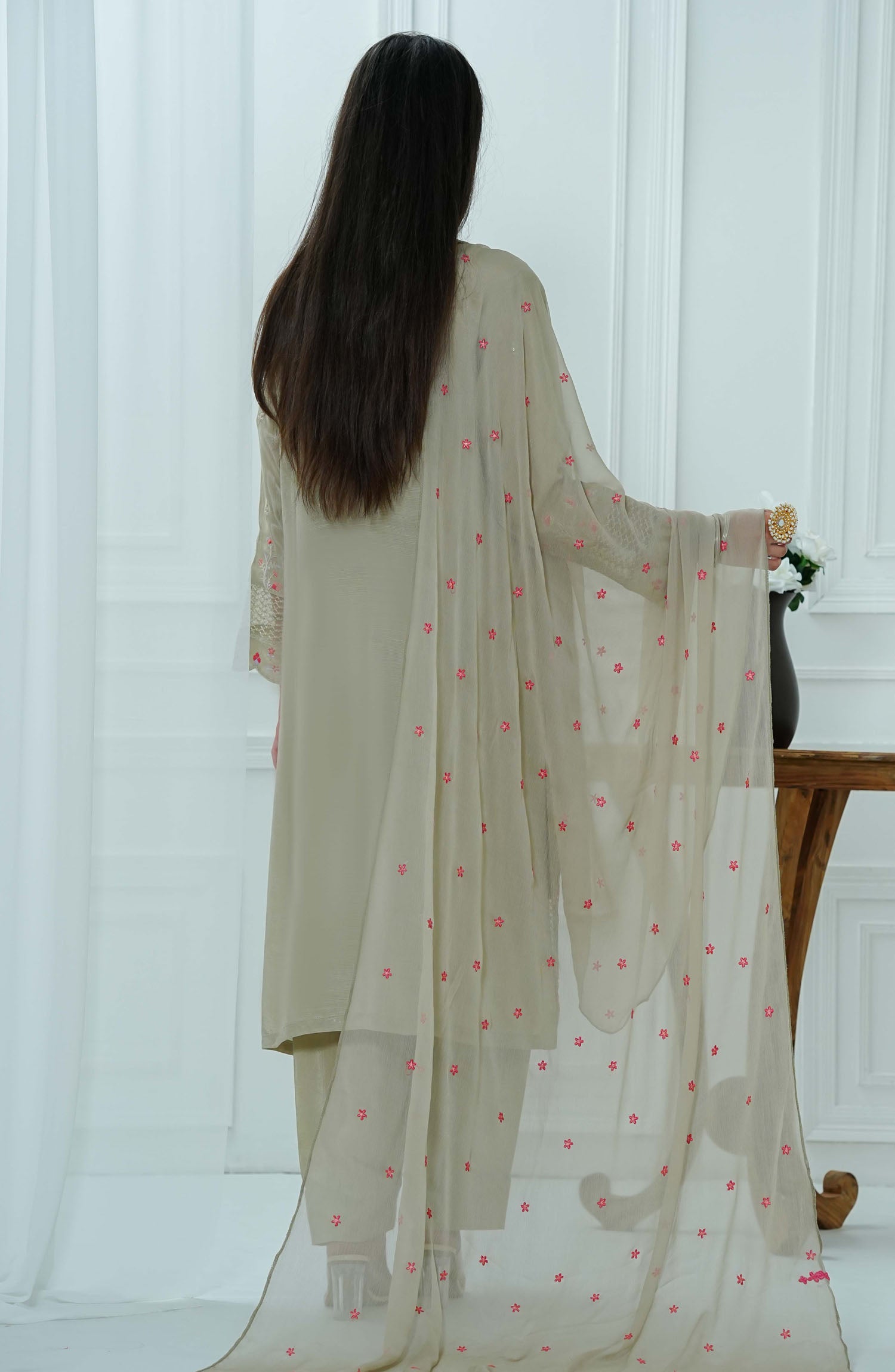 The standard style comes as a long-sleeved kameez with dupatta and trouser/shawlar.