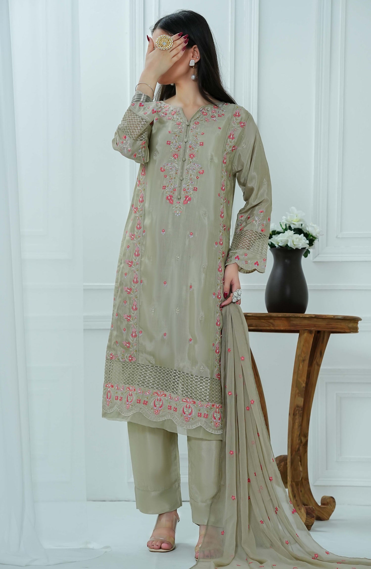 Home Meet Malina by Amna Khadija Embroidered Raw Silk Stitched 3 Piece Suit - MM-01 - AM25MM - Green - Formal Collection