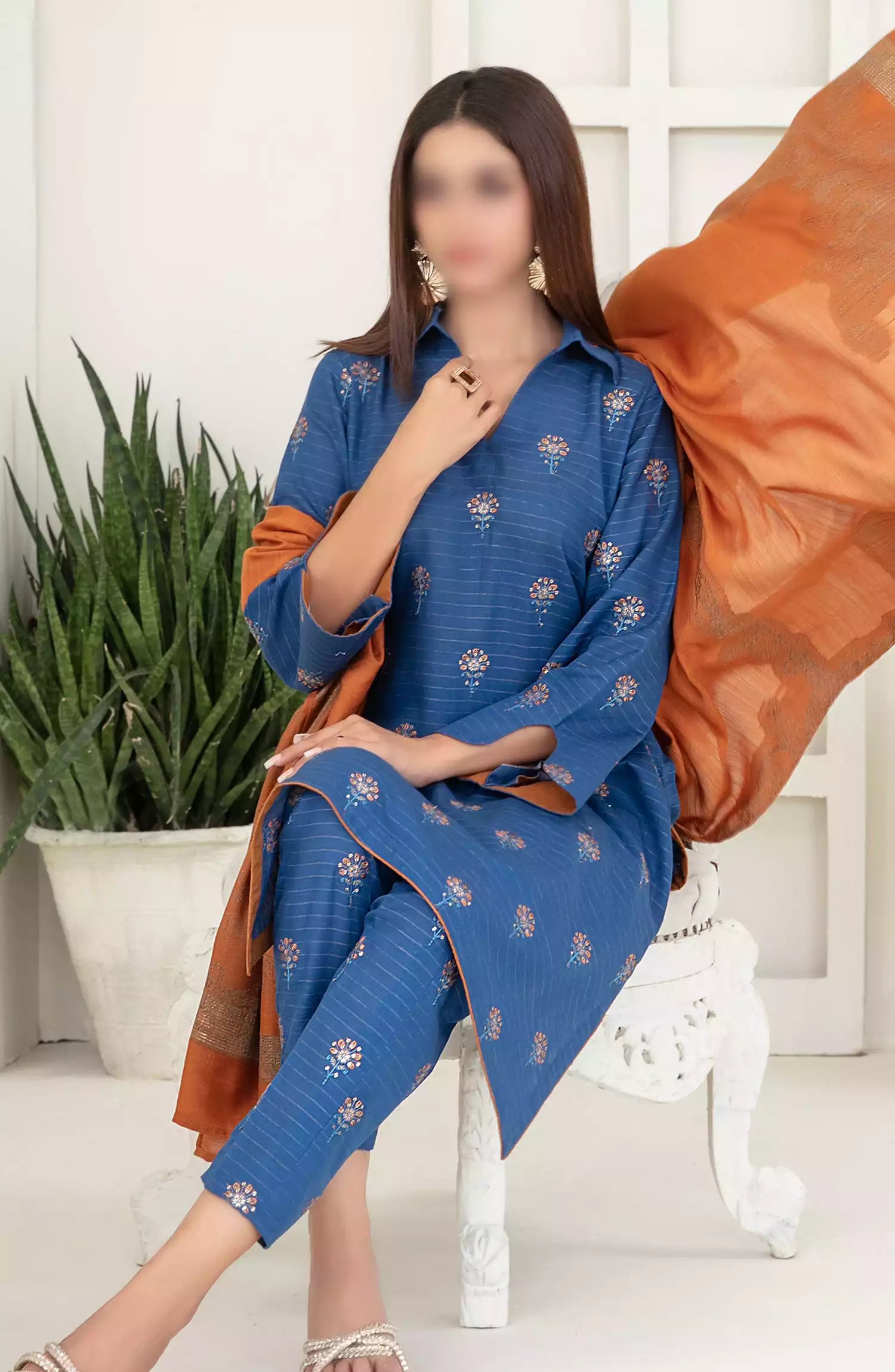 MEGARA - Fancy Stitched Embroidered Zari Khaddar Collection 2024 has been styled in the image for photography and illustrative purposes.