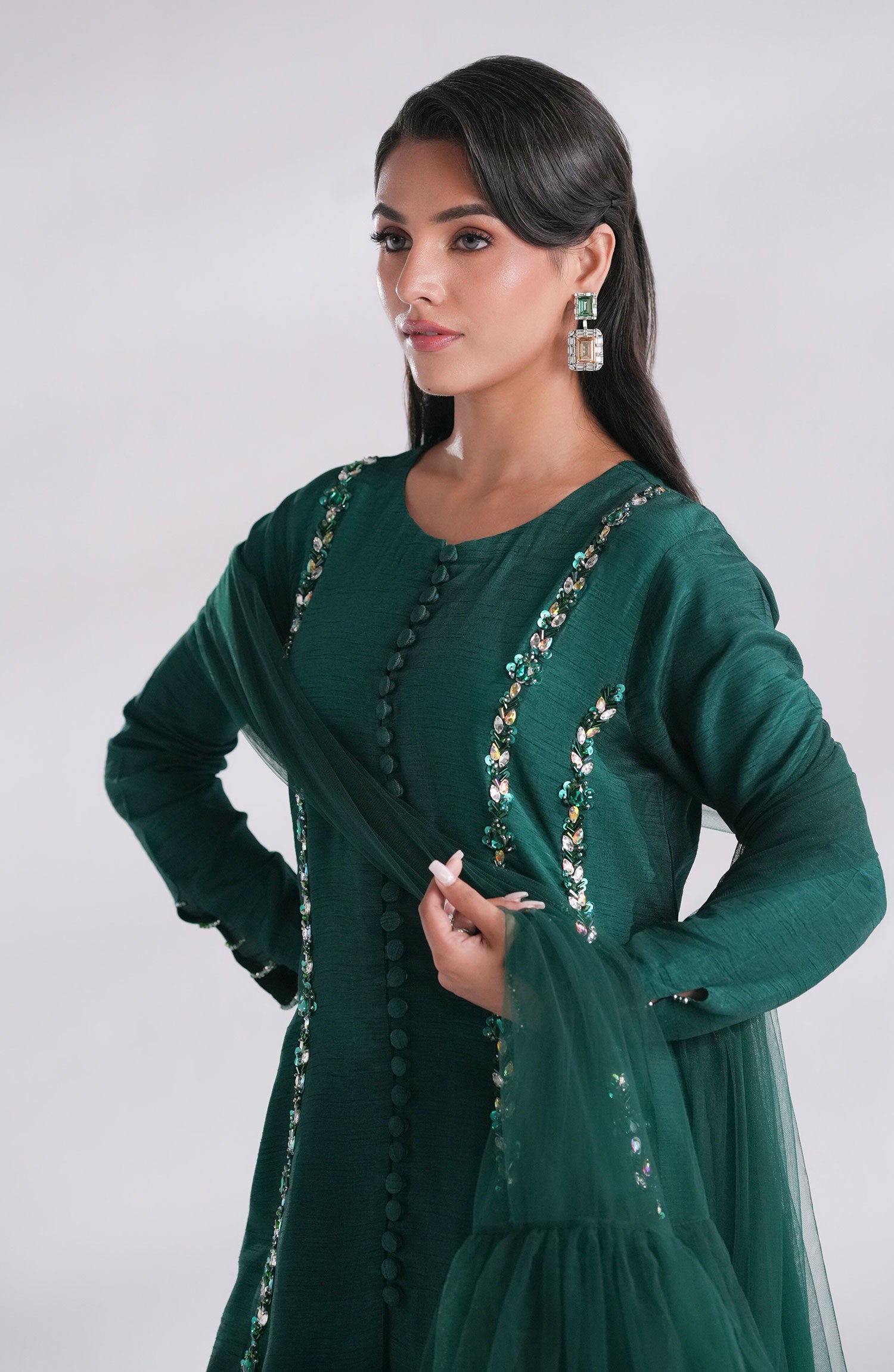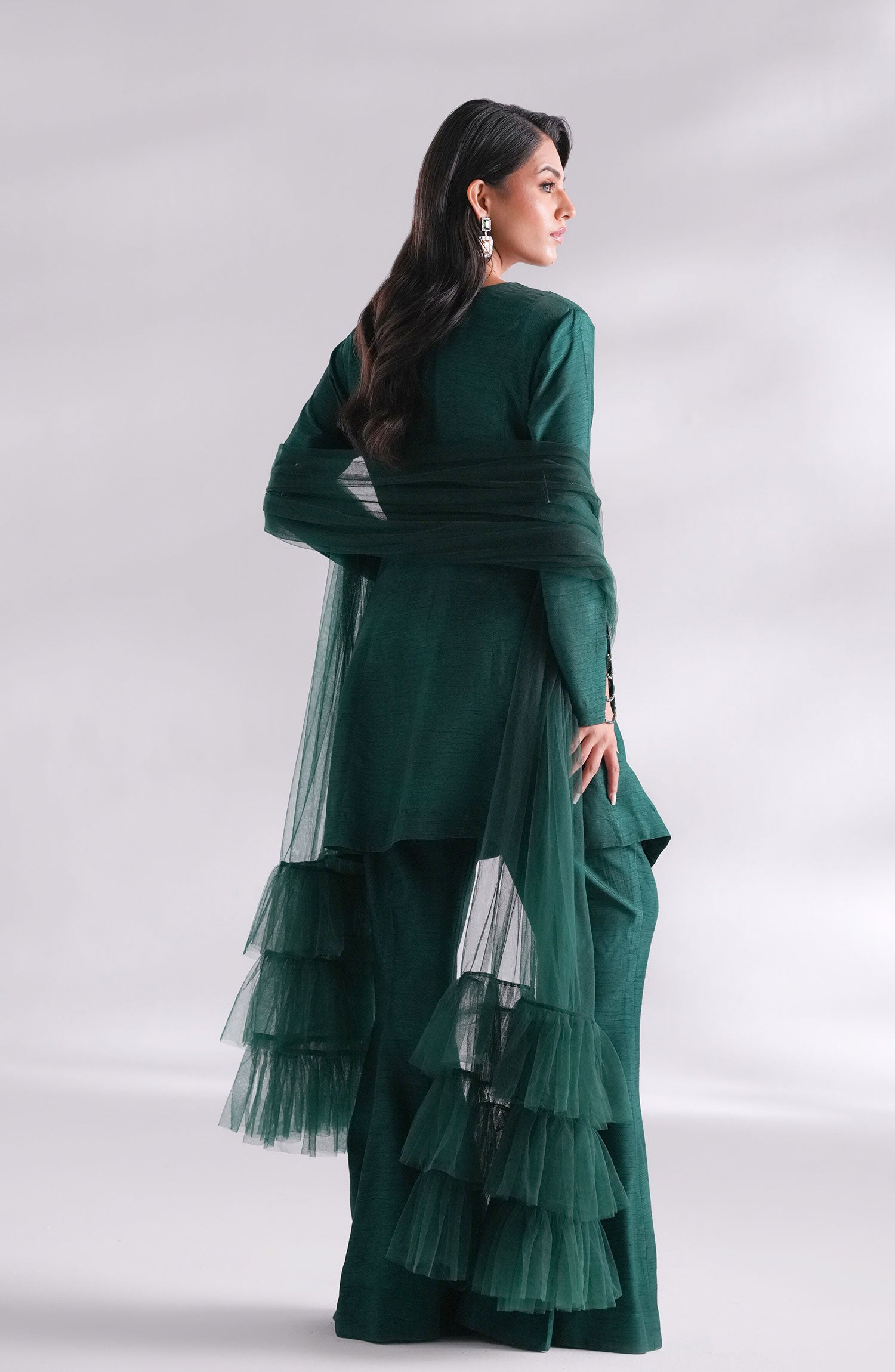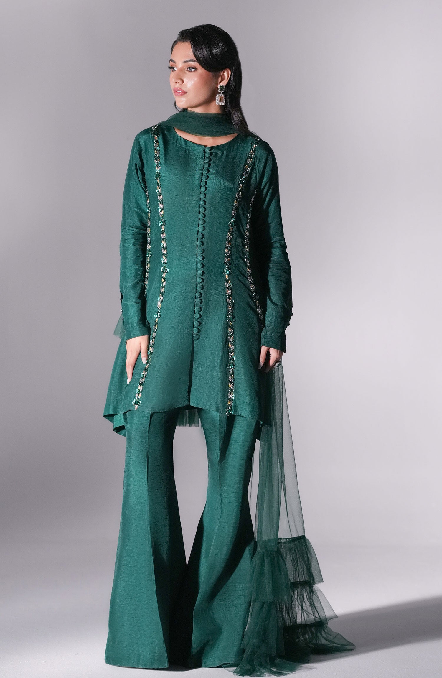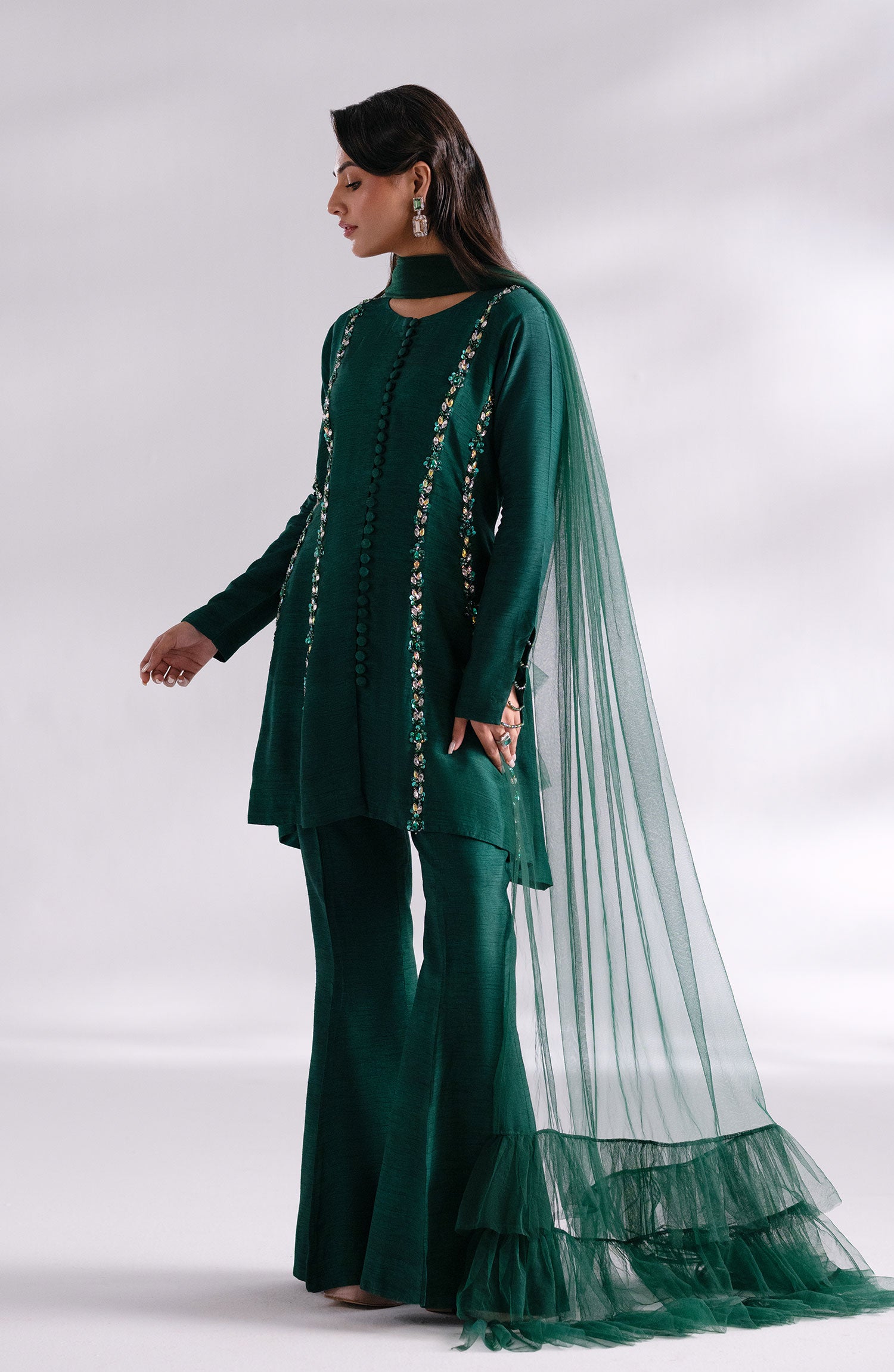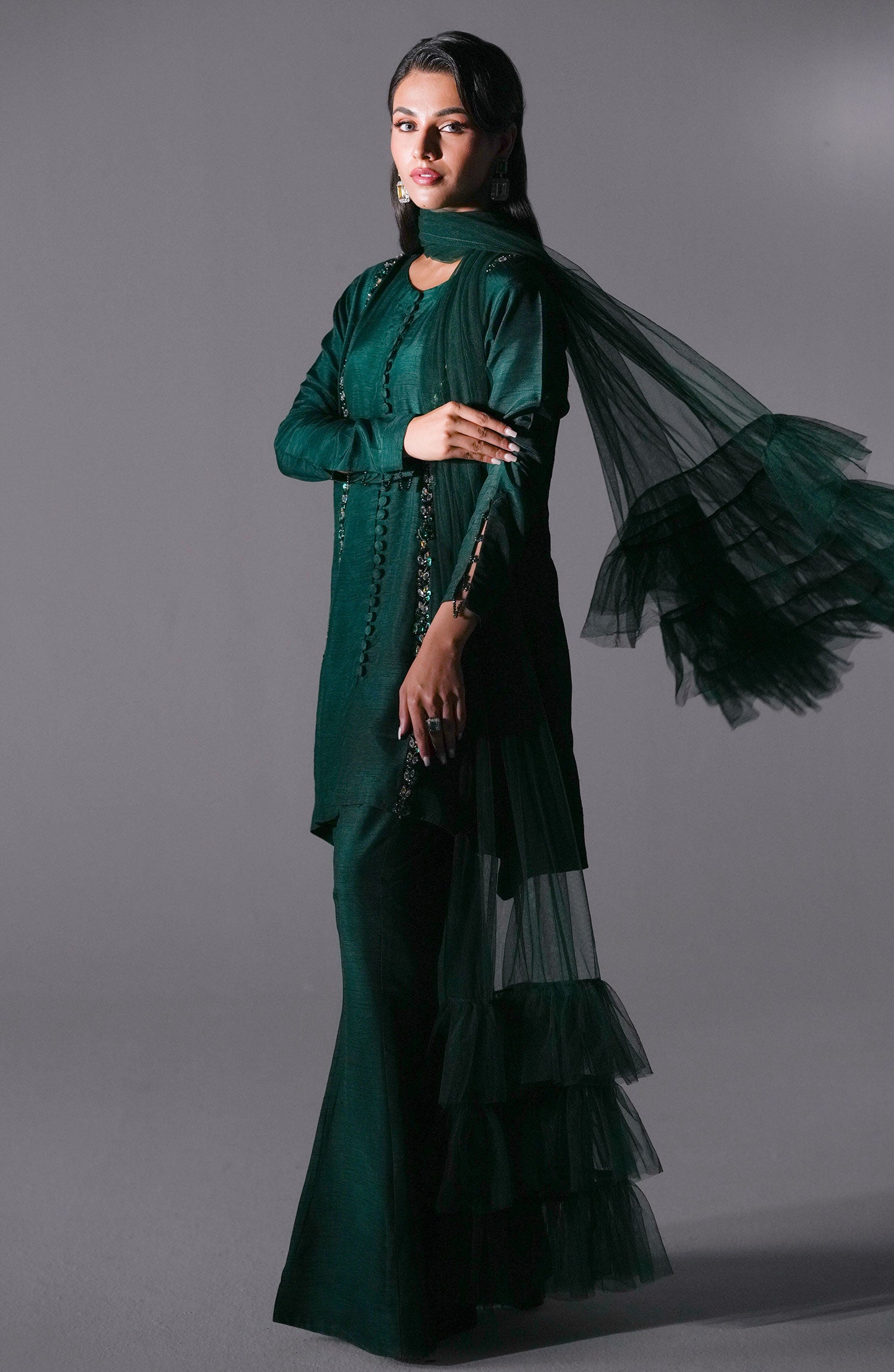 The 'Jade' formal dress is a captivating piece dyed in the trending emerald green color, crafted from luxurious Korean raw silk. This short peplum is adorned with exquisite handwork, including Emerald stones, crystals, and Swarovski on every panel. The crystal string detailing on the sleeves adds a statement touch, enhancing its refined elegance. Paired with a net ruffled dupatta and sleek bootcut pants, 'Jade' offers a modern and sharp look, combining contemporary sophistication with timeless charm.