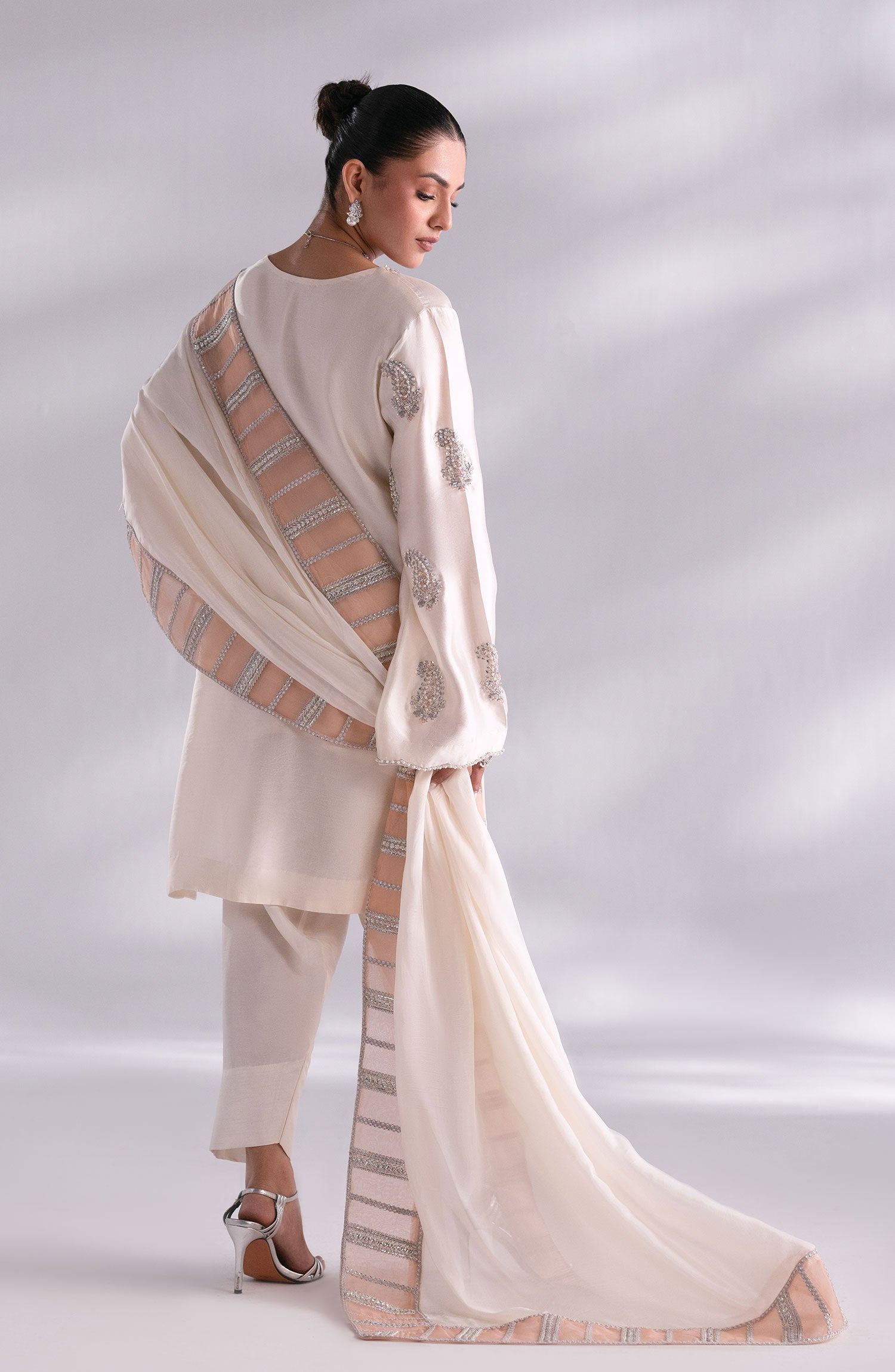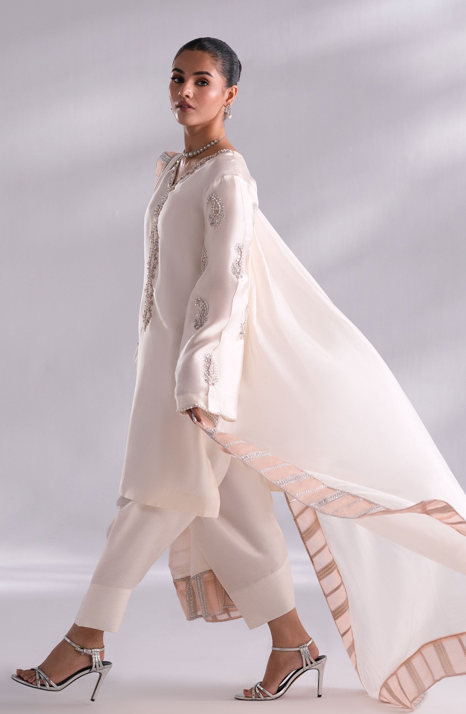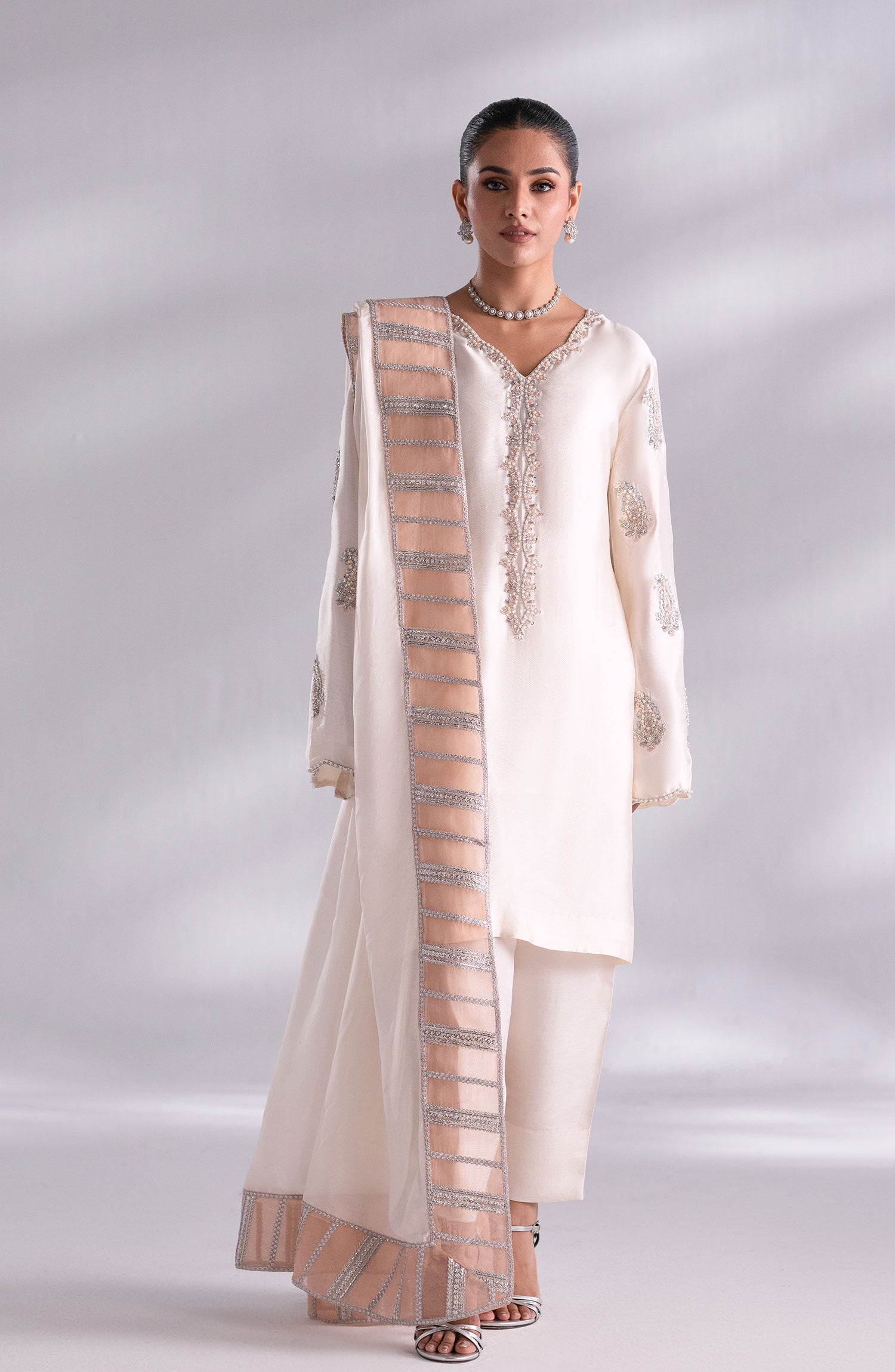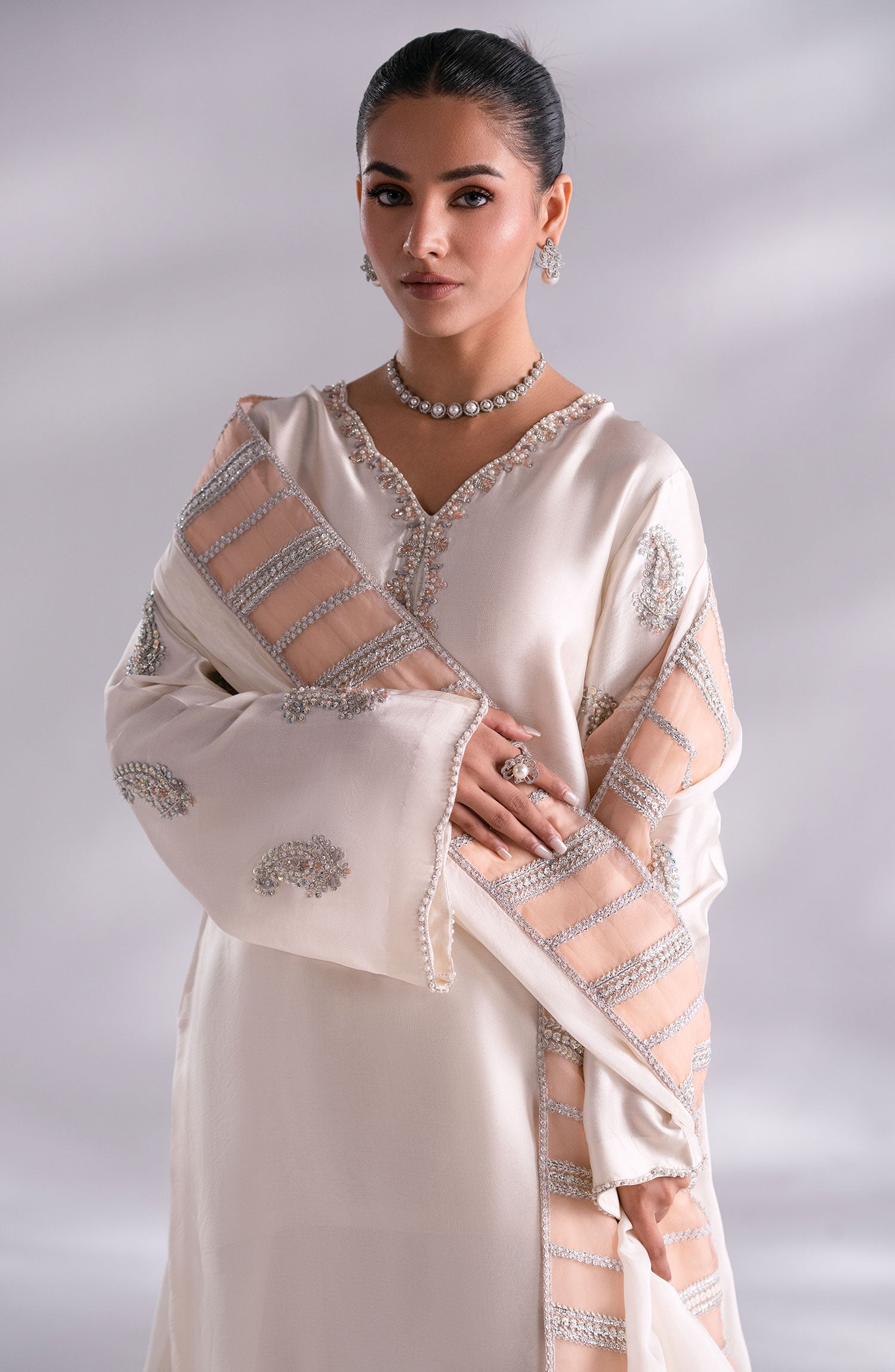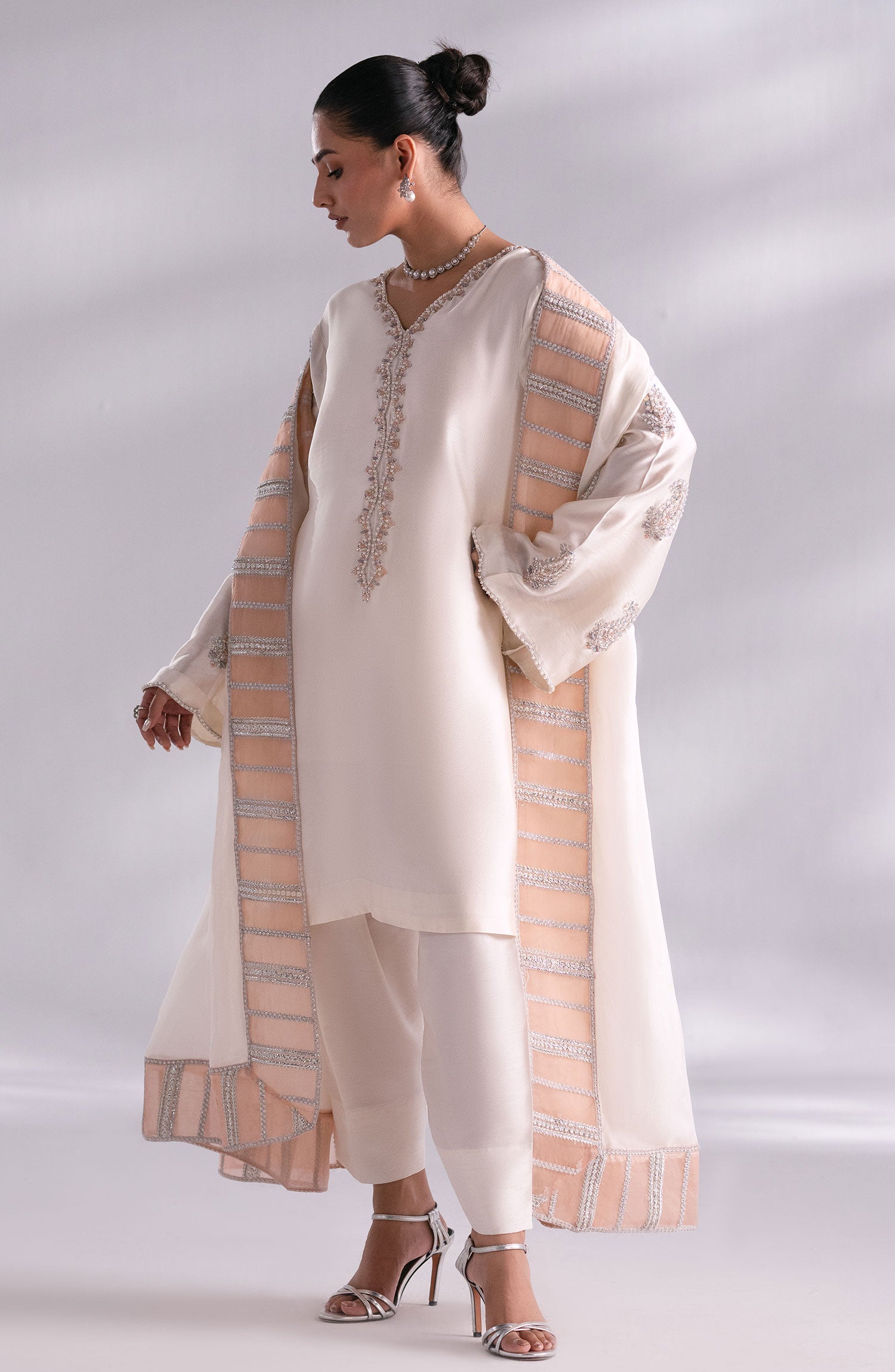 Featuring 'Opal' an elegant formal outfit, made from pure sheesha silk in a soft off-white color. The shirt is subtly adorned with delicate handwork on the neckline and sleeves, incorporating pearls, stones, crystals, and dabka, adding an understated touch of sophistication. It is paired with a silk dupatta, beautifully embroidered with a contrasting peach-colored border, enhancing its graceful appeal. Completing the look, the outfit is paired with a loose shalwar, offering a traditional touch to this refined and timeless ensemble.