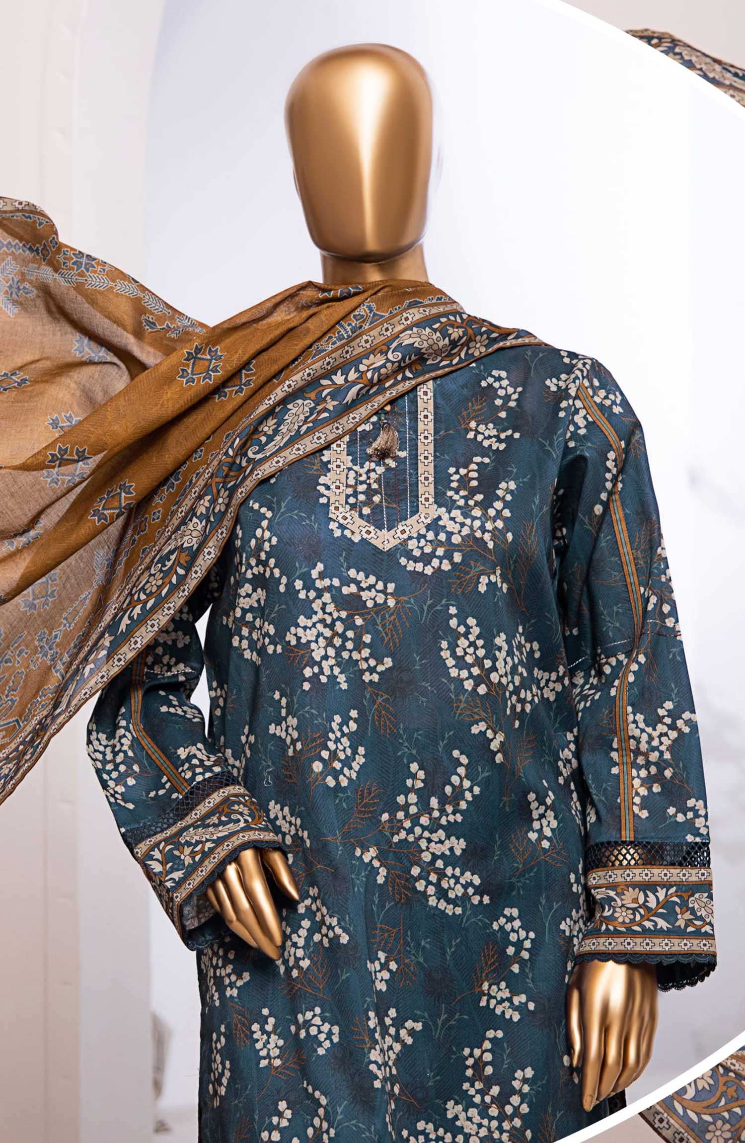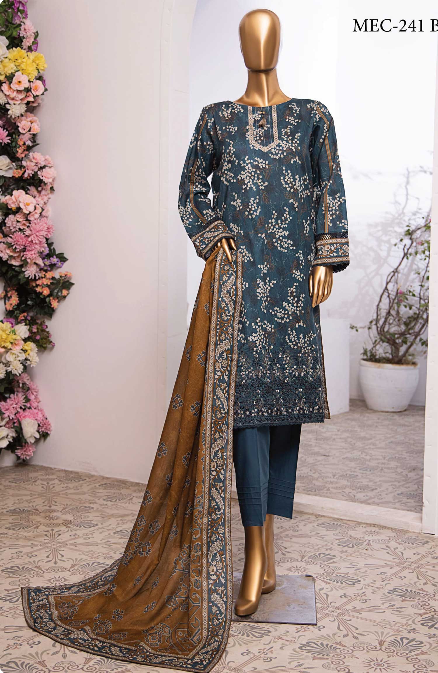 MEHEK Embroidered Unstitched Lawn Collection Vol-01 has been styled in the image for photography and illustrative purposes.
