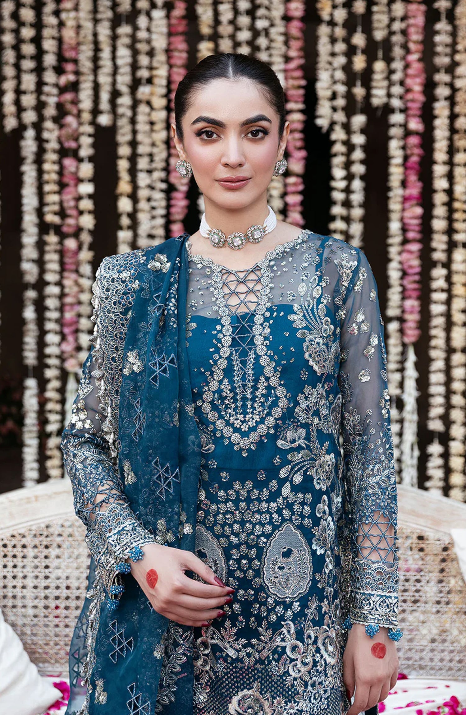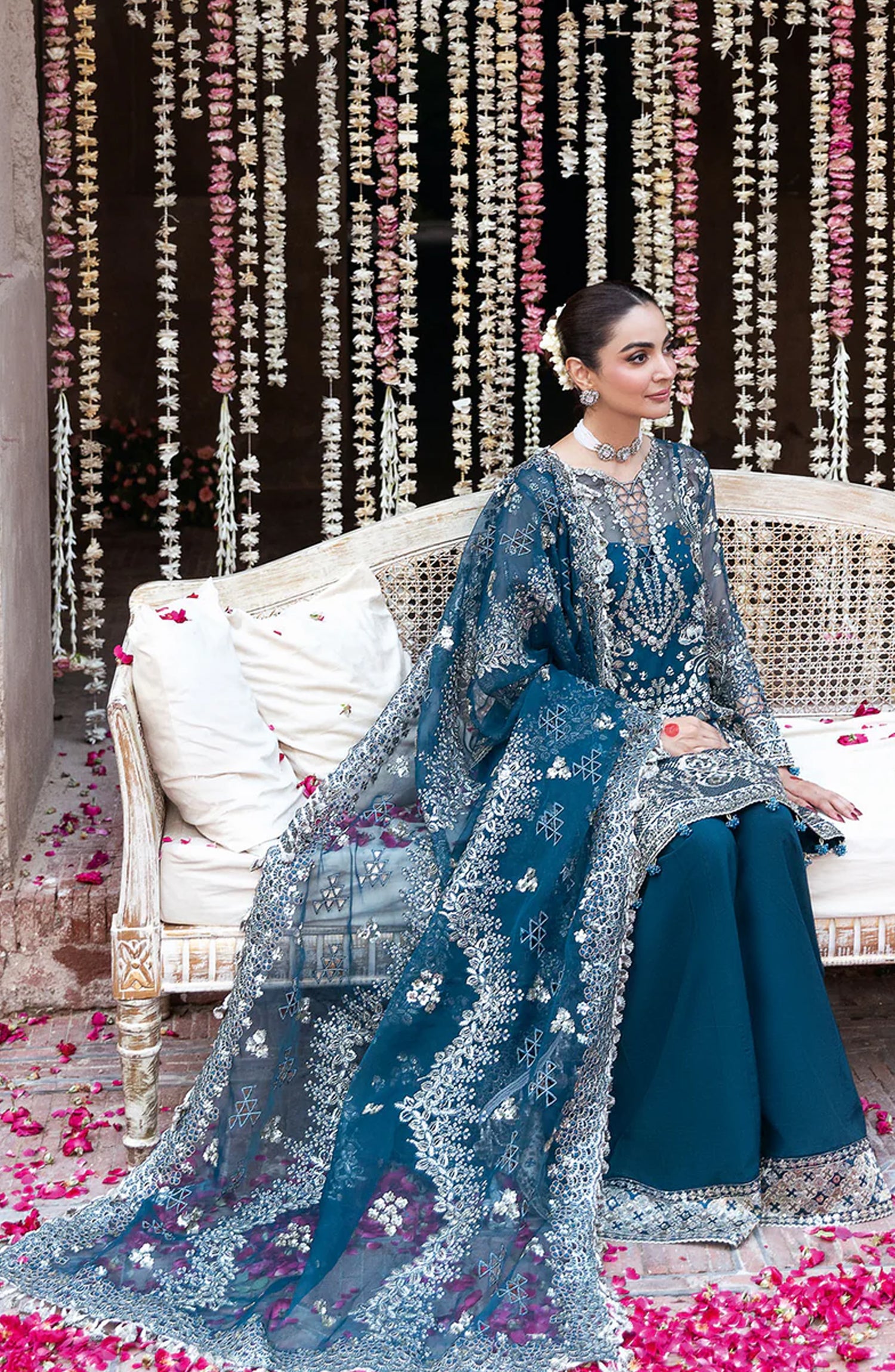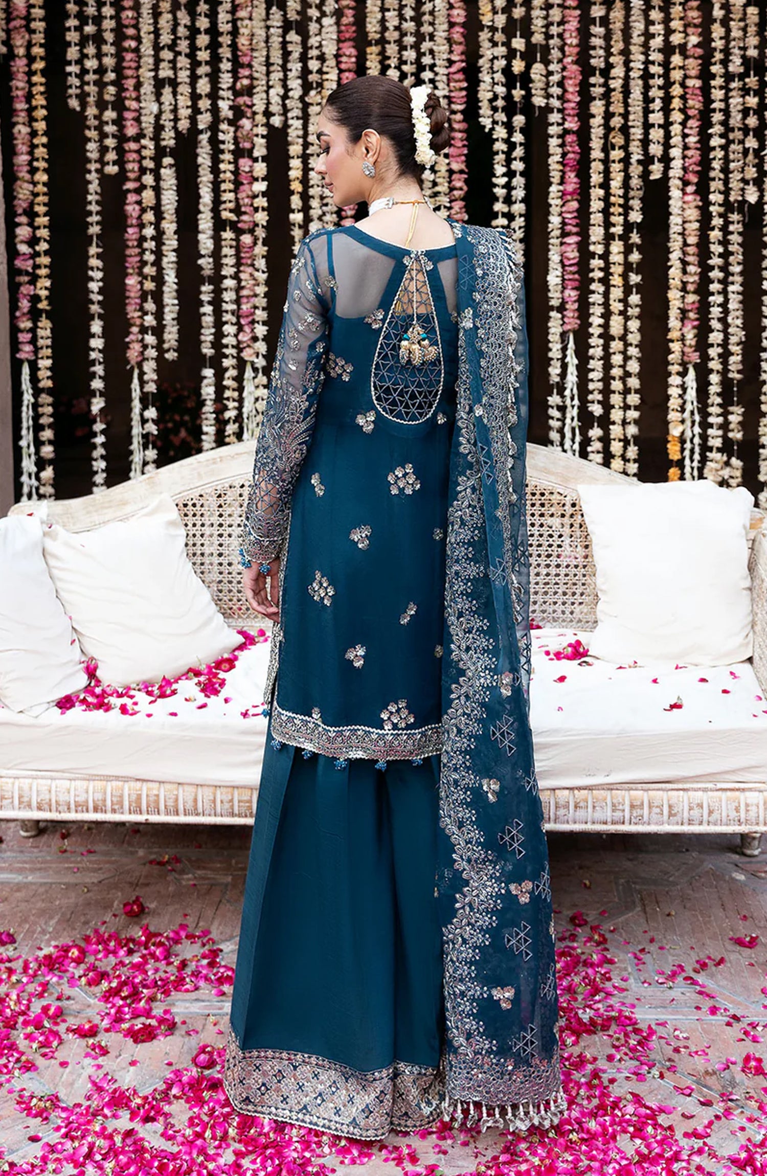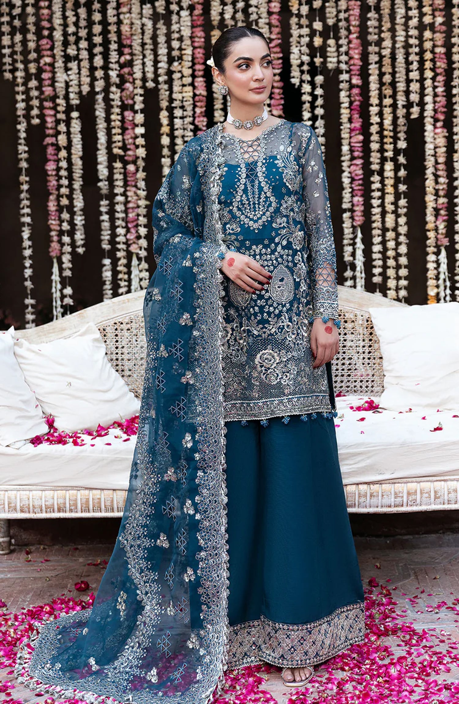 A masterpiece of timeless couture, this zinc ensemble radiates elegance and luxury.. The short kameez is adorned with intricate embroidery, featuring a rich blend of dabka, Resham, and sequins that create exquisite floral motifs. The sheer sleeves add a touch of modern elegance while maintaining its regal allure. Paired with wide-leg trousers in a matching hue and a beautifully embellished dupatta featuring heavy borders and delicate detailing, this outfit is perfect for wedding festivities and formal soirées.