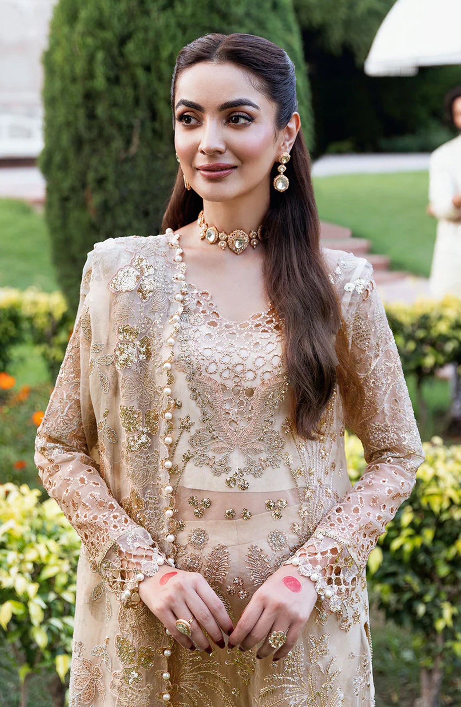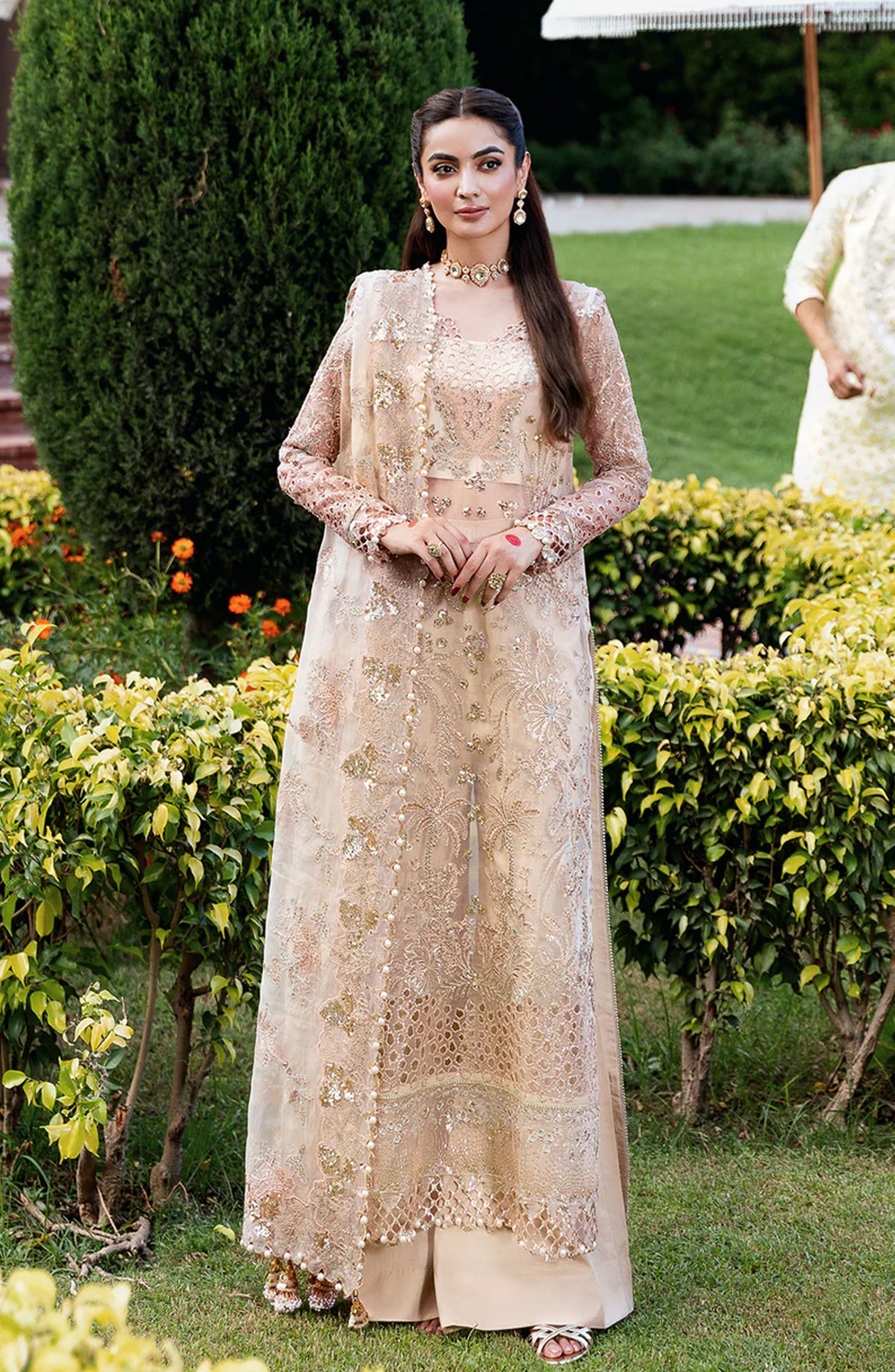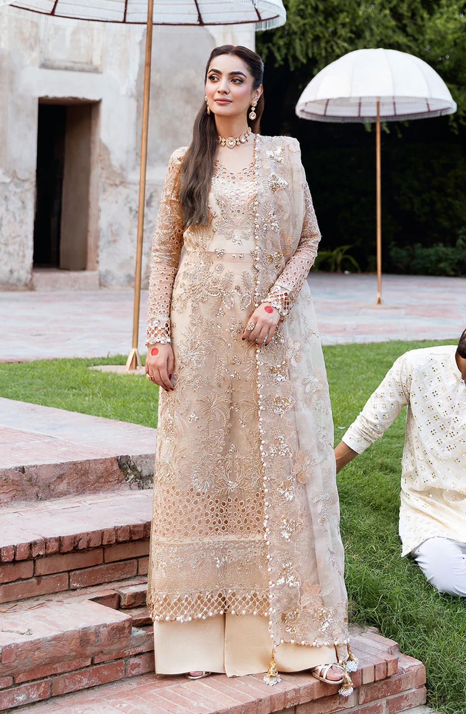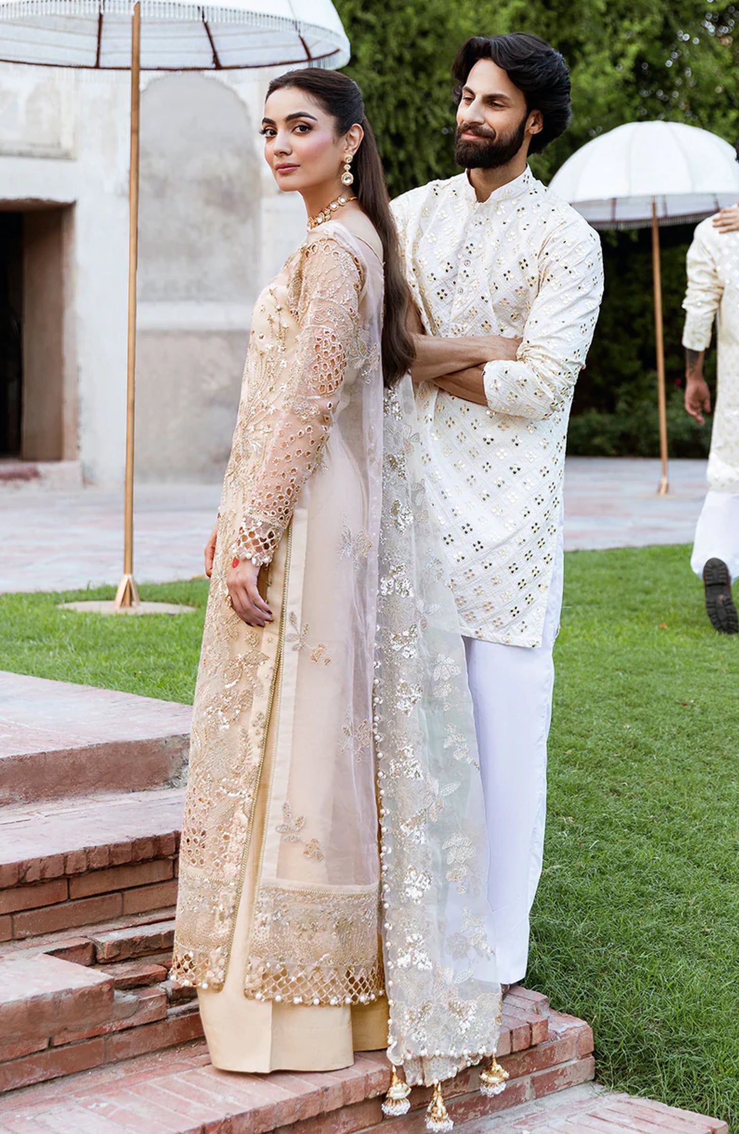 Step into understated luxury with this soft champagne-toned ensemble, exuding timeless elegance and modern refinement. The long straight shirt is delicately handcrafted with exquisite Resham and sequin embellishments, arranged in intricate floral vines and symmetrical motifs that highlight artisanal craftsmanship. The sheer organza sleeves, adorned with delicate embroidery, add grace and femininity to the silhouette. The look is completed with matching straight trousers for a clean, sophisticated finish and a coordinating organza dupatta featuring delicate scalloped edges, fine embroidery, and shimmering accents, making this outfit a perfect choice for weddings, receptions, or festive occasions.